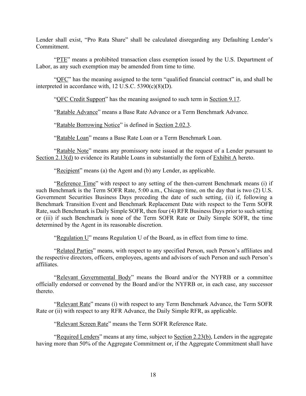 18 Lender shall exist, “Pro Rata Share” shall be calculated disregarding any Defaulting Lender’s Commitment. “PTE” means a prohibited transaction class exemption issued by the U.S. Department of Labor, as any such exemption may be amended from time to time. “QFC” has the meaning assigned to the term “qualified financial contract” in, and shall be interpreted in accordance with, 12 U.S.C. 5390(c)(8)(D). “QFC Credit Support” has the meaning assigned to such term in Section 9.17. “Ratable Advance” means a Base Rate Advance or a Term Benchmark Advance. “Ratable Borrowing Notice” is defined in Section 2.02.3. “Ratable Loan” means a Base Rate Loan or a Term Benchmark Loan. “Ratable Note” means any promissory note issued at the request of a Lender pursuant to Section 2.13(d) to evidence its Ratable Loans in substantially the form of Exhibit A hereto. “Recipient” means (a) the Agent and (b) any Lender, as applicable. “Reference Time” with respect to any setting of the then-current Benchmark means (i) if such Benchmark is the Term SOFR Rate, 5:00 a.m., Chicago time, on the day that is two (2) U.S. Government Securities Business Days preceding the date of such setting, (ii) if, following a Benchmark Transition Event and Benchmark Replacement Date with respect to the Term SOFR Rate, such Benchmark is Daily Simple SOFR, then four (4) RFR Business Days prior to such setting or (iii) if such Benchmark is none of the Term SOFR Rate or Daily Simple SOFR, the time determined by the Agent in its reasonable discretion. “Regulation U” means Regulation U of the Board, as in effect from time to time. “Related Parties” means, with respect to any specified Person, such Person’s affiliates and the respective directors, officers, employees, agents and advisors of such Person and such Person’s affiliates. “Relevant Governmental Body” means the Board and/or the NYFRB or a committee officially endorsed or convened by the Board and/or the NYFRB or, in each case, any successor thereto. “Relevant Rate” means (i) with respect to any Term Benchmark Advance, the Term SOFR Rate or (ii) with respect to any RFR Advance, the Daily Simple RFR, as applicable. “Relevant Screen Rate” means the Term SOFR Reference Rate. “Required Lenders” means at any time, subject to Section 2.23(b), Lenders in the aggregate having more than 50% of the Aggregate Commitment or, if the Aggregate Commitment shall have