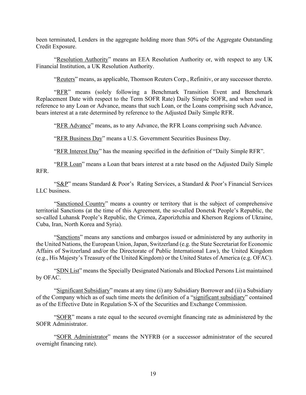 19 been terminated, Lenders in the aggregate holding more than 50% of the Aggregate Outstanding Credit Exposure. “Resolution Authority” means an EEA Resolution Authority or, with respect to any UK Financial Institution, a UK Resolution Authority. “Reuters” means, as applicable, Thomson Reuters Corp., Refinitiv, or any successor thereto. “RFR” means (solely following a Benchmark Transition Event and Benchmark Replacement Date with respect to the Term SOFR Rate) Daily Simple SOFR, and when used in reference to any Loan or Advance, means that such Loan, or the Loans comprising such Advance, bears interest at a rate determined by reference to the Adjusted Daily Simple RFR. “RFR Advance” means, as to any Advance, the RFR Loans comprising such Advance. “RFR Business Day” means a U.S. Government Securities Business Day. “RFR Interest Day” has the meaning specified in the definition of “Daily Simple RFR”. “RFR Loan” means a Loan that bears interest at a rate based on the Adjusted Daily Simple RFR. “S&P” means Standard & Poor’s Rating Services, a Standard & Poor’s Financial Services LLC business. “Sanctioned Country” means a country or territory that is the subject of comprehensive territorial Sanctions (at the time of this Agreement, the so-called Donetsk People’s Republic, the so-called Luhansk People’s Republic, the Crimea, Zaporizhzhia and Kherson Regions of Ukraine, Cuba, Iran, North Korea and Syria). “Sanctions” means any sanctions and embargos issued or administered by any authority in the United Nations, the European Union, Japan, Switzerland (e.g. the State Secretariat for Economic Affairs of Switzerland and/or the Directorate of Public International Law), the United Kingdom (e.g., His Majesty’s Treasury of the United Kingdom) or the United States of America (e.g. OFAC). “SDN List” means the Specially Designated Nationals and Blocked Persons List maintained by OFAC. “Significant Subsidiary” means at any time (i) any Subsidiary Borrower and (ii) a Subsidiary of the Company which as of such time meets the definition of a “significant subsidiary” contained as of the Effective Date in Regulation S-X of the Securities and Exchange Commission. “SOFR” means a rate equal to the secured overnight financing rate as administered by the SOFR Administrator. “SOFR Administrator” means the NYFRB (or a successor administrator of the secured overnight financing rate).
