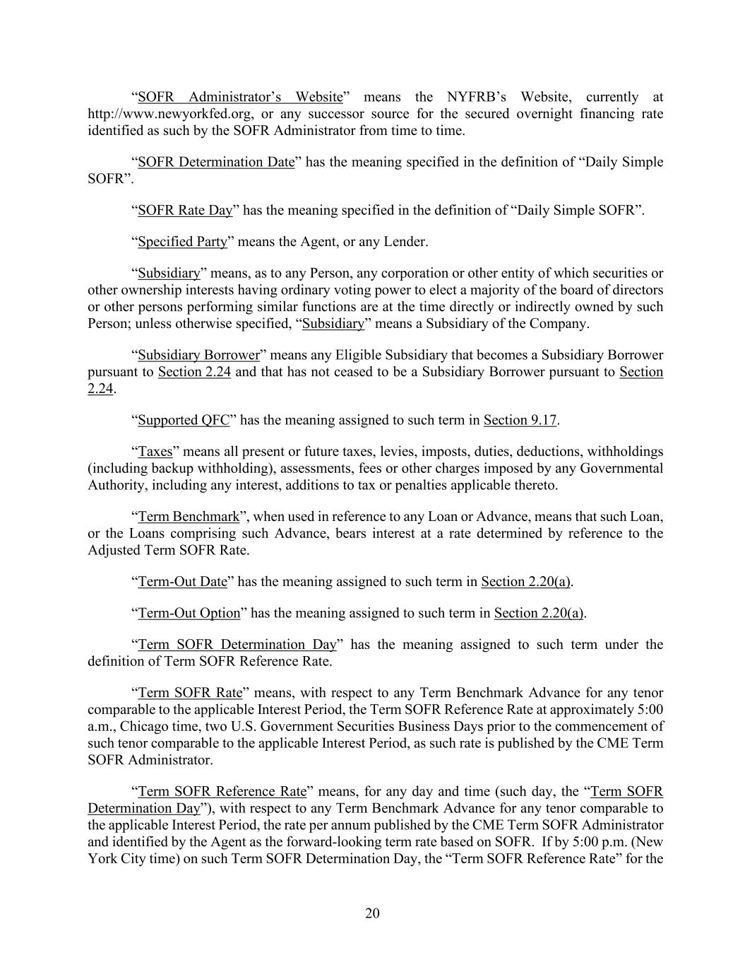 20 “SOFR Administrator’s Website” means the NYFRB’s Website, currently at http://www.newyorkfed.org, or any successor source for the secured overnight financing rate identified as such by the SOFR Administrator from time to time. “SOFR Determination Date” has the meaning specified in the definition of “Daily Simple SOFR”. “SOFR Rate Day” has the meaning specified in the definition of “Daily Simple SOFR”. “Specified Party” means the Agent, or any Lender. “Subsidiary” means, as to any Person, any corporation or other entity of which securities or other ownership interests having ordinary voting power to elect a majority of the board of directors or other persons performing similar functions are at the time directly or indirectly owned by such Person; unless otherwise specified, “Subsidiary” means a Subsidiary of the Company. “Subsidiary Borrower” means any Eligible Subsidiary that becomes a Subsidiary Borrower pursuant to Section 2.24 and that has not ceased to be a Subsidiary Borrower pursuant to Section 2.24. “Supported QFC” has the meaning assigned to such term in Section 9.17. “Taxes” means all present or future taxes, levies, imposts, duties, deductions, withholdings (including backup withholding), assessments, fees or other charges imposed by any Governmental Authority, including any interest, additions to tax or penalties applicable thereto. “Term Benchmark”, when used in reference to any Loan or Advance, means that such Loan, or the Loans comprising such Advance, bears interest at a rate determined by reference to the Adjusted Term SOFR Rate. “Term-Out Date” has the meaning assigned to such term in Section 2.20(a). “Term-Out Option” has the meaning assigned to such term in Section 2.20(a). “Term SOFR Determination Day” has the meaning assigned to such term under the definition of Term SOFR Reference Rate. “Term SOFR Rate” means, with respect to any Term Benchmark Advance for any tenor comparable to the applicable Interest Period, the Term SOFR Reference Rate at approximately 5:00 a.m., Chicago time, two U.S. Government Securities Business Days prior to the commencement of such tenor comparable to the applicable Interest Period, as such rate is published by the CME Term SOFR Administrator. “Term SOFR Reference Rate” means, for any day and time (such day, the “Term SOFR Determination Day”), with respect to any Term Benchmark Advance for any tenor comparable to the applicable Interest Period, the rate per annum published by the CME Term SOFR Administrator and identified by the Agent as the forward-looking term rate based on SOFR. If by 5:00 p.m. (New York City time) on such Term SOFR Determination Day, the “Term SOFR Reference Rate” for the