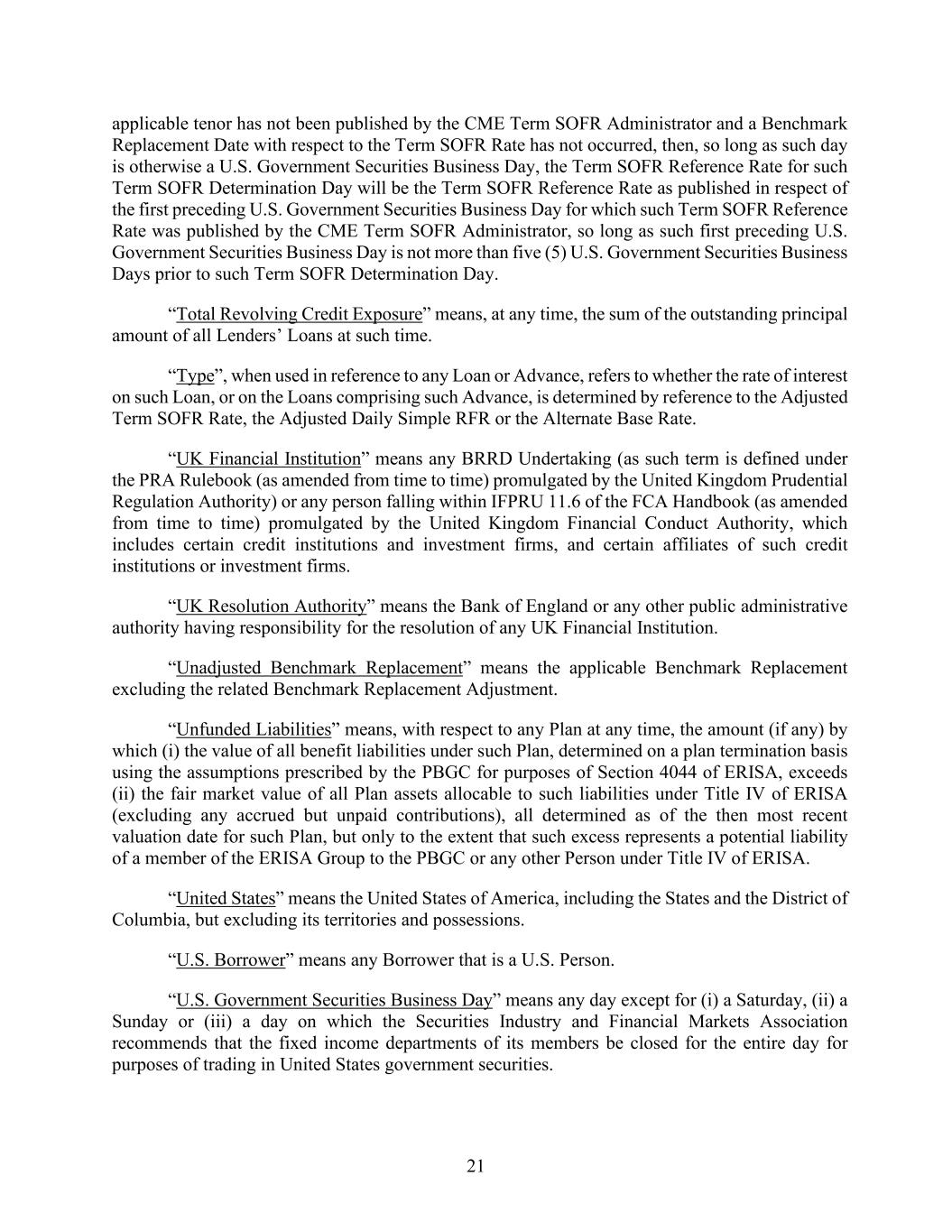 21 applicable tenor has not been published by the CME Term SOFR Administrator and a Benchmark Replacement Date with respect to the Term SOFR Rate has not occurred, then, so long as such day is otherwise a U.S. Government Securities Business Day, the Term SOFR Reference Rate for such Term SOFR Determination Day will be the Term SOFR Reference Rate as published in respect of the first preceding U.S. Government Securities Business Day for which such Term SOFR Reference Rate was published by the CME Term SOFR Administrator, so long as such first preceding U.S. Government Securities Business Day is not more than five (5) U.S. Government Securities Business Days prior to such Term SOFR Determination Day. “Total Revolving Credit Exposure” means, at any time, the sum of the outstanding principal amount of all Lenders’ Loans at such time. “Type”, when used in reference to any Loan or Advance, refers to whether the rate of interest on such Loan, or on the Loans comprising such Advance, is determined by reference to the Adjusted Term SOFR Rate, the Adjusted Daily Simple RFR or the Alternate Base Rate. “UK Financial Institution” means any BRRD Undertaking (as such term is defined under the PRA Rulebook (as amended from time to time) promulgated by the United Kingdom Prudential Regulation Authority) or any person falling within IFPRU 11.6 of the FCA Handbook (as amended from time to time) promulgated by the United Kingdom Financial Conduct Authority, which includes certain credit institutions and investment firms, and certain affiliates of such credit institutions or investment firms. “UK Resolution Authority” means the Bank of England or any other public administrative authority having responsibility for the resolution of any UK Financial Institution. “Unadjusted Benchmark Replacement” means the applicable Benchmark Replacement excluding the related Benchmark Replacement Adjustment. “Unfunded Liabilities” means, with respect to any Plan at any time, the amount (if any) by which (i) the value of all benefit liabilities under such Plan, determined on a plan termination basis using the assumptions prescribed by the PBGC for purposes of Section 4044 of ERISA, exceeds (ii) the fair market value of all Plan assets allocable to such liabilities under Title IV of ERISA (excluding any accrued but unpaid contributions), all determined as of the then most recent valuation date for such Plan, but only to the extent that such excess represents a potential liability of a member of the ERISA Group to the PBGC or any other Person under Title IV of ERISA. “United States” means the United States of America, including the States and the District of Columbia, but excluding its territories and possessions. “U.S. Borrower” means any Borrower that is a U.S. Person. “U.S. Government Securities Business Day” means any day except for (i) a Saturday, (ii) a Sunday or (iii) a day on which the Securities Industry and Financial Markets Association recommends that the fixed income departments of its members be closed for the entire day for purposes of trading in United States government securities.