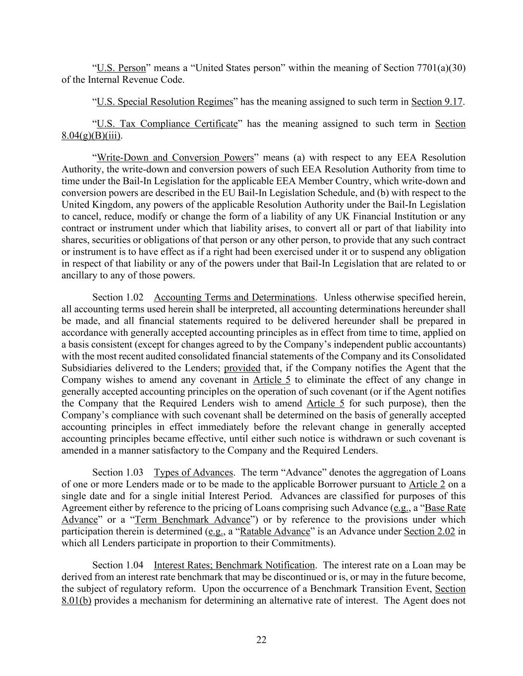 22 “U.S. Person” means a “United States person” within the meaning of Section 7701(a)(30) of the Internal Revenue Code. “U.S. Special Resolution Regimes” has the meaning assigned to such term in Section 9.17. “U.S. Tax Compliance Certificate” has the meaning assigned to such term in Section 8.04(g)(B)(iii). “Write-Down and Conversion Powers” means (a) with respect to any EEA Resolution Authority, the write-down and conversion powers of such EEA Resolution Authority from time to time under the Bail-In Legislation for the applicable EEA Member Country, which write-down and conversion powers are described in the EU Bail-In Legislation Schedule, and (b) with respect to the United Kingdom, any powers of the applicable Resolution Authority under the Bail-In Legislation to cancel, reduce, modify or change the form of a liability of any UK Financial Institution or any contract or instrument under which that liability arises, to convert all or part of that liability into shares, securities or obligations of that person or any other person, to provide that any such contract or instrument is to have effect as if a right had been exercised under it or to suspend any obligation in respect of that liability or any of the powers under that Bail-In Legislation that are related to or ancillary to any of those powers. Section 1.02 Accounting Terms and Determinations. Unless otherwise specified herein, all accounting terms used herein shall be interpreted, all accounting determinations hereunder shall be made, and all financial statements required to be delivered hereunder shall be prepared in accordance with generally accepted accounting principles as in effect from time to time, applied on a basis consistent (except for changes agreed to by the Company’s independent public accountants) with the most recent audited consolidated financial statements of the Company and its Consolidated Subsidiaries delivered to the Lenders; provided that, if the Company notifies the Agent that the Company wishes to amend any covenant in Article 5 to eliminate the effect of any change in generally accepted accounting principles on the operation of such covenant (or if the Agent notifies the Company that the Required Lenders wish to amend Article 5 for such purpose), then the Company’s compliance with such covenant shall be determined on the basis of generally accepted accounting principles in effect immediately before the relevant change in generally accepted accounting principles became effective, until either such notice is withdrawn or such covenant is amended in a manner satisfactory to the Company and the Required Lenders. Section 1.03 Types of Advances. The term “Advance” denotes the aggregation of Loans of one or more Lenders made or to be made to the applicable Borrower pursuant to Article 2 on a single date and for a single initial Interest Period. Advances are classified for purposes of this Agreement either by reference to the pricing of Loans comprising such Advance (e.g., a “Base Rate Advance” or a “Term Benchmark Advance”) or by reference to the provisions under which participation therein is determined (e.g., a “Ratable Advance” is an Advance under Section 2.02 in which all Lenders participate in proportion to their Commitments). Section 1.04 Interest Rates; Benchmark Notification. The interest rate on a Loan may be derived from an interest rate benchmark that may be discontinued or is, or may in the future become, the subject of regulatory reform. Upon the occurrence of a Benchmark Transition Event, Section 8.01(b) provides a mechanism for determining an alternative rate of interest. The Agent does not