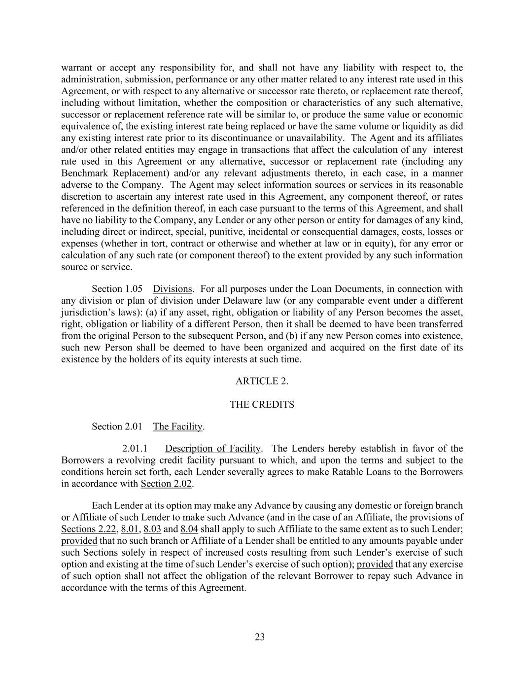23 warrant or accept any responsibility for, and shall not have any liability with respect to, the administration, submission, performance or any other matter related to any interest rate used in this Agreement, or with respect to any alternative or successor rate thereto, or replacement rate thereof, including without limitation, whether the composition or characteristics of any such alternative, successor or replacement reference rate will be similar to, or produce the same value or economic equivalence of, the existing interest rate being replaced or have the same volume or liquidity as did any existing interest rate prior to its discontinuance or unavailability. The Agent and its affiliates and/or other related entities may engage in transactions that affect the calculation of any interest rate used in this Agreement or any alternative, successor or replacement rate (including any Benchmark Replacement) and/or any relevant adjustments thereto, in each case, in a manner adverse to the Company. The Agent may select information sources or services in its reasonable discretion to ascertain any interest rate used in this Agreement, any component thereof, or rates referenced in the definition thereof, in each case pursuant to the terms of this Agreement, and shall have no liability to the Company, any Lender or any other person or entity for damages of any kind, including direct or indirect, special, punitive, incidental or consequential damages, costs, losses or expenses (whether in tort, contract or otherwise and whether at law or in equity), for any error or calculation of any such rate (or component thereof) to the extent provided by any such information source or service. Section 1.05 Divisions. For all purposes under the Loan Documents, in connection with any division or plan of division under Delaware law (or any comparable event under a different jurisdiction’s laws): (a) if any asset, right, obligation or liability of any Person becomes the asset, right, obligation or liability of a different Person, then it shall be deemed to have been transferred from the original Person to the subsequent Person, and (b) if any new Person comes into existence, such new Person shall be deemed to have been organized and acquired on the first date of its existence by the holders of its equity interests at such time. ARTICLE 2. THE CREDITS Section 2.01 The Facility. 2.01.1 Description of Facility. The Lenders hereby establish in favor of the Borrowers a revolving credit facility pursuant to which, and upon the terms and subject to the conditions herein set forth, each Lender severally agrees to make Ratable Loans to the Borrowers in accordance with Section 2.02. Each Lender at its option may make any Advance by causing any domestic or foreign branch or Affiliate of such Lender to make such Advance (and in the case of an Affiliate, the provisions of Sections 2.22, 8.01, 8.03 and 8.04 shall apply to such Affiliate to the same extent as to such Lender; provided that no such branch or Affiliate of a Lender shall be entitled to any amounts payable under such Sections solely in respect of increased costs resulting from such Lender’s exercise of such option and existing at the time of such Lender’s exercise of such option); provided that any exercise of such option shall not affect the obligation of the relevant Borrower to repay such Advance in accordance with the terms of this Agreement.
