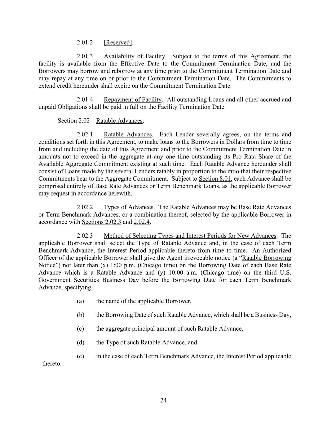 24 2.01.2 [Reserved]. 2.01.3 Availability of Facility. Subject to the terms of this Agreement, the facility is available from the Effective Date to the Commitment Termination Date, and the Borrowers may borrow and reborrow at any time prior to the Commitment Termination Date and may repay at any time on or prior to the Commitment Termination Date. The Commitments to extend credit hereunder shall expire on the Commitment Termination Date. 2.01.4 Repayment of Facility. All outstanding Loans and all other accrued and unpaid Obligations shall be paid in full on the Facility Termination Date. Section 2.02 Ratable Advances. 2.02.1 Ratable Advances. Each Lender severally agrees, on the terms and conditions set forth in this Agreement, to make loans to the Borrowers in Dollars from time to time from and including the date of this Agreement and prior to the Commitment Termination Date in amounts not to exceed in the aggregate at any one time outstanding its Pro Rata Share of the Available Aggregate Commitment existing at such time. Each Ratable Advance hereunder shall consist of Loans made by the several Lenders ratably in proportion to the ratio that their respective Commitments bear to the Aggregate Commitment. Subject to Section 8.01, each Advance shall be comprised entirely of Base Rate Advances or Term Benchmark Loans, as the applicable Borrower may request in accordance herewith. 2.02.2 Types of Advances. The Ratable Advances may be Base Rate Advances or Term Benchmark Advances, or a combination thereof, selected by the applicable Borrower in accordance with Sections 2.02.3 and 2.02.4. 2.02.3 Method of Selecting Types and Interest Periods for New Advances. The applicable Borrower shall select the Type of Ratable Advance and, in the case of each Term Benchmark Advance, the Interest Period applicable thereto from time to time. An Authorized Officer of the applicable Borrower shall give the Agent irrevocable notice (a “Ratable Borrowing Notice”) not later than (x) 1:00 p.m. (Chicago time) on the Borrowing Date of each Base Rate Advance which is a Ratable Advance and (y) 10:00 a.m. (Chicago time) on the third U.S. Government Securities Business Day before the Borrowing Date for each Term Benchmark Advance, specifying: (a) the name of the applicable Borrower, (b) the Borrowing Date of such Ratable Advance, which shall be a Business Day, (c) the aggregate principal amount of such Ratable Advance, (d) the Type of such Ratable Advance, and (e) in the case of each Term Benchmark Advance, the Interest Period applicable thereto.