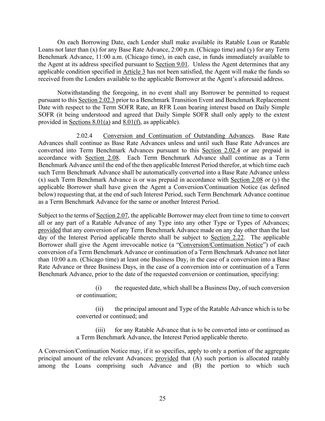 25 On each Borrowing Date, each Lender shall make available its Ratable Loan or Ratable Loans not later than (x) for any Base Rate Advance, 2:00 p.m. (Chicago time) and (y) for any Term Benchmark Advance, 11:00 a.m. (Chicago time), in each case, in funds immediately available to the Agent at its address specified pursuant to Section 9.01. Unless the Agent determines that any applicable condition specified in Article 3 has not been satisfied, the Agent will make the funds so received from the Lenders available to the applicable Borrower at the Agent’s aforesaid address. Notwithstanding the foregoing, in no event shall any Borrower be permitted to request pursuant to this Section 2.02.3 prior to a Benchmark Transition Event and Benchmark Replacement Date with respect to the Term SOFR Rate, an RFR Loan bearing interest based on Daily Simple SOFR (it being understood and agreed that Daily Simple SOFR shall only apply to the extent provided in Sections 8.01(a) and 8.01(f), as applicable). 2.02.4 Conversion and Continuation of Outstanding Advances. Base Rate Advances shall continue as Base Rate Advances unless and until such Base Rate Advances are converted into Term Benchmark Advances pursuant to this Section 2.02.4 or are prepaid in accordance with Section 2.08. Each Term Benchmark Advance shall continue as a Term Benchmark Advance until the end of the then applicable Interest Period therefor, at which time each such Term Benchmark Advance shall be automatically converted into a Base Rate Advance unless (x) such Term Benchmark Advance is or was prepaid in accordance with Section 2.08 or (y) the applicable Borrower shall have given the Agent a Conversion/Continuation Notice (as defined below) requesting that, at the end of such Interest Period, such Term Benchmark Advance continue as a Term Benchmark Advance for the same or another Interest Period. Subject to the terms of Section 2.07, the applicable Borrower may elect from time to time to convert all or any part of a Ratable Advance of any Type into any other Type or Types of Advances; provided that any conversion of any Term Benchmark Advance made on any day other than the last day of the Interest Period applicable thereto shall be subject to Section 2.22. The applicable Borrower shall give the Agent irrevocable notice (a “Conversion/Continuation Notice”) of each conversion of a Term Benchmark Advance or continuation of a Term Benchmark Advance not later than 10:00 a.m. (Chicago time) at least one Business Day, in the case of a conversion into a Base Rate Advance or three Business Days, in the case of a conversion into or continuation of a Term Benchmark Advance, prior to the date of the requested conversion or continuation, specifying: (i) the requested date, which shall be a Business Day, of such conversion or continuation; (ii) the principal amount and Type of the Ratable Advance which is to be converted or continued; and (iii) for any Ratable Advance that is to be converted into or continued as a Term Benchmark Advance, the Interest Period applicable thereto. A Conversion/Continuation Notice may, if it so specifies, apply to only a portion of the aggregate principal amount of the relevant Advances; provided that (A) such portion is allocated ratably among the Loans comprising such Advance and (B) the portion to which such