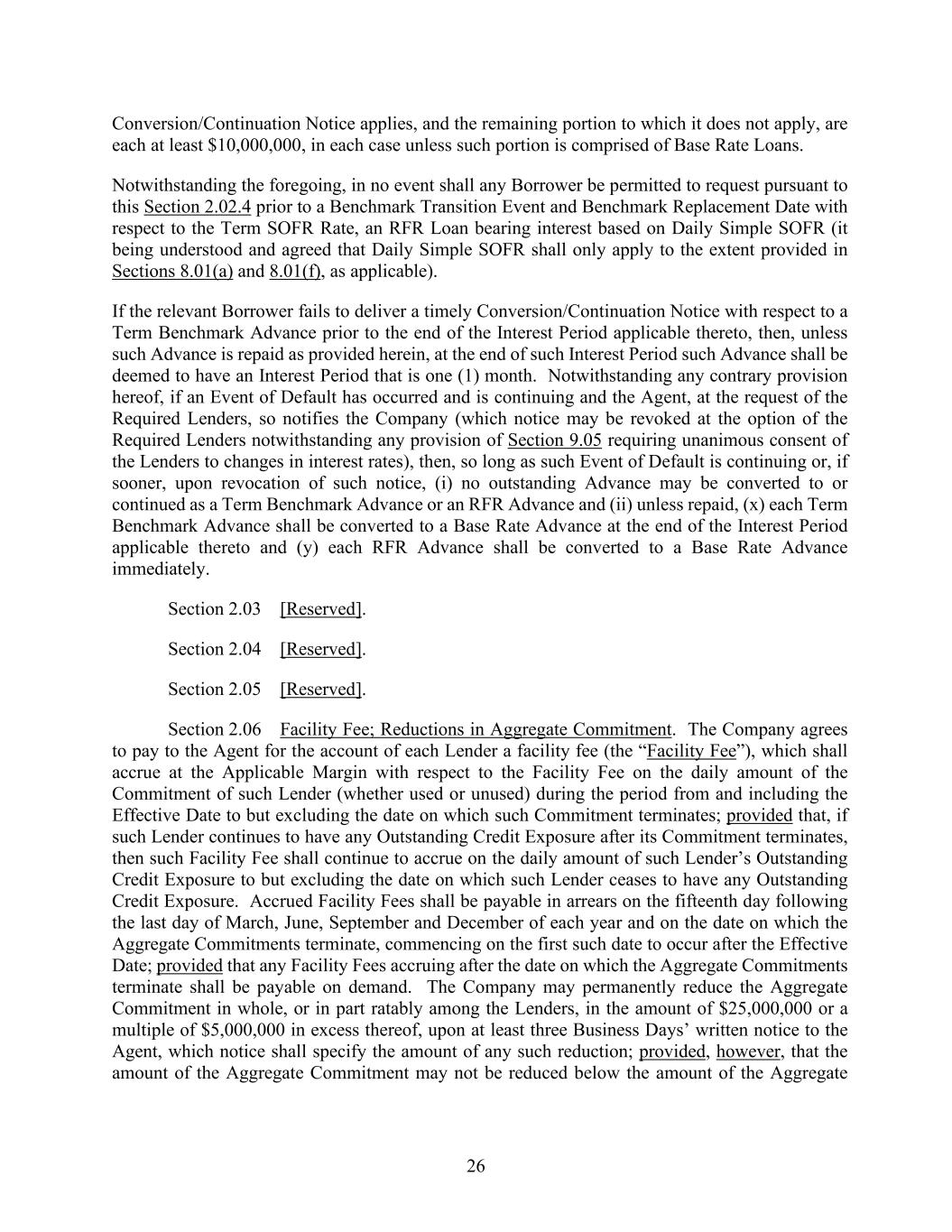 26 Conversion/Continuation Notice applies, and the remaining portion to which it does not apply, are each at least $10,000,000, in each case unless such portion is comprised of Base Rate Loans. Notwithstanding the foregoing, in no event shall any Borrower be permitted to request pursuant to this Section 2.02.4 prior to a Benchmark Transition Event and Benchmark Replacement Date with respect to the Term SOFR Rate, an RFR Loan bearing interest based on Daily Simple SOFR (it being understood and agreed that Daily Simple SOFR shall only apply to the extent provided in Sections 8.01(a) and 8.01(f), as applicable). If the relevant Borrower fails to deliver a timely Conversion/Continuation Notice with respect to a Term Benchmark Advance prior to the end of the Interest Period applicable thereto, then, unless such Advance is repaid as provided herein, at the end of such Interest Period such Advance shall be deemed to have an Interest Period that is one (1) month. Notwithstanding any contrary provision hereof, if an Event of Default has occurred and is continuing and the Agent, at the request of the Required Lenders, so notifies the Company (which notice may be revoked at the option of the Required Lenders notwithstanding any provision of Section 9.05 requiring unanimous consent of the Lenders to changes in interest rates), then, so long as such Event of Default is continuing or, if sooner, upon revocation of such notice, (i) no outstanding Advance may be converted to or continued as a Term Benchmark Advance or an RFR Advance and (ii) unless repaid, (x) each Term Benchmark Advance shall be converted to a Base Rate Advance at the end of the Interest Period applicable thereto and (y) each RFR Advance shall be converted to a Base Rate Advance immediately. Section 2.03 [Reserved]. Section 2.04 [Reserved]. Section 2.05 [Reserved]. Section 2.06 Facility Fee; Reductions in Aggregate Commitment. The Company agrees to pay to the Agent for the account of each Lender a facility fee (the “Facility Fee”), which shall accrue at the Applicable Margin with respect to the Facility Fee on the daily amount of the Commitment of such Lender (whether used or unused) during the period from and including the Effective Date to but excluding the date on which such Commitment terminates; provided that, if such Lender continues to have any Outstanding Credit Exposure after its Commitment terminates, then such Facility Fee shall continue to accrue on the daily amount of such Lender’s Outstanding Credit Exposure to but excluding the date on which such Lender ceases to have any Outstanding Credit Exposure. Accrued Facility Fees shall be payable in arrears on the fifteenth day following the last day of March, June, September and December of each year and on the date on which the Aggregate Commitments terminate, commencing on the first such date to occur after the Effective Date; provided that any Facility Fees accruing after the date on which the Aggregate Commitments terminate shall be payable on demand. The Company may permanently reduce the Aggregate Commitment in whole, or in part ratably among the Lenders, in the amount of $25,000,000 or a multiple of $5,000,000 in excess thereof, upon at least three Business Days’ written notice to the Agent, which notice shall specify the amount of any such reduction; provided, however, that the amount of the Aggregate Commitment may not be reduced below the amount of the Aggregate