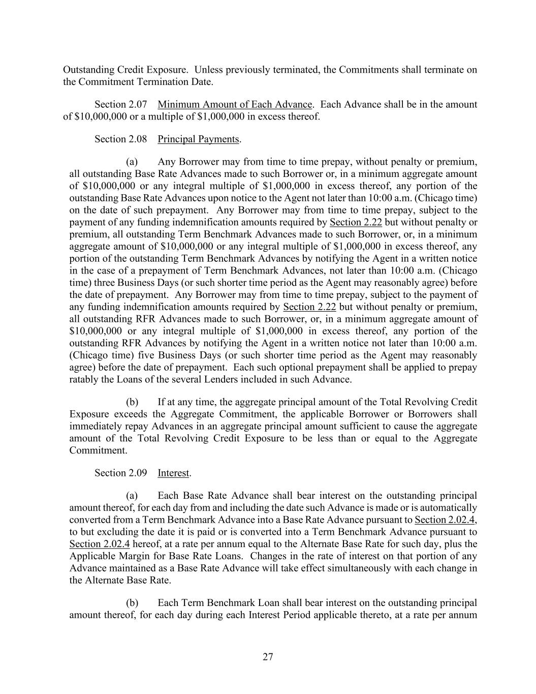 27 Outstanding Credit Exposure. Unless previously terminated, the Commitments shall terminate on the Commitment Termination Date. Section 2.07 Minimum Amount of Each Advance. Each Advance shall be in the amount of $10,000,000 or a multiple of $1,000,000 in excess thereof. Section 2.08 Principal Payments. (a) Any Borrower may from time to time prepay, without penalty or premium, all outstanding Base Rate Advances made to such Borrower or, in a minimum aggregate amount of $10,000,000 or any integral multiple of $1,000,000 in excess thereof, any portion of the outstanding Base Rate Advances upon notice to the Agent not later than 10:00 a.m. (Chicago time) on the date of such prepayment. Any Borrower may from time to time prepay, subject to the payment of any funding indemnification amounts required by Section 2.22 but without penalty or premium, all outstanding Term Benchmark Advances made to such Borrower, or, in a minimum aggregate amount of $10,000,000 or any integral multiple of $1,000,000 in excess thereof, any portion of the outstanding Term Benchmark Advances by notifying the Agent in a written notice in the case of a prepayment of Term Benchmark Advances, not later than 10:00 a.m. (Chicago time) three Business Days (or such shorter time period as the Agent may reasonably agree) before the date of prepayment. Any Borrower may from time to time prepay, subject to the payment of any funding indemnification amounts required by Section 2.22 but without penalty or premium, all outstanding RFR Advances made to such Borrower, or, in a minimum aggregate amount of $10,000,000 or any integral multiple of $1,000,000 in excess thereof, any portion of the outstanding RFR Advances by notifying the Agent in a written notice not later than 10:00 a.m. (Chicago time) five Business Days (or such shorter time period as the Agent may reasonably agree) before the date of prepayment. Each such optional prepayment shall be applied to prepay ratably the Loans of the several Lenders included in such Advance. (b) If at any time, the aggregate principal amount of the Total Revolving Credit Exposure exceeds the Aggregate Commitment, the applicable Borrower or Borrowers shall immediately repay Advances in an aggregate principal amount sufficient to cause the aggregate amount of the Total Revolving Credit Exposure to be less than or equal to the Aggregate Commitment. Section 2.09 Interest. (a) Each Base Rate Advance shall bear interest on the outstanding principal amount thereof, for each day from and including the date such Advance is made or is automatically converted from a Term Benchmark Advance into a Base Rate Advance pursuant to Section 2.02.4, to but excluding the date it is paid or is converted into a Term Benchmark Advance pursuant to Section 2.02.4 hereof, at a rate per annum equal to the Alternate Base Rate for such day, plus the Applicable Margin for Base Rate Loans. Changes in the rate of interest on that portion of any Advance maintained as a Base Rate Advance will take effect simultaneously with each change in the Alternate Base Rate. (b) Each Term Benchmark Loan shall bear interest on the outstanding principal amount thereof, for each day during each Interest Period applicable thereto, at a rate per annum