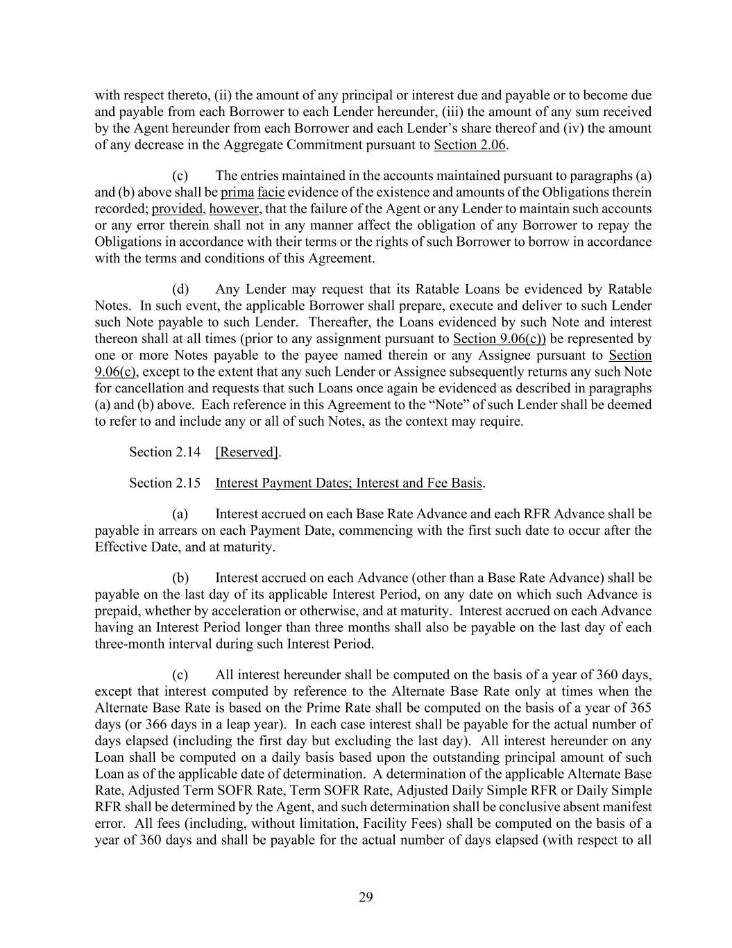 29 with respect thereto, (ii) the amount of any principal or interest due and payable or to become due and payable from each Borrower to each Lender hereunder, (iii) the amount of any sum received by the Agent hereunder from each Borrower and each Lender’s share thereof and (iv) the amount of any decrease in the Aggregate Commitment pursuant to Section 2.06. (c) The entries maintained in the accounts maintained pursuant to paragraphs (a) and (b) above shall be prima facie evidence of the existence and amounts of the Obligations therein recorded; provided, however, that the failure of the Agent or any Lender to maintain such accounts or any error therein shall not in any manner affect the obligation of any Borrower to repay the Obligations in accordance with their terms or the rights of such Borrower to borrow in accordance with the terms and conditions of this Agreement. (d) Any Lender may request that its Ratable Loans be evidenced by Ratable Notes. In such event, the applicable Borrower shall prepare, execute and deliver to such Lender such Note payable to such Lender. Thereafter, the Loans evidenced by such Note and interest thereon shall at all times (prior to any assignment pursuant to Section 9.06(c)) be represented by one or more Notes payable to the payee named therein or any Assignee pursuant to Section 9.06(c), except to the extent that any such Lender or Assignee subsequently returns any such Note for cancellation and requests that such Loans once again be evidenced as described in paragraphs (a) and (b) above. Each reference in this Agreement to the “Note” of such Lender shall be deemed to refer to and include any or all of such Notes, as the context may require. Section 2.14 [Reserved]. Section 2.15 Interest Payment Dates; Interest and Fee Basis. (a) Interest accrued on each Base Rate Advance and each RFR Advance shall be payable in arrears on each Payment Date, commencing with the first such date to occur after the Effective Date, and at maturity. (b) Interest accrued on each Advance (other than a Base Rate Advance) shall be payable on the last day of its applicable Interest Period, on any date on which such Advance is prepaid, whether by acceleration or otherwise, and at maturity. Interest accrued on each Advance having an Interest Period longer than three months shall also be payable on the last day of each three-month interval during such Interest Period. (c) All interest hereunder shall be computed on the basis of a year of 360 days, except that interest computed by reference to the Alternate Base Rate only at times when the Alternate Base Rate is based on the Prime Rate shall be computed on the basis of a year of 365 days (or 366 days in a leap year). In each case interest shall be payable for the actual number of days elapsed (including the first day but excluding the last day). All interest hereunder on any Loan shall be computed on a daily basis based upon the outstanding principal amount of such Loan as of the applicable date of determination. A determination of the applicable Alternate Base Rate, Adjusted Term SOFR Rate, Term SOFR Rate, Adjusted Daily Simple RFR or Daily Simple RFR shall be determined by the Agent, and such determination shall be conclusive absent manifest error. All fees (including, without limitation, Facility Fees) shall be computed on the basis of a year of 360 days and shall be payable for the actual number of days elapsed (with respect to all