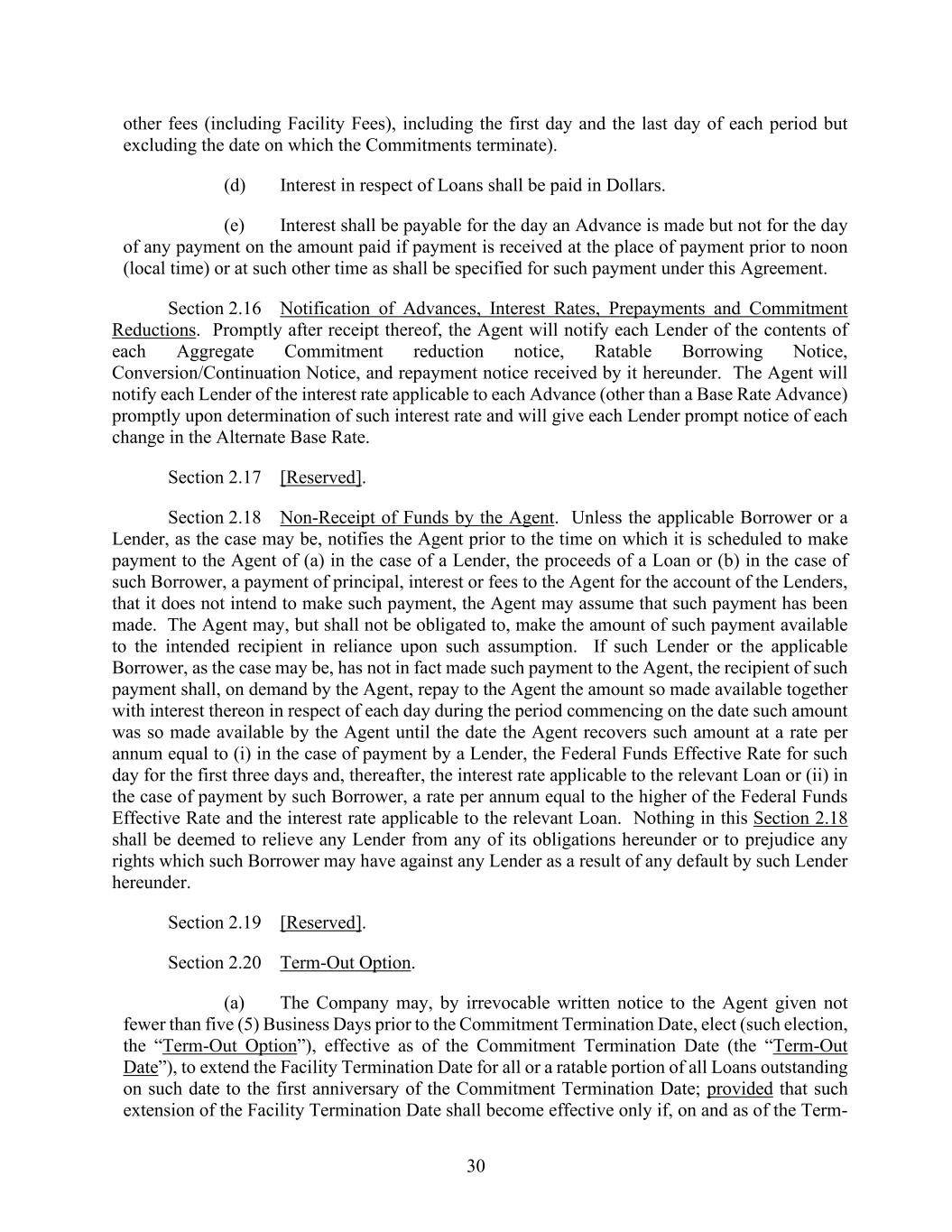 30 other fees (including Facility Fees), including the first day and the last day of each period but excluding the date on which the Commitments terminate). (d) Interest in respect of Loans shall be paid in Dollars. (e) Interest shall be payable for the day an Advance is made but not for the day of any payment on the amount paid if payment is received at the place of payment prior to noon (local time) or at such other time as shall be specified for such payment under this Agreement. Section 2.16 Notification of Advances, Interest Rates, Prepayments and Commitment Reductions. Promptly after receipt thereof, the Agent will notify each Lender of the contents of each Aggregate Commitment reduction notice, Ratable Borrowing Notice, Conversion/Continuation Notice, and repayment notice received by it hereunder. The Agent will notify each Lender of the interest rate applicable to each Advance (other than a Base Rate Advance) promptly upon determination of such interest rate and will give each Lender prompt notice of each change in the Alternate Base Rate. Section 2.17 [Reserved]. Section 2.18 Non-Receipt of Funds by the Agent. Unless the applicable Borrower or a Lender, as the case may be, notifies the Agent prior to the time on which it is scheduled to make payment to the Agent of (a) in the case of a Lender, the proceeds of a Loan or (b) in the case of such Borrower, a payment of principal, interest or fees to the Agent for the account of the Lenders, that it does not intend to make such payment, the Agent may assume that such payment has been made. The Agent may, but shall not be obligated to, make the amount of such payment available to the intended recipient in reliance upon such assumption. If such Lender or the applicable Borrower, as the case may be, has not in fact made such payment to the Agent, the recipient of such payment shall, on demand by the Agent, repay to the Agent the amount so made available together with interest thereon in respect of each day during the period commencing on the date such amount was so made available by the Agent until the date the Agent recovers such amount at a rate per annum equal to (i) in the case of payment by a Lender, the Federal Funds Effective Rate for such day for the first three days and, thereafter, the interest rate applicable to the relevant Loan or (ii) in the case of payment by such Borrower, a rate per annum equal to the higher of the Federal Funds Effective Rate and the interest rate applicable to the relevant Loan. Nothing in this Section 2.18 shall be deemed to relieve any Lender from any of its obligations hereunder or to prejudice any rights which such Borrower may have against any Lender as a result of any default by such Lender hereunder. Section 2.19 [Reserved]. Section 2.20 Term-Out Option. (a) The Company may, by irrevocable written notice to the Agent given not fewer than five (5) Business Days prior to the Commitment Termination Date, elect (such election, the “Term-Out Option”), effective as of the Commitment Termination Date (the “Term-Out Date”), to extend the Facility Termination Date for all or a ratable portion of all Loans outstanding on such date to the first anniversary of the Commitment Termination Date; provided that such extension of the Facility Termination Date shall become effective only if, on and as of the Term-