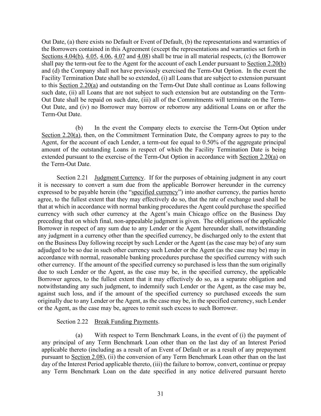 31 Out Date, (a) there exists no Default or Event of Default, (b) the representations and warranties of the Borrowers contained in this Agreement (except the representations and warranties set forth in Sections 4.04(b), 4.05, 4.06, 4.07 and 4.08) shall be true in all material respects, (c) the Borrower shall pay the term-out fee to the Agent for the account of each Lender pursuant to Section 2.20(b) and (d) the Company shall not have previously exercised the Term-Out Option. In the event the Facility Termination Date shall be so extended, (i) all Loans that are subject to extension pursuant to this Section 2.20(a) and outstanding on the Term-Out Date shall continue as Loans following such date, (ii) all Loans that are not subject to such extension but are outstanding on the Term- Out Date shall be repaid on such date, (iii) all of the Commitments will terminate on the Term- Out Date, and (iv) no Borrower may borrow or reborrow any additional Loans on or after the Term-Out Date. (b) In the event the Company elects to exercise the Term-Out Option under Section 2.20(a), then, on the Commitment Termination Date, the Company agrees to pay to the Agent, for the account of each Lender, a term-out fee equal to 0.50% of the aggregate principal amount of the outstanding Loans in respect of which the Facility Termination Date is being extended pursuant to the exercise of the Term-Out Option in accordance with Section 2.20(a) on the Term-Out Date. Section 2.21 Judgment Currency. If for the purposes of obtaining judgment in any court it is necessary to convert a sum due from the applicable Borrower hereunder in the currency expressed to be payable herein (the “specified currency”) into another currency, the parties hereto agree, to the fullest extent that they may effectively do so, that the rate of exchange used shall be that at which in accordance with normal banking procedures the Agent could purchase the specified currency with such other currency at the Agent’s main Chicago office on the Business Day preceding that on which final, non-appealable judgment is given. The obligations of the applicable Borrower in respect of any sum due to any Lender or the Agent hereunder shall, notwithstanding any judgment in a currency other than the specified currency, be discharged only to the extent that on the Business Day following receipt by such Lender or the Agent (as the case may be) of any sum adjudged to be so due in such other currency such Lender or the Agent (as the case may be) may in accordance with normal, reasonable banking procedures purchase the specified currency with such other currency. If the amount of the specified currency so purchased is less than the sum originally due to such Lender or the Agent, as the case may be, in the specified currency, the applicable Borrower agrees, to the fullest extent that it may effectively do so, as a separate obligation and notwithstanding any such judgment, to indemnify such Lender or the Agent, as the case may be, against such loss, and if the amount of the specified currency so purchased exceeds the sum originally due to any Lender or the Agent, as the case may be, in the specified currency, such Lender or the Agent, as the case may be, agrees to remit such excess to such Borrower. Section 2.22 Break Funding Payments. (a) With respect to Term Benchmark Loans, in the event of (i) the payment of any principal of any Term Benchmark Loan other than on the last day of an Interest Period applicable thereto (including as a result of an Event of Default or as a result of any prepayment pursuant to Section 2.08), (ii) the conversion of any Term Benchmark Loan other than on the last day of the Interest Period applicable thereto, (iii) the failure to borrow, convert, continue or prepay any Term Benchmark Loan on the date specified in any notice delivered pursuant hereto