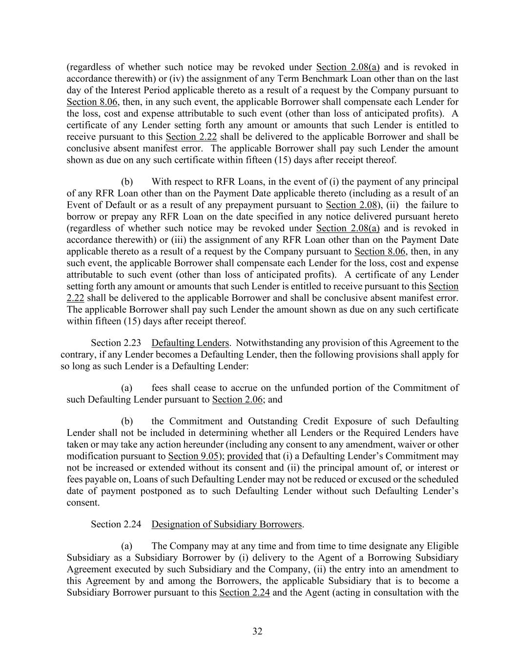 32 (regardless of whether such notice may be revoked under Section 2.08(a) and is revoked in accordance therewith) or (iv) the assignment of any Term Benchmark Loan other than on the last day of the Interest Period applicable thereto as a result of a request by the Company pursuant to Section 8.06, then, in any such event, the applicable Borrower shall compensate each Lender for the loss, cost and expense attributable to such event (other than loss of anticipated profits). A certificate of any Lender setting forth any amount or amounts that such Lender is entitled to receive pursuant to this Section 2.22 shall be delivered to the applicable Borrower and shall be conclusive absent manifest error. The applicable Borrower shall pay such Lender the amount shown as due on any such certificate within fifteen (15) days after receipt thereof. (b) With respect to RFR Loans, in the event of (i) the payment of any principal of any RFR Loan other than on the Payment Date applicable thereto (including as a result of an Event of Default or as a result of any prepayment pursuant to Section 2.08), (ii) the failure to borrow or prepay any RFR Loan on the date specified in any notice delivered pursuant hereto (regardless of whether such notice may be revoked under Section 2.08(a) and is revoked in accordance therewith) or (iii) the assignment of any RFR Loan other than on the Payment Date applicable thereto as a result of a request by the Company pursuant to Section 8.06, then, in any such event, the applicable Borrower shall compensate each Lender for the loss, cost and expense attributable to such event (other than loss of anticipated profits). A certificate of any Lender setting forth any amount or amounts that such Lender is entitled to receive pursuant to this Section 2.22 shall be delivered to the applicable Borrower and shall be conclusive absent manifest error. The applicable Borrower shall pay such Lender the amount shown as due on any such certificate within fifteen (15) days after receipt thereof. Section 2.23 Defaulting Lenders. Notwithstanding any provision of this Agreement to the contrary, if any Lender becomes a Defaulting Lender, then the following provisions shall apply for so long as such Lender is a Defaulting Lender: (a) fees shall cease to accrue on the unfunded portion of the Commitment of such Defaulting Lender pursuant to Section 2.06; and (b) the Commitment and Outstanding Credit Exposure of such Defaulting Lender shall not be included in determining whether all Lenders or the Required Lenders have taken or may take any action hereunder (including any consent to any amendment, waiver or other modification pursuant to Section 9.05); provided that (i) a Defaulting Lender’s Commitment may not be increased or extended without its consent and (ii) the principal amount of, or interest or fees payable on, Loans of such Defaulting Lender may not be reduced or excused or the scheduled date of payment postponed as to such Defaulting Lender without such Defaulting Lender’s consent. Section 2.24 Designation of Subsidiary Borrowers. (a) The Company may at any time and from time to time designate any Eligible Subsidiary as a Subsidiary Borrower by (i) delivery to the Agent of a Borrowing Subsidiary Agreement executed by such Subsidiary and the Company, (ii) the entry into an amendment to this Agreement by and among the Borrowers, the applicable Subsidiary that is to become a Subsidiary Borrower pursuant to this Section 2.24 and the Agent (acting in consultation with the