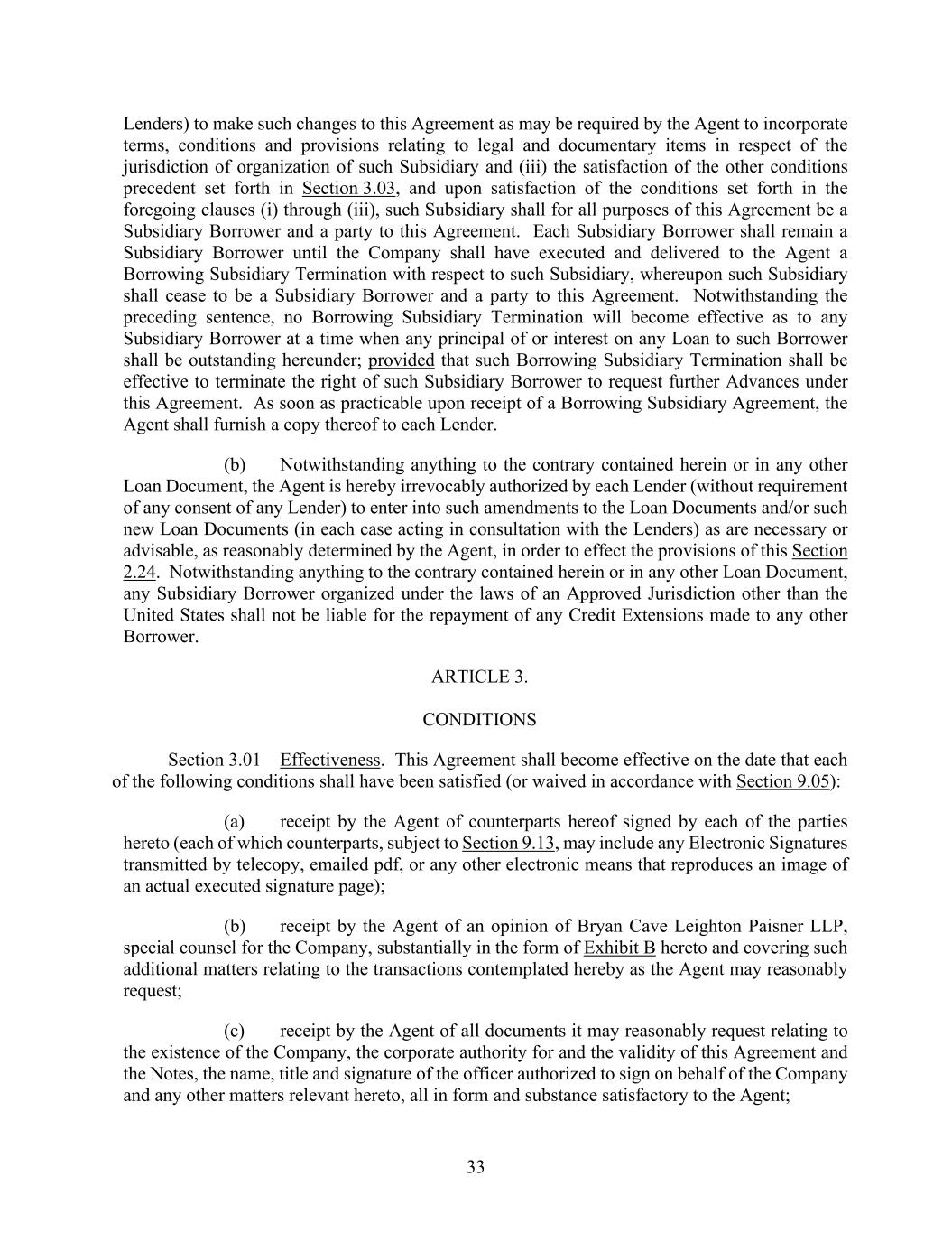 33 Lenders) to make such changes to this Agreement as may be required by the Agent to incorporate terms, conditions and provisions relating to legal and documentary items in respect of the jurisdiction of organization of such Subsidiary and (iii) the satisfaction of the other conditions precedent set forth in Section 3.03, and upon satisfaction of the conditions set forth in the foregoing clauses (i) through (iii), such Subsidiary shall for all purposes of this Agreement be a Subsidiary Borrower and a party to this Agreement. Each Subsidiary Borrower shall remain a Subsidiary Borrower until the Company shall have executed and delivered to the Agent a Borrowing Subsidiary Termination with respect to such Subsidiary, whereupon such Subsidiary shall cease to be a Subsidiary Borrower and a party to this Agreement. Notwithstanding the preceding sentence, no Borrowing Subsidiary Termination will become effective as to any Subsidiary Borrower at a time when any principal of or interest on any Loan to such Borrower shall be outstanding hereunder; provided that such Borrowing Subsidiary Termination shall be effective to terminate the right of such Subsidiary Borrower to request further Advances under this Agreement. As soon as practicable upon receipt of a Borrowing Subsidiary Agreement, the Agent shall furnish a copy thereof to each Lender. (b) Notwithstanding anything to the contrary contained herein or in any other Loan Document, the Agent is hereby irrevocably authorized by each Lender (without requirement of any consent of any Lender) to enter into such amendments to the Loan Documents and/or such new Loan Documents (in each case acting in consultation with the Lenders) as are necessary or advisable, as reasonably determined by the Agent, in order to effect the provisions of this Section 2.24. Notwithstanding anything to the contrary contained herein or in any other Loan Document, any Subsidiary Borrower organized under the laws of an Approved Jurisdiction other than the United States shall not be liable for the repayment of any Credit Extensions made to any other Borrower. ARTICLE 3. CONDITIONS Section 3.01 Effectiveness. This Agreement shall become effective on the date that each of the following conditions shall have been satisfied (or waived in accordance with Section 9.05): (a) receipt by the Agent of counterparts hereof signed by each of the parties hereto (each of which counterparts, subject to Section 9.13, may include any Electronic Signatures transmitted by telecopy, emailed pdf, or any other electronic means that reproduces an image of an actual executed signature page); (b) receipt by the Agent of an opinion of Bryan Cave Leighton Paisner LLP, special counsel for the Company, substantially in the form of Exhibit B hereto and covering such additional matters relating to the transactions contemplated hereby as the Agent may reasonably request; (c) receipt by the Agent of all documents it may reasonably request relating to the existence of the Company, the corporate authority for and the validity of this Agreement and the Notes, the name, title and signature of the officer authorized to sign on behalf of the Company and any other matters relevant hereto, all in form and substance satisfactory to the Agent;