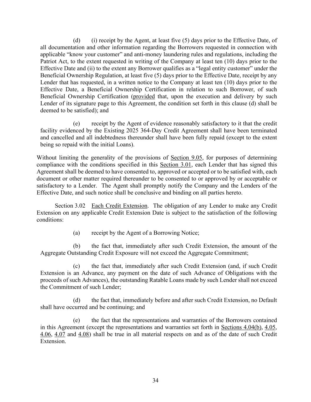 34 (d) (i) receipt by the Agent, at least five (5) days prior to the Effective Date, of all documentation and other information regarding the Borrowers requested in connection with applicable “know your customer” and anti-money laundering rules and regulations, including the Patriot Act, to the extent requested in writing of the Company at least ten (10) days prior to the Effective Date and (ii) to the extent any Borrower qualifies as a “legal entity customer” under the Beneficial Ownership Regulation, at least five (5) days prior to the Effective Date, receipt by any Lender that has requested, in a written notice to the Company at least ten (10) days prior to the Effective Date, a Beneficial Ownership Certification in relation to such Borrower, of such Beneficial Ownership Certification (provided that, upon the execution and delivery by such Lender of its signature page to this Agreement, the condition set forth in this clause (d) shall be deemed to be satisfied); and (e) receipt by the Agent of evidence reasonably satisfactory to it that the credit facility evidenced by the Existing 2025 364-Day Credit Agreement shall have been terminated and cancelled and all indebtedness thereunder shall have been fully repaid (except to the extent being so repaid with the initial Loans). Without limiting the generality of the provisions of Section 9.05, for purposes of determining compliance with the conditions specified in this Section 3.01, each Lender that has signed this Agreement shall be deemed to have consented to, approved or accepted or to be satisfied with, each document or other matter required thereunder to be consented to or approved by or acceptable or satisfactory to a Lender. The Agent shall promptly notify the Company and the Lenders of the Effective Date, and such notice shall be conclusive and binding on all parties hereto. Section 3.02 Each Credit Extension. The obligation of any Lender to make any Credit Extension on any applicable Credit Extension Date is subject to the satisfaction of the following conditions: (a) receipt by the Agent of a Borrowing Notice; (b) the fact that, immediately after such Credit Extension, the amount of the Aggregate Outstanding Credit Exposure will not exceed the Aggregate Commitment; (c) the fact that, immediately after such Credit Extension (and, if such Credit Extension is an Advance, any payment on the date of such Advance of Obligations with the proceeds of such Advances), the outstanding Ratable Loans made by such Lender shall not exceed the Commitment of such Lender; (d) the fact that, immediately before and after such Credit Extension, no Default shall have occurred and be continuing; and (e) the fact that the representations and warranties of the Borrowers contained in this Agreement (except the representations and warranties set forth in Sections 4.04(b), 4.05, 4.06, 4.07 and 4.08) shall be true in all material respects on and as of the date of such Credit Extension.