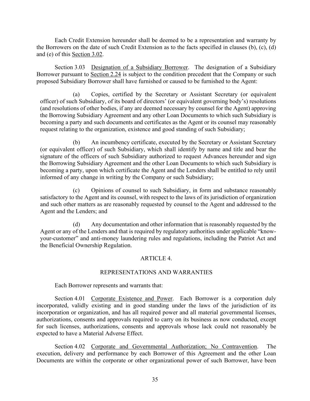 35 Each Credit Extension hereunder shall be deemed to be a representation and warranty by the Borrowers on the date of such Credit Extension as to the facts specified in clauses (b), (c), (d) and (e) of this Section 3.02. Section 3.03 Designation of a Subsidiary Borrower. The designation of a Subsidiary Borrower pursuant to Section 2.24 is subject to the condition precedent that the Company or such proposed Subsidiary Borrower shall have furnished or caused to be furnished to the Agent: (a) Copies, certified by the Secretary or Assistant Secretary (or equivalent officer) of such Subsidiary, of its board of directors’ (or equivalent governing body’s) resolutions (and resolutions of other bodies, if any are deemed necessary by counsel for the Agent) approving the Borrowing Subsidiary Agreement and any other Loan Documents to which such Subsidiary is becoming a party and such documents and certificates as the Agent or its counsel may reasonably request relating to the organization, existence and good standing of such Subsidiary; (b) An incumbency certificate, executed by the Secretary or Assistant Secretary (or equivalent officer) of such Subsidiary, which shall identify by name and title and bear the signature of the officers of such Subsidiary authorized to request Advances hereunder and sign the Borrowing Subsidiary Agreement and the other Loan Documents to which such Subsidiary is becoming a party, upon which certificate the Agent and the Lenders shall be entitled to rely until informed of any change in writing by the Company or such Subsidiary; (c) Opinions of counsel to such Subsidiary, in form and substance reasonably satisfactory to the Agent and its counsel, with respect to the laws of its jurisdiction of organization and such other matters as are reasonably requested by counsel to the Agent and addressed to the Agent and the Lenders; and (d) Any documentation and other information that is reasonably requested by the Agent or any of the Lenders and that is required by regulatory authorities under applicable “know- your-customer” and anti-money laundering rules and regulations, including the Patriot Act and the Beneficial Ownership Regulation. ARTICLE 4. REPRESENTATIONS AND WARRANTIES Each Borrower represents and warrants that: Section 4.01 Corporate Existence and Power. Each Borrower is a corporation duly incorporated, validly existing and in good standing under the laws of the jurisdiction of its incorporation or organization, and has all required power and all material governmental licenses, authorizations, consents and approvals required to carry on its business as now conducted, except for such licenses, authorizations, consents and approvals whose lack could not reasonably be expected to have a Material Adverse Effect. Section 4.02 Corporate and Governmental Authorization; No Contravention. The execution, delivery and performance by each Borrower of this Agreement and the other Loan Documents are within the corporate or other organizational power of such Borrower, have been