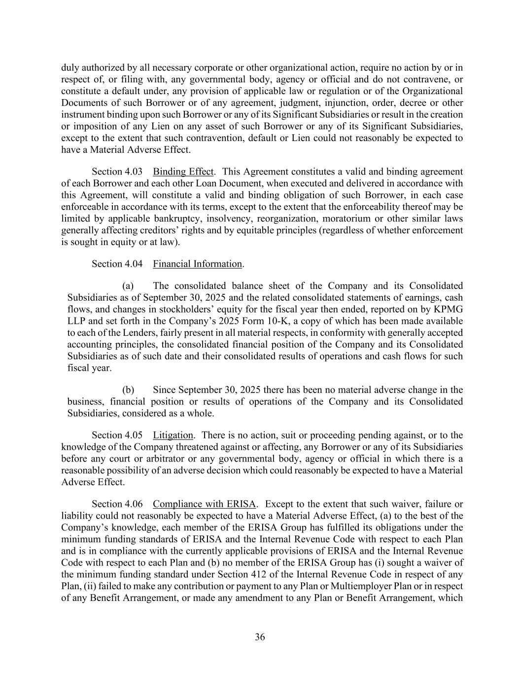36 duly authorized by all necessary corporate or other organizational action, require no action by or in respect of, or filing with, any governmental body, agency or official and do not contravene, or constitute a default under, any provision of applicable law or regulation or of the Organizational Documents of such Borrower or of any agreement, judgment, injunction, order, decree or other instrument binding upon such Borrower or any of its Significant Subsidiaries or result in the creation or imposition of any Lien on any asset of such Borrower or any of its Significant Subsidiaries, except to the extent that such contravention, default or Lien could not reasonably be expected to have a Material Adverse Effect. Section 4.03 Binding Effect. This Agreement constitutes a valid and binding agreement of each Borrower and each other Loan Document, when executed and delivered in accordance with this Agreement, will constitute a valid and binding obligation of such Borrower, in each case enforceable in accordance with its terms, except to the extent that the enforceability thereof may be limited by applicable bankruptcy, insolvency, reorganization, moratorium or other similar laws generally affecting creditors’ rights and by equitable principles (regardless of whether enforcement is sought in equity or at law). Section 4.04 Financial Information. (a) The consolidated balance sheet of the Company and its Consolidated Subsidiaries as of September 30, 2025 and the related consolidated statements of earnings, cash flows, and changes in stockholders’ equity for the fiscal year then ended, reported on by KPMG LLP and set forth in the Company’s 2025 Form 10-K, a copy of which has been made available to each of the Lenders, fairly present in all material respects, in conformity with generally accepted accounting principles, the consolidated financial position of the Company and its Consolidated Subsidiaries as of such date and their consolidated results of operations and cash flows for such fiscal year. (b) Since September 30, 2025 there has been no material adverse change in the business, financial position or results of operations of the Company and its Consolidated Subsidiaries, considered as a whole. Section 4.05 Litigation. There is no action, suit or proceeding pending against, or to the knowledge of the Company threatened against or affecting, any Borrower or any of its Subsidiaries before any court or arbitrator or any governmental body, agency or official in which there is a reasonable possibility of an adverse decision which could reasonably be expected to have a Material Adverse Effect. Section 4.06 Compliance with ERISA. Except to the extent that such waiver, failure or liability could not reasonably be expected to have a Material Adverse Effect, (a) to the best of the Company’s knowledge, each member of the ERISA Group has fulfilled its obligations under the minimum funding standards of ERISA and the Internal Revenue Code with respect to each Plan and is in compliance with the currently applicable provisions of ERISA and the Internal Revenue Code with respect to each Plan and (b) no member of the ERISA Group has (i) sought a waiver of the minimum funding standard under Section 412 of the Internal Revenue Code in respect of any Plan, (ii) failed to make any contribution or payment to any Plan or Multiemployer Plan or in respect of any Benefit Arrangement, or made any amendment to any Plan or Benefit Arrangement, which
