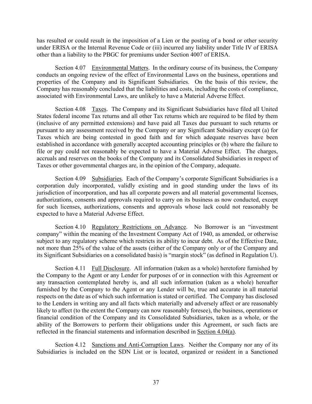 37 has resulted or could result in the imposition of a Lien or the posting of a bond or other security under ERISA or the Internal Revenue Code or (iii) incurred any liability under Title IV of ERISA other than a liability to the PBGC for premiums under Section 4007 of ERISA. Section 4.07 Environmental Matters. In the ordinary course of its business, the Company conducts an ongoing review of the effect of Environmental Laws on the business, operations and properties of the Company and its Significant Subsidiaries. On the basis of this review, the Company has reasonably concluded that the liabilities and costs, including the costs of compliance, associated with Environmental Laws, are unlikely to have a Material Adverse Effect. Section 4.08 Taxes. The Company and its Significant Subsidiaries have filed all United States federal income Tax returns and all other Tax returns which are required to be filed by them (inclusive of any permitted extensions) and have paid all Taxes due pursuant to such returns or pursuant to any assessment received by the Company or any Significant Subsidiary except (a) for Taxes which are being contested in good faith and for which adequate reserves have been established in accordance with generally accepted accounting principles or (b) where the failure to file or pay could not reasonably be expected to have a Material Adverse Effect. The charges, accruals and reserves on the books of the Company and its Consolidated Subsidiaries in respect of Taxes or other governmental charges are, in the opinion of the Company, adequate. Section 4.09 Subsidiaries. Each of the Company’s corporate Significant Subsidiaries is a corporation duly incorporated, validly existing and in good standing under the laws of its jurisdiction of incorporation, and has all corporate powers and all material governmental licenses, authorizations, consents and approvals required to carry on its business as now conducted, except for such licenses, authorizations, consents and approvals whose lack could not reasonably be expected to have a Material Adverse Effect. Section 4.10 Regulatory Restrictions on Advance. No Borrower is an “investment company” within the meaning of the Investment Company Act of 1940, as amended, or otherwise subject to any regulatory scheme which restricts its ability to incur debt. As of the Effective Date, not more than 25% of the value of the assets (either of the Company only or of the Company and its Significant Subsidiaries on a consolidated basis) is “margin stock” (as defined in Regulation U). Section 4.11 Full Disclosure. All information (taken as a whole) heretofore furnished by the Company to the Agent or any Lender for purposes of or in connection with this Agreement or any transaction contemplated hereby is, and all such information (taken as a whole) hereafter furnished by the Company to the Agent or any Lender will be, true and accurate in all material respects on the date as of which such information is stated or certified. The Company has disclosed to the Lenders in writing any and all facts which materially and adversely affect or are reasonably likely to affect (to the extent the Company can now reasonably foresee), the business, operations or financial condition of the Company and its Consolidated Subsidiaries, taken as a whole, or the ability of the Borrowers to perform their obligations under this Agreement, or such facts are reflected in the financial statements and information described in Section 4.04(a). Section 4.12 Sanctions and Anti-Corruption Laws. Neither the Company nor any of its Subsidiaries is included on the SDN List or is located, organized or resident in a Sanctioned