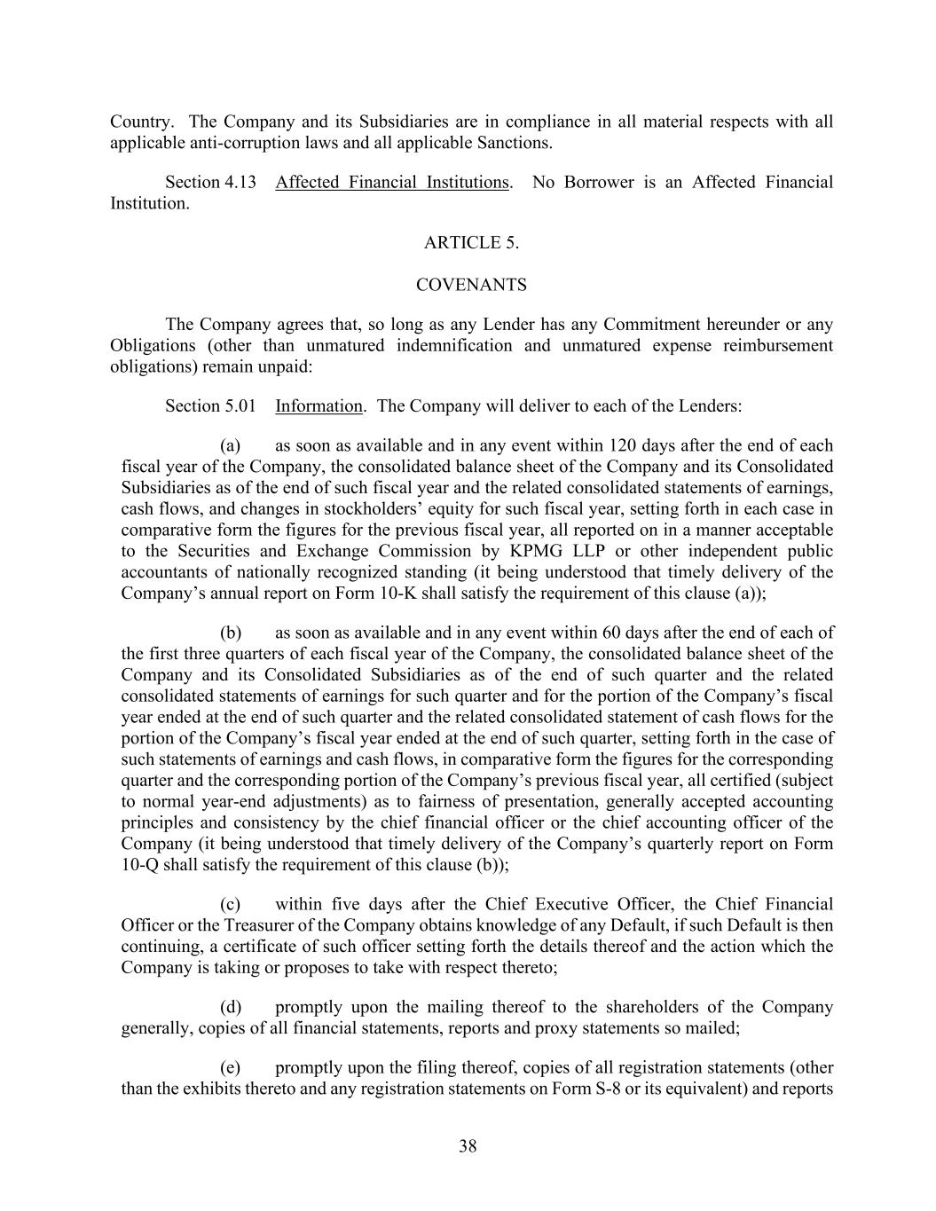 38 Country. The Company and its Subsidiaries are in compliance in all material respects with all applicable anti-corruption laws and all applicable Sanctions. Section 4.13 Affected Financial Institutions. No Borrower is an Affected Financial Institution. ARTICLE 5. COVENANTS The Company agrees that, so long as any Lender has any Commitment hereunder or any Obligations (other than unmatured indemnification and unmatured expense reimbursement obligations) remain unpaid: Section 5.01 Information. The Company will deliver to each of the Lenders: (a) as soon as available and in any event within 120 days after the end of each fiscal year of the Company, the consolidated balance sheet of the Company and its Consolidated Subsidiaries as of the end of such fiscal year and the related consolidated statements of earnings, cash flows, and changes in stockholders’ equity for such fiscal year, setting forth in each case in comparative form the figures for the previous fiscal year, all reported on in a manner acceptable to the Securities and Exchange Commission by KPMG LLP or other independent public accountants of nationally recognized standing (it being understood that timely delivery of the Company’s annual report on Form 10-K shall satisfy the requirement of this clause (a)); (b) as soon as available and in any event within 60 days after the end of each of the first three quarters of each fiscal year of the Company, the consolidated balance sheet of the Company and its Consolidated Subsidiaries as of the end of such quarter and the related consolidated statements of earnings for such quarter and for the portion of the Company’s fiscal year ended at the end of such quarter and the related consolidated statement of cash flows for the portion of the Company’s fiscal year ended at the end of such quarter, setting forth in the case of such statements of earnings and cash flows, in comparative form the figures for the corresponding quarter and the corresponding portion of the Company’s previous fiscal year, all certified (subject to normal year-end adjustments) as to fairness of presentation, generally accepted accounting principles and consistency by the chief financial officer or the chief accounting officer of the Company (it being understood that timely delivery of the Company’s quarterly report on Form 10-Q shall satisfy the requirement of this clause (b)); (c) within five days after the Chief Executive Officer, the Chief Financial Officer or the Treasurer of the Company obtains knowledge of any Default, if such Default is then continuing, a certificate of such officer setting forth the details thereof and the action which the Company is taking or proposes to take with respect thereto; (d) promptly upon the mailing thereof to the shareholders of the Company generally, copies of all financial statements, reports and proxy statements so mailed; (e) promptly upon the filing thereof, copies of all registration statements (other than the exhibits thereto and any registration statements on Form S-8 or its equivalent) and reports