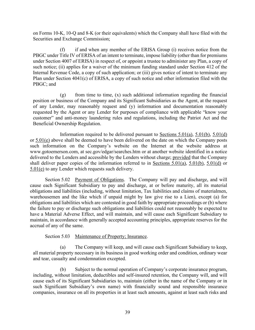 39 on Forms 10-K, 10-Q and 8-K (or their equivalents) which the Company shall have filed with the Securities and Exchange Commission; (f) if and when any member of the ERISA Group (i) receives notice from the PBGC under Title IV of ERISA of an intent to terminate, impose liability (other than for premiums under Section 4007 of ERISA) in respect of, or appoint a trustee to administer any Plan, a copy of such notice; (ii) applies for a waiver of the minimum funding standard under Section 412 of the Internal Revenue Code, a copy of such application; or (iii) gives notice of intent to terminate any Plan under Section 4041(c) of ERISA, a copy of such notice and other information filed with the PBGC; and (g) from time to time, (x) such additional information regarding the financial position or business of the Company and its Significant Subsidiaries as the Agent, at the request of any Lender, may reasonably request and (y) information and documentation reasonably requested by the Agent or any Lender for purposes of compliance with applicable “know your customer” and anti-money laundering rules and regulations, including the Patriot Act and the Beneficial Ownership Regulation. Information required to be delivered pursuant to Sections 5.01(a), 5.01(b), 5.01(d) or 5.01(e) above shall be deemed to have been delivered on the date on which the Company posts such information on the Company’s website on the Internet at the website address at www.gotoemerson.com, at sec.gov/edgar/searches.htm or at another website identified in a notice delivered to the Lenders and accessible by the Lenders without charge; provided that the Company shall deliver paper copies of the information referred to in Sections 5.01(a), 5.01(b), 5.01(d) or 5.01(e) to any Lender which requests such delivery. Section 5.02 Payment of Obligations. The Company will pay and discharge, and will cause each Significant Subsidiary to pay and discharge, at or before maturity, all its material obligations and liabilities (including, without limitation, Tax liabilities and claims of materialmen, warehousemen and the like which if unpaid might by law give rise to a Lien), except (a) for obligations and liabilities which are contested in good faith by appropriate proceedings or (b) where the failure to pay or discharge such obligations and liabilities could not reasonably be expected to have a Material Adverse Effect, and will maintain, and will cause each Significant Subsidiary to maintain, in accordance with generally accepted accounting principles, appropriate reserves for the accrual of any of the same. Section 5.03 Maintenance of Property; Insurance. (a) The Company will keep, and will cause each Significant Subsidiary to keep, all material property necessary in its business in good working order and condition, ordinary wear and tear, casualty and condemnation excepted. (b) Subject to the normal operation of Company’s corporate insurance program, including, without limitation, deductibles and self-insured retention, the Company will, and will cause each of its Significant Subsidiaries to, maintain (either in the name of the Company or in such Significant Subsidiary’s own name) with financially sound and responsible insurance companies, insurance on all its properties in at least such amounts, against at least such risks and