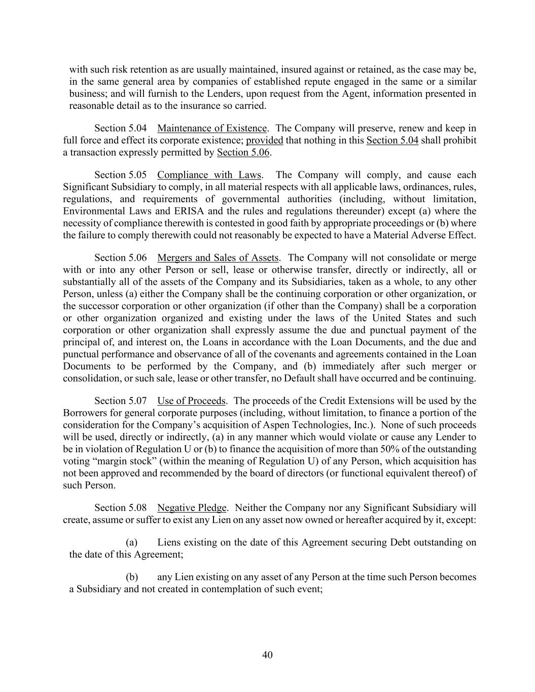 40 with such risk retention as are usually maintained, insured against or retained, as the case may be, in the same general area by companies of established repute engaged in the same or a similar business; and will furnish to the Lenders, upon request from the Agent, information presented in reasonable detail as to the insurance so carried. Section 5.04 Maintenance of Existence. The Company will preserve, renew and keep in full force and effect its corporate existence; provided that nothing in this Section 5.04 shall prohibit a transaction expressly permitted by Section 5.06. Section 5.05 Compliance with Laws. The Company will comply, and cause each Significant Subsidiary to comply, in all material respects with all applicable laws, ordinances, rules, regulations, and requirements of governmental authorities (including, without limitation, Environmental Laws and ERISA and the rules and regulations thereunder) except (a) where the necessity of compliance therewith is contested in good faith by appropriate proceedings or (b) where the failure to comply therewith could not reasonably be expected to have a Material Adverse Effect. Section 5.06 Mergers and Sales of Assets. The Company will not consolidate or merge with or into any other Person or sell, lease or otherwise transfer, directly or indirectly, all or substantially all of the assets of the Company and its Subsidiaries, taken as a whole, to any other Person, unless (a) either the Company shall be the continuing corporation or other organization, or the successor corporation or other organization (if other than the Company) shall be a corporation or other organization organized and existing under the laws of the United States and such corporation or other organization shall expressly assume the due and punctual payment of the principal of, and interest on, the Loans in accordance with the Loan Documents, and the due and punctual performance and observance of all of the covenants and agreements contained in the Loan Documents to be performed by the Company, and (b) immediately after such merger or consolidation, or such sale, lease or other transfer, no Default shall have occurred and be continuing. Section 5.07 Use of Proceeds. The proceeds of the Credit Extensions will be used by the Borrowers for general corporate purposes (including, without limitation, to finance a portion of the consideration for the Company’s acquisition of Aspen Technologies, Inc.). None of such proceeds will be used, directly or indirectly, (a) in any manner which would violate or cause any Lender to be in violation of Regulation U or (b) to finance the acquisition of more than 50% of the outstanding voting “margin stock” (within the meaning of Regulation U) of any Person, which acquisition has not been approved and recommended by the board of directors (or functional equivalent thereof) of such Person. Section 5.08 Negative Pledge. Neither the Company nor any Significant Subsidiary will create, assume or suffer to exist any Lien on any asset now owned or hereafter acquired by it, except: (a) Liens existing on the date of this Agreement securing Debt outstanding on the date of this Agreement; (b) any Lien existing on any asset of any Person at the time such Person becomes a Subsidiary and not created in contemplation of such event;