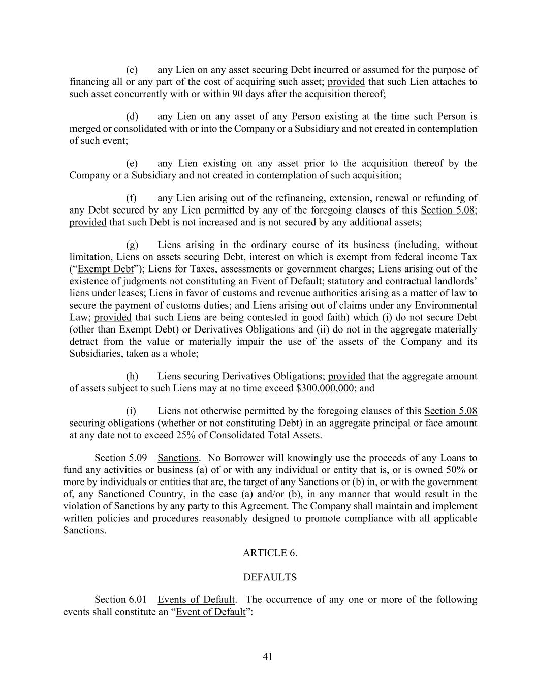 41 (c) any Lien on any asset securing Debt incurred or assumed for the purpose of financing all or any part of the cost of acquiring such asset; provided that such Lien attaches to such asset concurrently with or within 90 days after the acquisition thereof; (d) any Lien on any asset of any Person existing at the time such Person is merged or consolidated with or into the Company or a Subsidiary and not created in contemplation of such event; (e) any Lien existing on any asset prior to the acquisition thereof by the Company or a Subsidiary and not created in contemplation of such acquisition; (f) any Lien arising out of the refinancing, extension, renewal or refunding of any Debt secured by any Lien permitted by any of the foregoing clauses of this Section 5.08; provided that such Debt is not increased and is not secured by any additional assets; (g) Liens arising in the ordinary course of its business (including, without limitation, Liens on assets securing Debt, interest on which is exempt from federal income Tax (“Exempt Debt”); Liens for Taxes, assessments or government charges; Liens arising out of the existence of judgments not constituting an Event of Default; statutory and contractual landlords’ liens under leases; Liens in favor of customs and revenue authorities arising as a matter of law to secure the payment of customs duties; and Liens arising out of claims under any Environmental Law; provided that such Liens are being contested in good faith) which (i) do not secure Debt (other than Exempt Debt) or Derivatives Obligations and (ii) do not in the aggregate materially detract from the value or materially impair the use of the assets of the Company and its Subsidiaries, taken as a whole; (h) Liens securing Derivatives Obligations; provided that the aggregate amount of assets subject to such Liens may at no time exceed $300,000,000; and (i) Liens not otherwise permitted by the foregoing clauses of this Section 5.08 securing obligations (whether or not constituting Debt) in an aggregate principal or face amount at any date not to exceed 25% of Consolidated Total Assets. Section 5.09 Sanctions. No Borrower will knowingly use the proceeds of any Loans to fund any activities or business (a) of or with any individual or entity that is, or is owned 50% or more by individuals or entities that are, the target of any Sanctions or (b) in, or with the government of, any Sanctioned Country, in the case (a) and/or (b), in any manner that would result in the violation of Sanctions by any party to this Agreement. The Company shall maintain and implement written policies and procedures reasonably designed to promote compliance with all applicable Sanctions. ARTICLE 6. DEFAULTS Section 6.01 Events of Default. The occurrence of any one or more of the following events shall constitute an “Event of Default”: