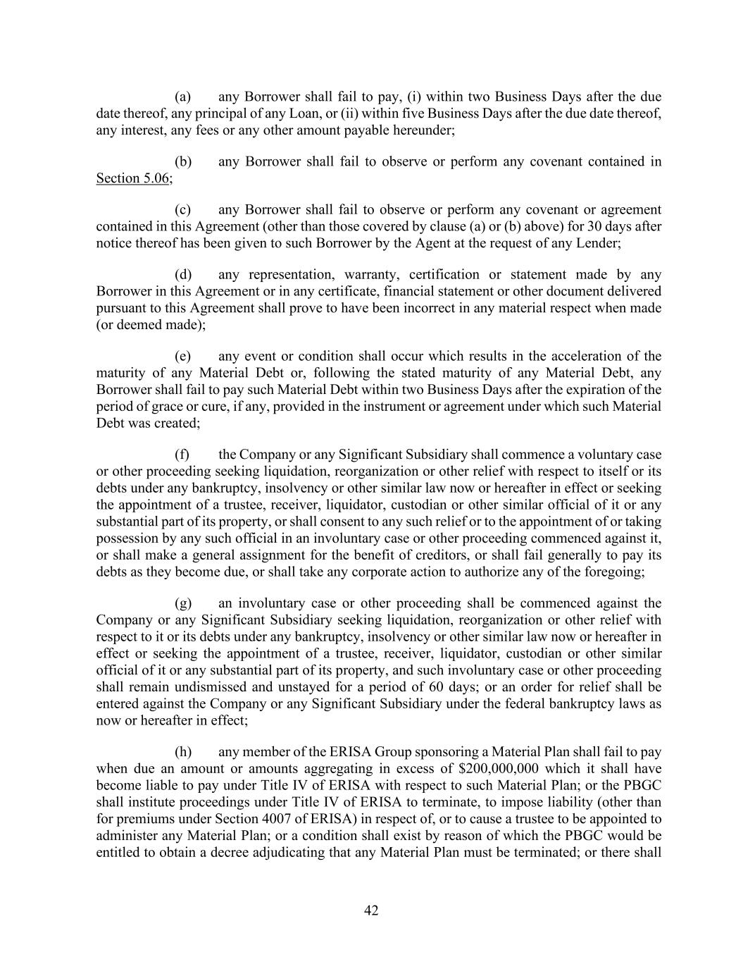 42 (a) any Borrower shall fail to pay, (i) within two Business Days after the due date thereof, any principal of any Loan, or (ii) within five Business Days after the due date thereof, any interest, any fees or any other amount payable hereunder; (b) any Borrower shall fail to observe or perform any covenant contained in Section 5.06; (c) any Borrower shall fail to observe or perform any covenant or agreement contained in this Agreement (other than those covered by clause (a) or (b) above) for 30 days after notice thereof has been given to such Borrower by the Agent at the request of any Lender; (d) any representation, warranty, certification or statement made by any Borrower in this Agreement or in any certificate, financial statement or other document delivered pursuant to this Agreement shall prove to have been incorrect in any material respect when made (or deemed made); (e) any event or condition shall occur which results in the acceleration of the maturity of any Material Debt or, following the stated maturity of any Material Debt, any Borrower shall fail to pay such Material Debt within two Business Days after the expiration of the period of grace or cure, if any, provided in the instrument or agreement under which such Material Debt was created; (f) the Company or any Significant Subsidiary shall commence a voluntary case or other proceeding seeking liquidation, reorganization or other relief with respect to itself or its debts under any bankruptcy, insolvency or other similar law now or hereafter in effect or seeking the appointment of a trustee, receiver, liquidator, custodian or other similar official of it or any substantial part of its property, or shall consent to any such relief or to the appointment of or taking possession by any such official in an involuntary case or other proceeding commenced against it, or shall make a general assignment for the benefit of creditors, or shall fail generally to pay its debts as they become due, or shall take any corporate action to authorize any of the foregoing; (g) an involuntary case or other proceeding shall be commenced against the Company or any Significant Subsidiary seeking liquidation, reorganization or other relief with respect to it or its debts under any bankruptcy, insolvency or other similar law now or hereafter in effect or seeking the appointment of a trustee, receiver, liquidator, custodian or other similar official of it or any substantial part of its property, and such involuntary case or other proceeding shall remain undismissed and unstayed for a period of 60 days; or an order for relief shall be entered against the Company or any Significant Subsidiary under the federal bankruptcy laws as now or hereafter in effect; (h) any member of the ERISA Group sponsoring a Material Plan shall fail to pay when due an amount or amounts aggregating in excess of $200,000,000 which it shall have become liable to pay under Title IV of ERISA with respect to such Material Plan; or the PBGC shall institute proceedings under Title IV of ERISA to terminate, to impose liability (other than for premiums under Section 4007 of ERISA) in respect of, or to cause a trustee to be appointed to administer any Material Plan; or a condition shall exist by reason of which the PBGC would be entitled to obtain a decree adjudicating that any Material Plan must be terminated; or there shall
