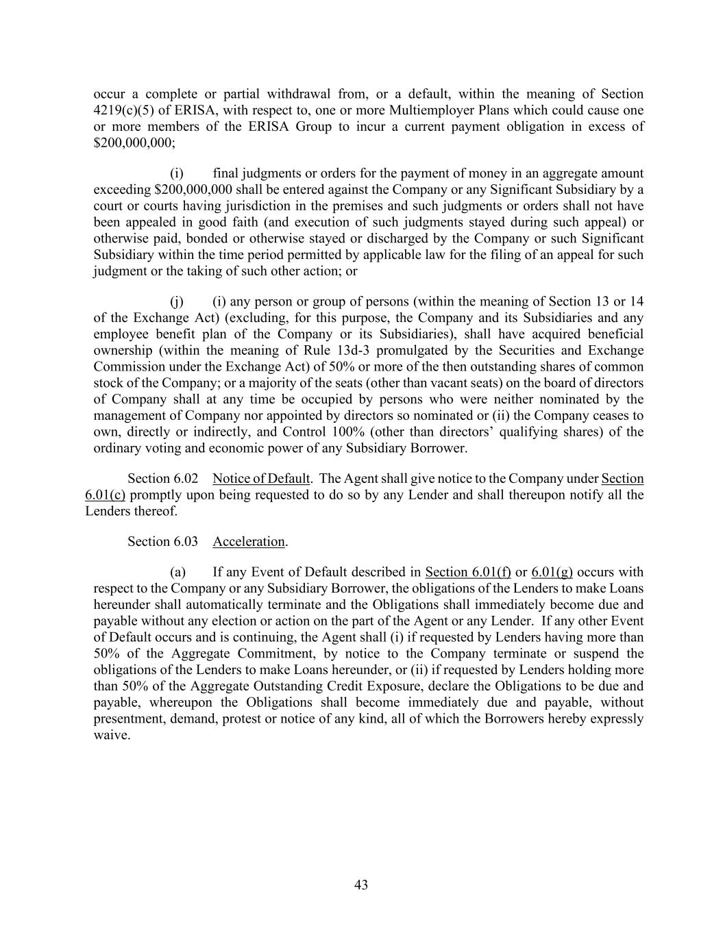 43 occur a complete or partial withdrawal from, or a default, within the meaning of Section 4219(c)(5) of ERISA, with respect to, one or more Multiemployer Plans which could cause one or more members of the ERISA Group to incur a current payment obligation in excess of $200,000,000; (i) final judgments or orders for the payment of money in an aggregate amount exceeding $200,000,000 shall be entered against the Company or any Significant Subsidiary by a court or courts having jurisdiction in the premises and such judgments or orders shall not have been appealed in good faith (and execution of such judgments stayed during such appeal) or otherwise paid, bonded or otherwise stayed or discharged by the Company or such Significant Subsidiary within the time period permitted by applicable law for the filing of an appeal for such judgment or the taking of such other action; or (j) (i) any person or group of persons (within the meaning of Section 13 or 14 of the Exchange Act) (excluding, for this purpose, the Company and its Subsidiaries and any employee benefit plan of the Company or its Subsidiaries), shall have acquired beneficial ownership (within the meaning of Rule 13d-3 promulgated by the Securities and Exchange Commission under the Exchange Act) of 50% or more of the then outstanding shares of common stock of the Company; or a majority of the seats (other than vacant seats) on the board of directors of Company shall at any time be occupied by persons who were neither nominated by the management of Company nor appointed by directors so nominated or (ii) the Company ceases to own, directly or indirectly, and Control 100% (other than directors’ qualifying shares) of the ordinary voting and economic power of any Subsidiary Borrower. Section 6.02 Notice of Default. The Agent shall give notice to the Company under Section 6.01(c) promptly upon being requested to do so by any Lender and shall thereupon notify all the Lenders thereof. Section 6.03 Acceleration. (a) If any Event of Default described in Section 6.01(f) or 6.01(g) occurs with respect to the Company or any Subsidiary Borrower, the obligations of the Lenders to make Loans hereunder shall automatically terminate and the Obligations shall immediately become due and payable without any election or action on the part of the Agent or any Lender. If any other Event of Default occurs and is continuing, the Agent shall (i) if requested by Lenders having more than 50% of the Aggregate Commitment, by notice to the Company terminate or suspend the obligations of the Lenders to make Loans hereunder, or (ii) if requested by Lenders holding more than 50% of the Aggregate Outstanding Credit Exposure, declare the Obligations to be due and payable, whereupon the Obligations shall become immediately due and payable, without presentment, demand, protest or notice of any kind, all of which the Borrowers hereby expressly waive.