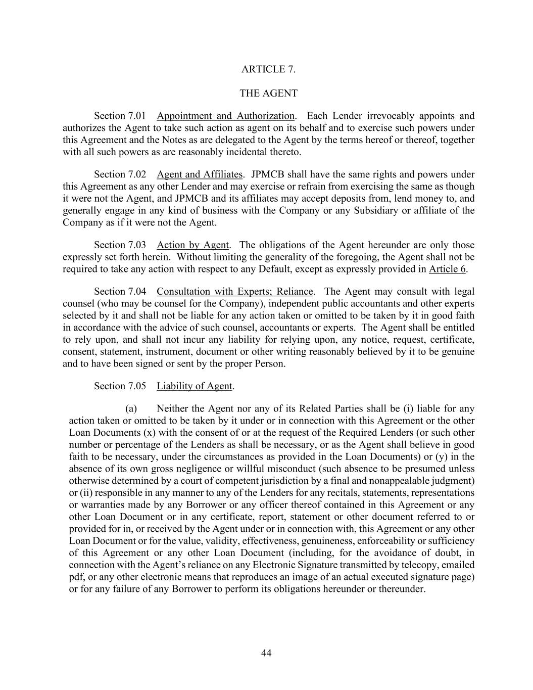 44 ARTICLE 7. THE AGENT Section 7.01 Appointment and Authorization. Each Lender irrevocably appoints and authorizes the Agent to take such action as agent on its behalf and to exercise such powers under this Agreement and the Notes as are delegated to the Agent by the terms hereof or thereof, together with all such powers as are reasonably incidental thereto. Section 7.02 Agent and Affiliates. JPMCB shall have the same rights and powers under this Agreement as any other Lender and may exercise or refrain from exercising the same as though it were not the Agent, and JPMCB and its affiliates may accept deposits from, lend money to, and generally engage in any kind of business with the Company or any Subsidiary or affiliate of the Company as if it were not the Agent. Section 7.03 Action by Agent. The obligations of the Agent hereunder are only those expressly set forth herein. Without limiting the generality of the foregoing, the Agent shall not be required to take any action with respect to any Default, except as expressly provided in Article 6. Section 7.04 Consultation with Experts; Reliance. The Agent may consult with legal counsel (who may be counsel for the Company), independent public accountants and other experts selected by it and shall not be liable for any action taken or omitted to be taken by it in good faith in accordance with the advice of such counsel, accountants or experts. The Agent shall be entitled to rely upon, and shall not incur any liability for relying upon, any notice, request, certificate, consent, statement, instrument, document or other writing reasonably believed by it to be genuine and to have been signed or sent by the proper Person. Section 7.05 Liability of Agent. (a) Neither the Agent nor any of its Related Parties shall be (i) liable for any action taken or omitted to be taken by it under or in connection with this Agreement or the other Loan Documents (x) with the consent of or at the request of the Required Lenders (or such other number or percentage of the Lenders as shall be necessary, or as the Agent shall believe in good faith to be necessary, under the circumstances as provided in the Loan Documents) or (y) in the absence of its own gross negligence or willful misconduct (such absence to be presumed unless otherwise determined by a court of competent jurisdiction by a final and nonappealable judgment) or (ii) responsible in any manner to any of the Lenders for any recitals, statements, representations or warranties made by any Borrower or any officer thereof contained in this Agreement or any other Loan Document or in any certificate, report, statement or other document referred to or provided for in, or received by the Agent under or in connection with, this Agreement or any other Loan Document or for the value, validity, effectiveness, genuineness, enforceability or sufficiency of this Agreement or any other Loan Document (including, for the avoidance of doubt, in connection with the Agent’s reliance on any Electronic Signature transmitted by telecopy, emailed pdf, or any other electronic means that reproduces an image of an actual executed signature page) or for any failure of any Borrower to perform its obligations hereunder or thereunder.