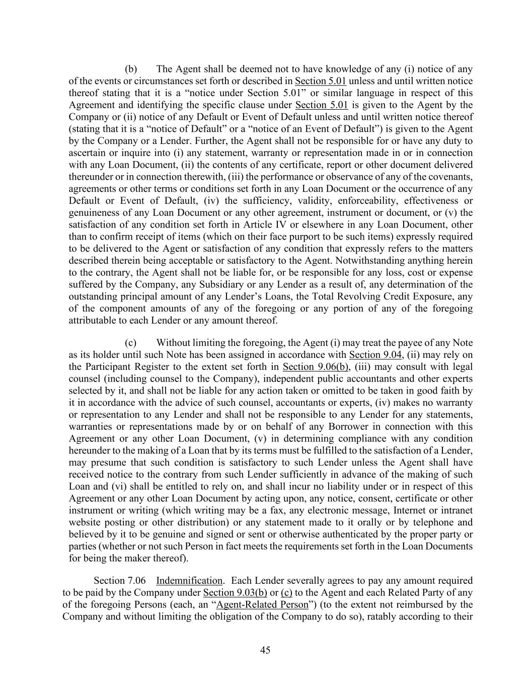 45 (b) The Agent shall be deemed not to have knowledge of any (i) notice of any of the events or circumstances set forth or described in Section 5.01 unless and until written notice thereof stating that it is a “notice under Section 5.01” or similar language in respect of this Agreement and identifying the specific clause under Section 5.01 is given to the Agent by the Company or (ii) notice of any Default or Event of Default unless and until written notice thereof (stating that it is a “notice of Default” or a “notice of an Event of Default”) is given to the Agent by the Company or a Lender. Further, the Agent shall not be responsible for or have any duty to ascertain or inquire into (i) any statement, warranty or representation made in or in connection with any Loan Document, (ii) the contents of any certificate, report or other document delivered thereunder or in connection therewith, (iii) the performance or observance of any of the covenants, agreements or other terms or conditions set forth in any Loan Document or the occurrence of any Default or Event of Default, (iv) the sufficiency, validity, enforceability, effectiveness or genuineness of any Loan Document or any other agreement, instrument or document, or (v) the satisfaction of any condition set forth in Article IV or elsewhere in any Loan Document, other than to confirm receipt of items (which on their face purport to be such items) expressly required to be delivered to the Agent or satisfaction of any condition that expressly refers to the matters described therein being acceptable or satisfactory to the Agent. Notwithstanding anything herein to the contrary, the Agent shall not be liable for, or be responsible for any loss, cost or expense suffered by the Company, any Subsidiary or any Lender as a result of, any determination of the outstanding principal amount of any Lender’s Loans, the Total Revolving Credit Exposure, any of the component amounts of any of the foregoing or any portion of any of the foregoing attributable to each Lender or any amount thereof. (c) Without limiting the foregoing, the Agent (i) may treat the payee of any Note as its holder until such Note has been assigned in accordance with Section 9.04, (ii) may rely on the Participant Register to the extent set forth in Section 9.06(b), (iii) may consult with legal counsel (including counsel to the Company), independent public accountants and other experts selected by it, and shall not be liable for any action taken or omitted to be taken in good faith by it in accordance with the advice of such counsel, accountants or experts, (iv) makes no warranty or representation to any Lender and shall not be responsible to any Lender for any statements, warranties or representations made by or on behalf of any Borrower in connection with this Agreement or any other Loan Document, (v) in determining compliance with any condition hereunder to the making of a Loan that by its terms must be fulfilled to the satisfaction of a Lender, may presume that such condition is satisfactory to such Lender unless the Agent shall have received notice to the contrary from such Lender sufficiently in advance of the making of such Loan and (vi) shall be entitled to rely on, and shall incur no liability under or in respect of this Agreement or any other Loan Document by acting upon, any notice, consent, certificate or other instrument or writing (which writing may be a fax, any electronic message, Internet or intranet website posting or other distribution) or any statement made to it orally or by telephone and believed by it to be genuine and signed or sent or otherwise authenticated by the proper party or parties (whether or not such Person in fact meets the requirements set forth in the Loan Documents for being the maker thereof). Section 7.06 Indemnification. Each Lender severally agrees to pay any amount required to be paid by the Company under Section 9.03(b) or (c) to the Agent and each Related Party of any of the foregoing Persons (each, an “Agent-Related Person”) (to the extent not reimbursed by the Company and without limiting the obligation of the Company to do so), ratably according to their