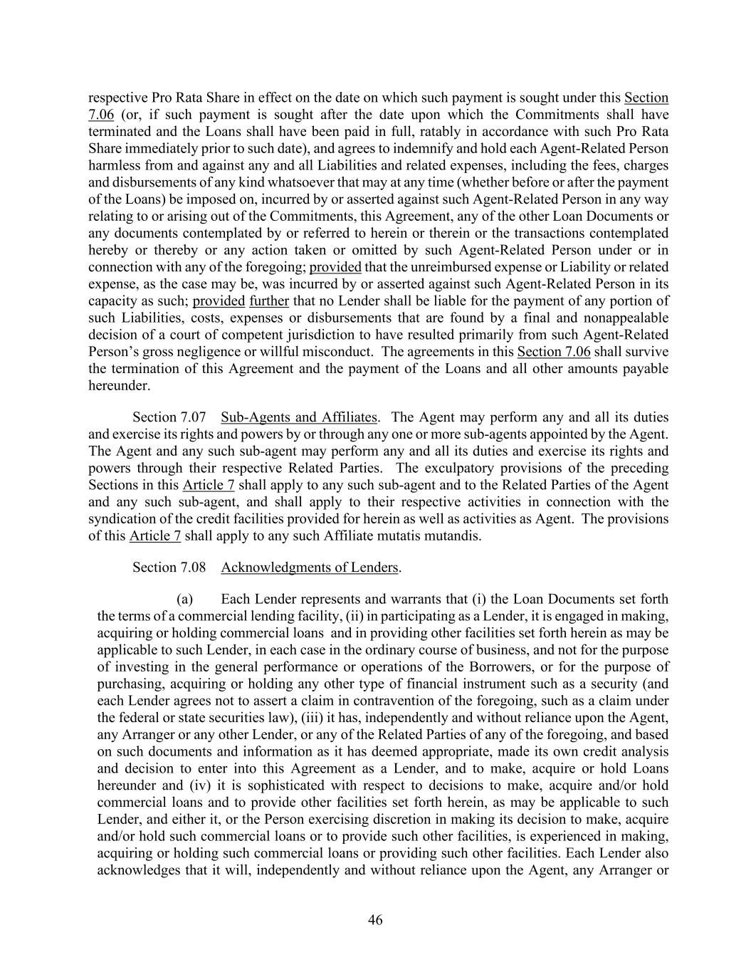 46 respective Pro Rata Share in effect on the date on which such payment is sought under this Section 7.06 (or, if such payment is sought after the date upon which the Commitments shall have terminated and the Loans shall have been paid in full, ratably in accordance with such Pro Rata Share immediately prior to such date), and agrees to indemnify and hold each Agent-Related Person harmless from and against any and all Liabilities and related expenses, including the fees, charges and disbursements of any kind whatsoever that may at any time (whether before or after the payment of the Loans) be imposed on, incurred by or asserted against such Agent-Related Person in any way relating to or arising out of the Commitments, this Agreement, any of the other Loan Documents or any documents contemplated by or referred to herein or therein or the transactions contemplated hereby or thereby or any action taken or omitted by such Agent-Related Person under or in connection with any of the foregoing; provided that the unreimbursed expense or Liability or related expense, as the case may be, was incurred by or asserted against such Agent-Related Person in its capacity as such; provided further that no Lender shall be liable for the payment of any portion of such Liabilities, costs, expenses or disbursements that are found by a final and nonappealable decision of a court of competent jurisdiction to have resulted primarily from such Agent-Related Person’s gross negligence or willful misconduct. The agreements in this Section 7.06 shall survive the termination of this Agreement and the payment of the Loans and all other amounts payable hereunder. Section 7.07 Sub-Agents and Affiliates. The Agent may perform any and all its duties and exercise its rights and powers by or through any one or more sub-agents appointed by the Agent. The Agent and any such sub-agent may perform any and all its duties and exercise its rights and powers through their respective Related Parties. The exculpatory provisions of the preceding Sections in this Article 7 shall apply to any such sub-agent and to the Related Parties of the Agent and any such sub-agent, and shall apply to their respective activities in connection with the syndication of the credit facilities provided for herein as well as activities as Agent. The provisions of this Article 7 shall apply to any such Affiliate mutatis mutandis. Section 7.08 Acknowledgments of Lenders. (a) Each Lender represents and warrants that (i) the Loan Documents set forth the terms of a commercial lending facility, (ii) in participating as a Lender, it is engaged in making, acquiring or holding commercial loans and in providing other facilities set forth herein as may be applicable to such Lender, in each case in the ordinary course of business, and not for the purpose of investing in the general performance or operations of the Borrowers, or for the purpose of purchasing, acquiring or holding any other type of financial instrument such as a security (and each Lender agrees not to assert a claim in contravention of the foregoing, such as a claim under the federal or state securities law), (iii) it has, independently and without reliance upon the Agent, any Arranger or any other Lender, or any of the Related Parties of any of the foregoing, and based on such documents and information as it has deemed appropriate, made its own credit analysis and decision to enter into this Agreement as a Lender, and to make, acquire or hold Loans hereunder and (iv) it is sophisticated with respect to decisions to make, acquire and/or hold commercial loans and to provide other facilities set forth herein, as may be applicable to such Lender, and either it, or the Person exercising discretion in making its decision to make, acquire and/or hold such commercial loans or to provide such other facilities, is experienced in making, acquiring or holding such commercial loans or providing such other facilities. Each Lender also acknowledges that it will, independently and without reliance upon the Agent, any Arranger or