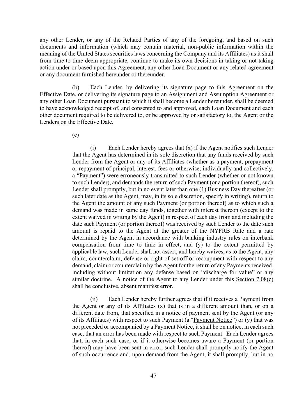 47 any other Lender, or any of the Related Parties of any of the foregoing, and based on such documents and information (which may contain material, non-public information within the meaning of the United States securities laws concerning the Company and its Affiliates) as it shall from time to time deem appropriate, continue to make its own decisions in taking or not taking action under or based upon this Agreement, any other Loan Document or any related agreement or any document furnished hereunder or thereunder. (b) Each Lender, by delivering its signature page to this Agreement on the Effective Date, or delivering its signature page to an Assignment and Assumption Agreement or any other Loan Document pursuant to which it shall become a Lender hereunder, shall be deemed to have acknowledged receipt of, and consented to and approved, each Loan Document and each other document required to be delivered to, or be approved by or satisfactory to, the Agent or the Lenders on the Effective Date. (c) (i) Each Lender hereby agrees that (x) if the Agent notifies such Lender that the Agent has determined in its sole discretion that any funds received by such Lender from the Agent or any of its Affiliates (whether as a payment, prepayment or repayment of principal, interest, fees or otherwise; individually and collectively, a “Payment”) were erroneously transmitted to such Lender (whether or not known to such Lender), and demands the return of such Payment (or a portion thereof), such Lender shall promptly, but in no event later than one (1) Business Day thereafter (or such later date as the Agent, may, in its sole discretion, specify in writing), return to the Agent the amount of any such Payment (or portion thereof) as to which such a demand was made in same day funds, together with interest thereon (except to the extent waived in writing by the Agent) in respect of each day from and including the date such Payment (or portion thereof) was received by such Lender to the date such amount is repaid to the Agent at the greater of the NYFRB Rate and a rate determined by the Agent in accordance with banking industry rules on interbank compensation from time to time in effect, and (y) to the extent permitted by applicable law, such Lender shall not assert, and hereby waives, as to the Agent, any claim, counterclaim, defense or right of set-off or recoupment with respect to any demand, claim or counterclaim by the Agent for the return of any Payments received, including without limitation any defense based on “discharge for value” or any similar doctrine. A notice of the Agent to any Lender under this Section 7.08(c) shall be conclusive, absent manifest error. (ii) Each Lender hereby further agrees that if it receives a Payment from the Agent or any of its Affiliates (x) that is in a different amount than, or on a different date from, that specified in a notice of payment sent by the Agent (or any of its Affiliates) with respect to such Payment (a “Payment Notice”) or (y) that was not preceded or accompanied by a Payment Notice, it shall be on notice, in each such case, that an error has been made with respect to such Payment. Each Lender agrees that, in each such case, or if it otherwise becomes aware a Payment (or portion thereof) may have been sent in error, such Lender shall promptly notify the Agent of such occurrence and, upon demand from the Agent, it shall promptly, but in no