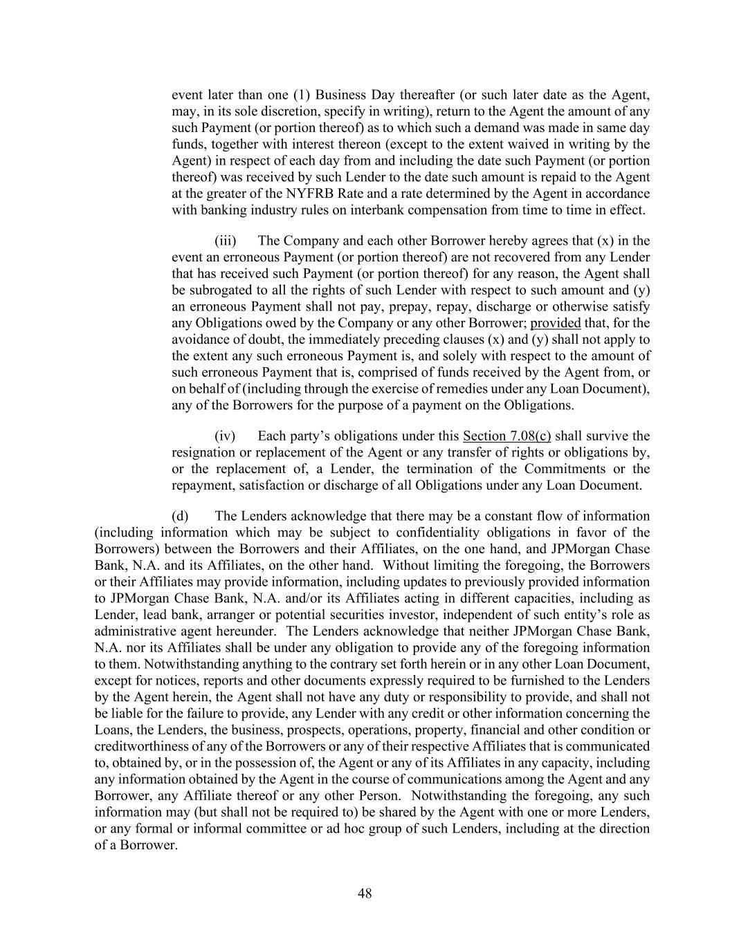 48 event later than one (1) Business Day thereafter (or such later date as the Agent, may, in its sole discretion, specify in writing), return to the Agent the amount of any such Payment (or portion thereof) as to which such a demand was made in same day funds, together with interest thereon (except to the extent waived in writing by the Agent) in respect of each day from and including the date such Payment (or portion thereof) was received by such Lender to the date such amount is repaid to the Agent at the greater of the NYFRB Rate and a rate determined by the Agent in accordance with banking industry rules on interbank compensation from time to time in effect. (iii) The Company and each other Borrower hereby agrees that (x) in the event an erroneous Payment (or portion thereof) are not recovered from any Lender that has received such Payment (or portion thereof) for any reason, the Agent shall be subrogated to all the rights of such Lender with respect to such amount and (y) an erroneous Payment shall not pay, prepay, repay, discharge or otherwise satisfy any Obligations owed by the Company or any other Borrower; provided that, for the avoidance of doubt, the immediately preceding clauses (x) and (y) shall not apply to the extent any such erroneous Payment is, and solely with respect to the amount of such erroneous Payment that is, comprised of funds received by the Agent from, or on behalf of (including through the exercise of remedies under any Loan Document), any of the Borrowers for the purpose of a payment on the Obligations. (iv) Each party’s obligations under this Section 7.08(c) shall survive the resignation or replacement of the Agent or any transfer of rights or obligations by, or the replacement of, a Lender, the termination of the Commitments or the repayment, satisfaction or discharge of all Obligations under any Loan Document. (d) The Lenders acknowledge that there may be a constant flow of information (including information which may be subject to confidentiality obligations in favor of the Borrowers) between the Borrowers and their Affiliates, on the one hand, and JPMorgan Chase Bank, N.A. and its Affiliates, on the other hand. Without limiting the foregoing, the Borrowers or their Affiliates may provide information, including updates to previously provided information to JPMorgan Chase Bank, N.A. and/or its Affiliates acting in different capacities, including as Lender, lead bank, arranger or potential securities investor, independent of such entity’s role as administrative agent hereunder. The Lenders acknowledge that neither JPMorgan Chase Bank, N.A. nor its Affiliates shall be under any obligation to provide any of the foregoing information to them. Notwithstanding anything to the contrary set forth herein or in any other Loan Document, except for notices, reports and other documents expressly required to be furnished to the Lenders by the Agent herein, the Agent shall not have any duty or responsibility to provide, and shall not be liable for the failure to provide, any Lender with any credit or other information concerning the Loans, the Lenders, the business, prospects, operations, property, financial and other condition or creditworthiness of any of the Borrowers or any of their respective Affiliates that is communicated to, obtained by, or in the possession of, the Agent or any of its Affiliates in any capacity, including any information obtained by the Agent in the course of communications among the Agent and any Borrower, any Affiliate thereof or any other Person. Notwithstanding the foregoing, any such information may (but shall not be required to) be shared by the Agent with one or more Lenders, or any formal or informal committee or ad hoc group of such Lenders, including at the direction of a Borrower.