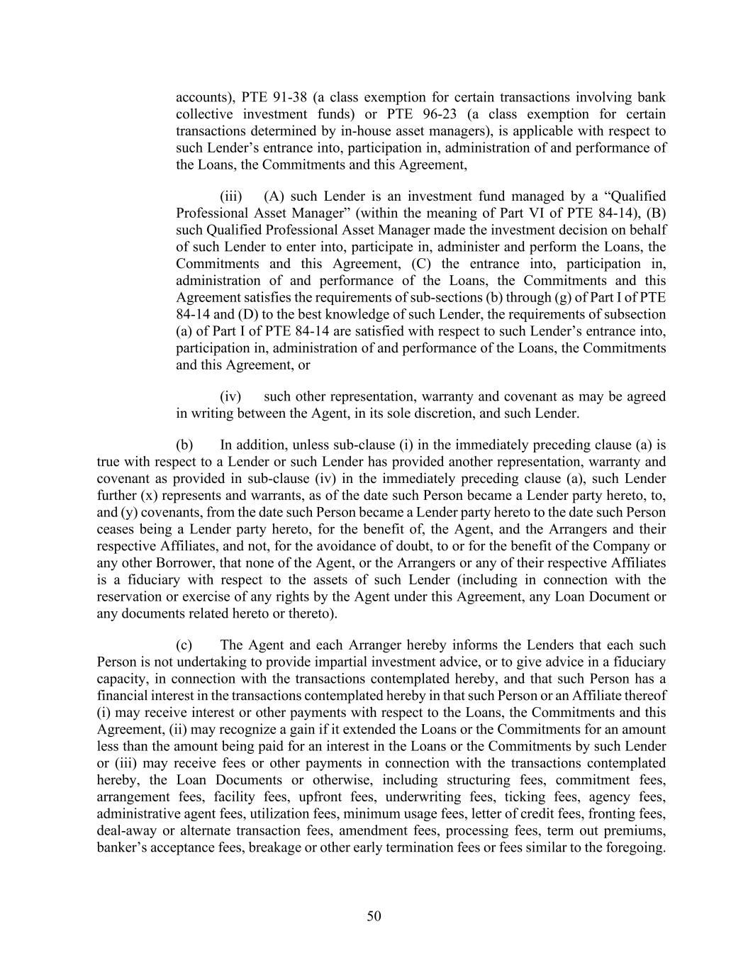 50 accounts), PTE 91-38 (a class exemption for certain transactions involving bank collective investment funds) or PTE 96-23 (a class exemption for certain transactions determined by in-house asset managers), is applicable with respect to such Lender’s entrance into, participation in, administration of and performance of the Loans, the Commitments and this Agreement, (iii) (A) such Lender is an investment fund managed by a “Qualified Professional Asset Manager” (within the meaning of Part VI of PTE 84-14), (B) such Qualified Professional Asset Manager made the investment decision on behalf of such Lender to enter into, participate in, administer and perform the Loans, the Commitments and this Agreement, (C) the entrance into, participation in, administration of and performance of the Loans, the Commitments and this Agreement satisfies the requirements of sub-sections (b) through (g) of Part I of PTE 84-14 and (D) to the best knowledge of such Lender, the requirements of subsection (a) of Part I of PTE 84-14 are satisfied with respect to such Lender’s entrance into, participation in, administration of and performance of the Loans, the Commitments and this Agreement, or (iv) such other representation, warranty and covenant as may be agreed in writing between the Agent, in its sole discretion, and such Lender. (b) In addition, unless sub-clause (i) in the immediately preceding clause (a) is true with respect to a Lender or such Lender has provided another representation, warranty and covenant as provided in sub-clause (iv) in the immediately preceding clause (a), such Lender further (x) represents and warrants, as of the date such Person became a Lender party hereto, to, and (y) covenants, from the date such Person became a Lender party hereto to the date such Person ceases being a Lender party hereto, for the benefit of, the Agent, and the Arrangers and their respective Affiliates, and not, for the avoidance of doubt, to or for the benefit of the Company or any other Borrower, that none of the Agent, or the Arrangers or any of their respective Affiliates is a fiduciary with respect to the assets of such Lender (including in connection with the reservation or exercise of any rights by the Agent under this Agreement, any Loan Document or any documents related hereto or thereto). (c) The Agent and each Arranger hereby informs the Lenders that each such Person is not undertaking to provide impartial investment advice, or to give advice in a fiduciary capacity, in connection with the transactions contemplated hereby, and that such Person has a financial interest in the transactions contemplated hereby in that such Person or an Affiliate thereof (i) may receive interest or other payments with respect to the Loans, the Commitments and this Agreement, (ii) may recognize a gain if it extended the Loans or the Commitments for an amount less than the amount being paid for an interest in the Loans or the Commitments by such Lender or (iii) may receive fees or other payments in connection with the transactions contemplated hereby, the Loan Documents or otherwise, including structuring fees, commitment fees, arrangement fees, facility fees, upfront fees, underwriting fees, ticking fees, agency fees, administrative agent fees, utilization fees, minimum usage fees, letter of credit fees, fronting fees, deal-away or alternate transaction fees, amendment fees, processing fees, term out premiums, banker’s acceptance fees, breakage or other early termination fees or fees similar to the foregoing.