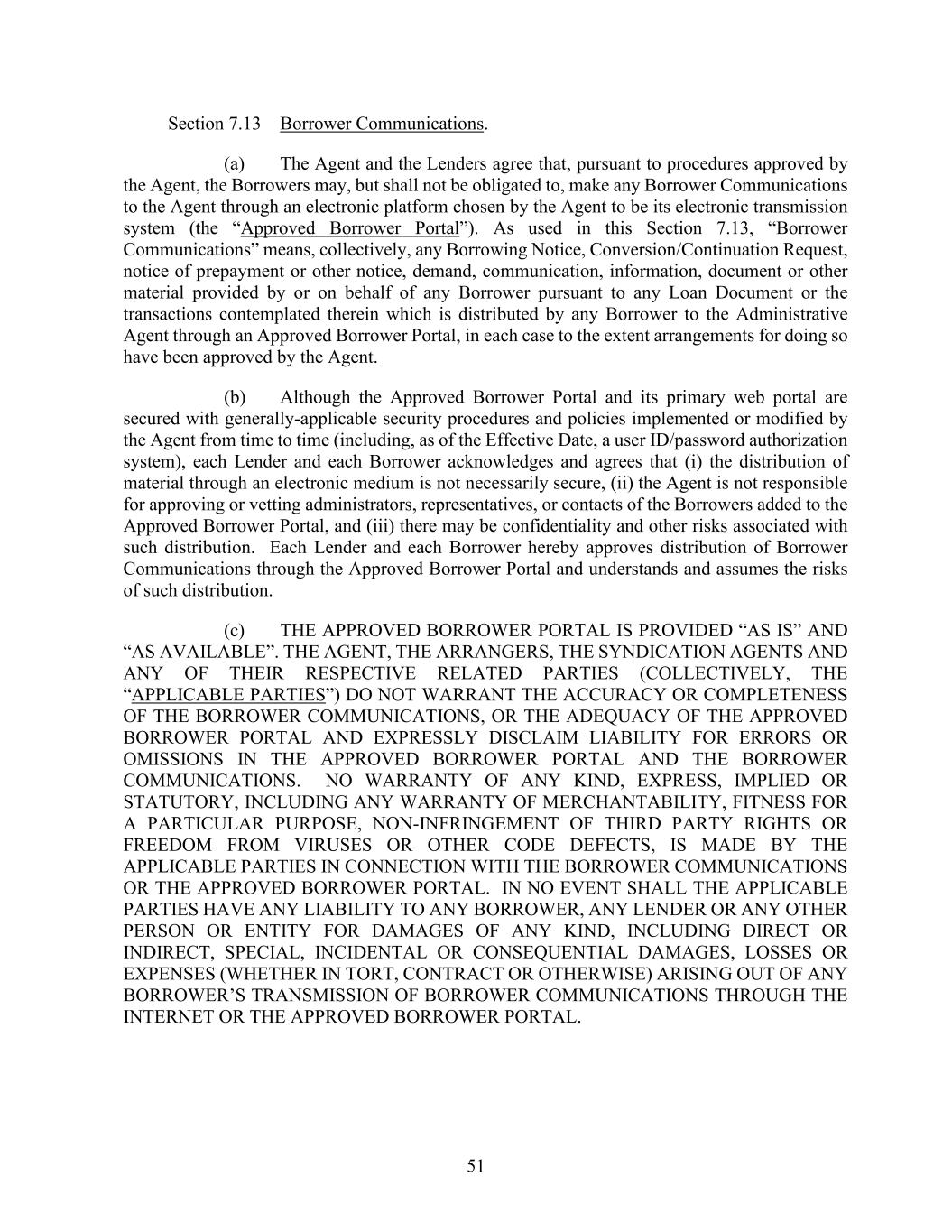 51 Section 7.13 Borrower Communications. (a) The Agent and the Lenders agree that, pursuant to procedures approved by the Agent, the Borrowers may, but shall not be obligated to, make any Borrower Communications to the Agent through an electronic platform chosen by the Agent to be its electronic transmission system (the “Approved Borrower Portal”). As used in this Section 7.13, “Borrower Communications” means, collectively, any Borrowing Notice, Conversion/Continuation Request, notice of prepayment or other notice, demand, communication, information, document or other material provided by or on behalf of any Borrower pursuant to any Loan Document or the transactions contemplated therein which is distributed by any Borrower to the Administrative Agent through an Approved Borrower Portal, in each case to the extent arrangements for doing so have been approved by the Agent. (b) Although the Approved Borrower Portal and its primary web portal are secured with generally-applicable security procedures and policies implemented or modified by the Agent from time to time (including, as of the Effective Date, a user ID/password authorization system), each Lender and each Borrower acknowledges and agrees that (i) the distribution of material through an electronic medium is not necessarily secure, (ii) the Agent is not responsible for approving or vetting administrators, representatives, or contacts of the Borrowers added to the Approved Borrower Portal, and (iii) there may be confidentiality and other risks associated with such distribution. Each Lender and each Borrower hereby approves distribution of Borrower Communications through the Approved Borrower Portal and understands and assumes the risks of such distribution. (c) THE APPROVED BORROWER PORTAL IS PROVIDED “AS IS” AND “AS AVAILABLE”. THE AGENT, THE ARRANGERS, THE SYNDICATION AGENTS AND ANY OF THEIR RESPECTIVE RELATED PARTIES (COLLECTIVELY, THE “APPLICABLE PARTIES”) DO NOT WARRANT THE ACCURACY OR COMPLETENESS OF THE BORROWER COMMUNICATIONS, OR THE ADEQUACY OF THE APPROVED BORROWER PORTAL AND EXPRESSLY DISCLAIM LIABILITY FOR ERRORS OR OMISSIONS IN THE APPROVED BORROWER PORTAL AND THE BORROWER COMMUNICATIONS. NO WARRANTY OF ANY KIND, EXPRESS, IMPLIED OR STATUTORY, INCLUDING ANY WARRANTY OF MERCHANTABILITY, FITNESS FOR A PARTICULAR PURPOSE, NON-INFRINGEMENT OF THIRD PARTY RIGHTS OR FREEDOM FROM VIRUSES OR OTHER CODE DEFECTS, IS MADE BY THE APPLICABLE PARTIES IN CONNECTION WITH THE BORROWER COMMUNICATIONS OR THE APPROVED BORROWER PORTAL. IN NO EVENT SHALL THE APPLICABLE PARTIES HAVE ANY LIABILITY TO ANY BORROWER, ANY LENDER OR ANY OTHER PERSON OR ENTITY FOR DAMAGES OF ANY KIND, INCLUDING DIRECT OR INDIRECT, SPECIAL, INCIDENTAL OR CONSEQUENTIAL DAMAGES, LOSSES OR EXPENSES (WHETHER IN TORT, CONTRACT OR OTHERWISE) ARISING OUT OF ANY BORROWER’S TRANSMISSION OF BORROWER COMMUNICATIONS THROUGH THE INTERNET OR THE APPROVED BORROWER PORTAL.