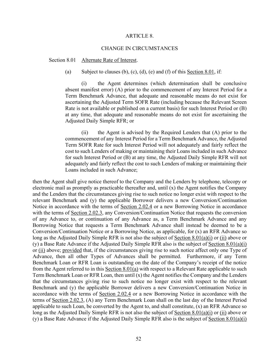 52 ARTICLE 8. CHANGE IN CIRCUMSTANCES Section 8.01 Alternate Rate of Interest. (a) Subject to clauses (b), (c), (d), (e) and (f) of this Section 8.01, if: (i) the Agent determines (which determination shall be conclusive absent manifest error) (A) prior to the commencement of any Interest Period for a Term Benchmark Advance, that adequate and reasonable means do not exist for ascertaining the Adjusted Term SOFR Rate (including because the Relevant Screen Rate is not available or published on a current basis) for such Interest Period or (B) at any time, that adequate and reasonable means do not exist for ascertaining the Adjusted Daily Simple RFR; or (ii) the Agent is advised by the Required Lenders that (A) prior to the commencement of any Interest Period for a Term Benchmark Advance, the Adjusted Term SOFR Rate for such Interest Period will not adequately and fairly reflect the cost to such Lenders of making or maintaining their Loans included in such Advance for such Interest Period or (B) at any time, the Adjusted Daily Simple RFR will not adequately and fairly reflect the cost to such Lenders of making or maintaining their Loans included in such Advance; then the Agent shall give notice thereof to the Company and the Lenders by telephone, telecopy or electronic mail as promptly as practicable thereafter and, until (x) the Agent notifies the Company and the Lenders that the circumstances giving rise to such notice no longer exist with respect to the relevant Benchmark and (y) the applicable Borrower delivers a new Conversion/Continuation Notice in accordance with the terms of Section 2.02.4 or a new Borrowing Notice in accordance with the terms of Section 2.02.3, any Conversion/Continuation Notice that requests the conversion of any Advance to, or continuation of any Advance as, a Term Benchmark Advance and any Borrowing Notice that requests a Term Benchmark Advance shall instead be deemed to be a Conversion/Continuation Notice or a Borrowing Notice, as applicable, for (x) an RFR Advance so long as the Adjusted Daily Simple RFR is not also the subject of Section 8.01(a)(i) or (ii) above or (y) a Base Rate Advance if the Adjusted Daily Simple RFR also is the subject of Section 8.01(a)(i) or (ii) above; provided that, if the circumstances giving rise to such notice affect only one Type of Advance, then all other Types of Advances shall be permitted. Furthermore, if any Term Benchmark Loan or RFR Loan is outstanding on the date of the Company’s receipt of the notice from the Agent referred to in this Section 8.01(a) with respect to a Relevant Rate applicable to such Term Benchmark Loan or RFR Loan, then until (x) the Agent notifies the Company and the Lenders that the circumstances giving rise to such notice no longer exist with respect to the relevant Benchmark and (y) the applicable Borrower delivers a new Conversion/Continuation Notice in accordance with the terms of Section 2.02.4 or a new Borrowing Notice in accordance with the terms of Section 2.02.3, (A) any Term Benchmark Loan shall on the last day of the Interest Period applicable to such Loan, be converted by the Agent to, and shall constitute, (x) an RFR Advance so long as the Adjusted Daily Simple RFR is not also the subject of Section 8.01(a)(i) or (ii) above or (y) a Base Rate Advance if the Adjusted Daily Simple RFR also is the subject of Section 8.01(a)(i)