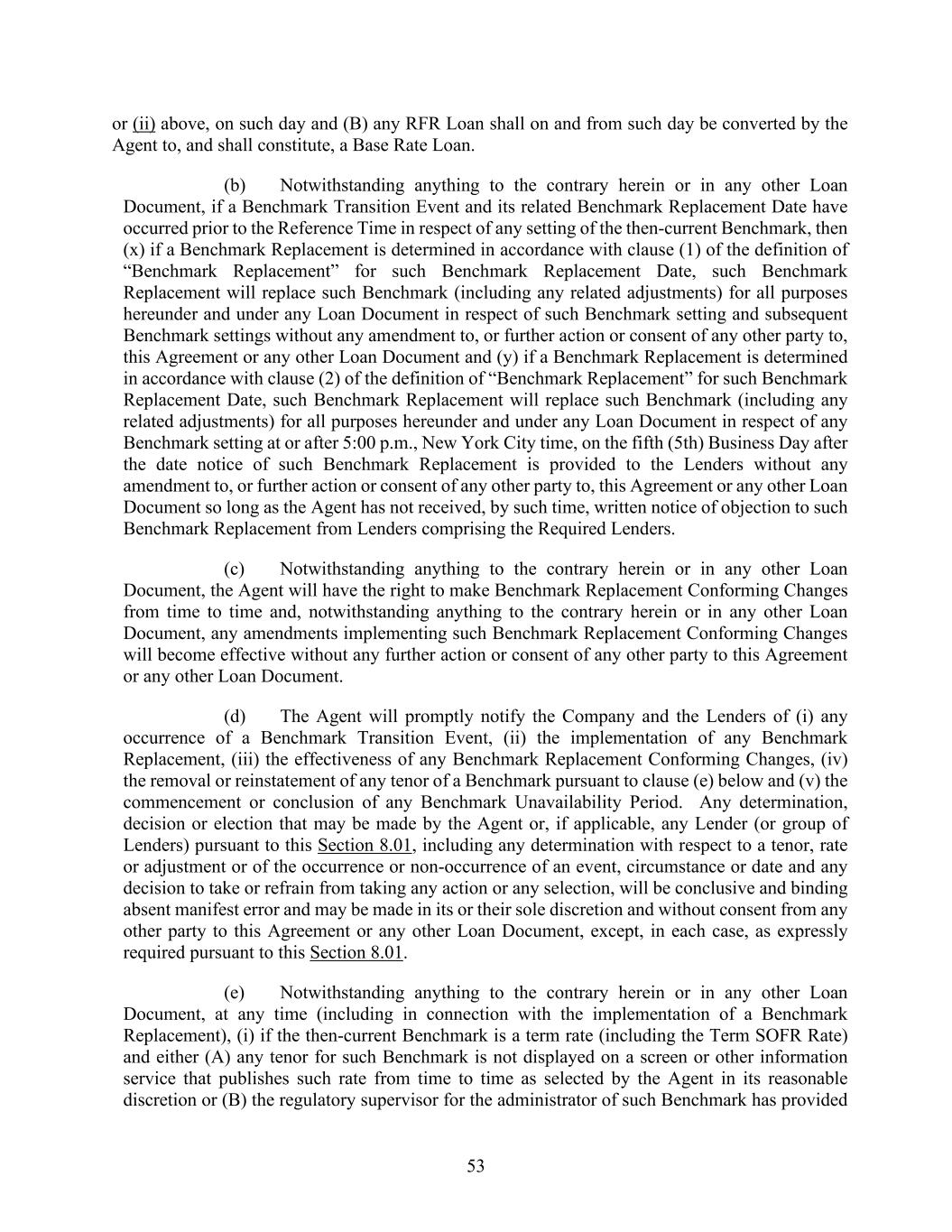 53 or (ii) above, on such day and (B) any RFR Loan shall on and from such day be converted by the Agent to, and shall constitute, a Base Rate Loan. (b) Notwithstanding anything to the contrary herein or in any other Loan Document, if a Benchmark Transition Event and its related Benchmark Replacement Date have occurred prior to the Reference Time in respect of any setting of the then-current Benchmark, then (x) if a Benchmark Replacement is determined in accordance with clause (1) of the definition of “Benchmark Replacement” for such Benchmark Replacement Date, such Benchmark Replacement will replace such Benchmark (including any related adjustments) for all purposes hereunder and under any Loan Document in respect of such Benchmark setting and subsequent Benchmark settings without any amendment to, or further action or consent of any other party to, this Agreement or any other Loan Document and (y) if a Benchmark Replacement is determined in accordance with clause (2) of the definition of “Benchmark Replacement” for such Benchmark Replacement Date, such Benchmark Replacement will replace such Benchmark (including any related adjustments) for all purposes hereunder and under any Loan Document in respect of any Benchmark setting at or after 5:00 p.m., New York City time, on the fifth (5th) Business Day after the date notice of such Benchmark Replacement is provided to the Lenders without any amendment to, or further action or consent of any other party to, this Agreement or any other Loan Document so long as the Agent has not received, by such time, written notice of objection to such Benchmark Replacement from Lenders comprising the Required Lenders. (c) Notwithstanding anything to the contrary herein or in any other Loan Document, the Agent will have the right to make Benchmark Replacement Conforming Changes from time to time and, notwithstanding anything to the contrary herein or in any other Loan Document, any amendments implementing such Benchmark Replacement Conforming Changes will become effective without any further action or consent of any other party to this Agreement or any other Loan Document. (d) The Agent will promptly notify the Company and the Lenders of (i) any occurrence of a Benchmark Transition Event, (ii) the implementation of any Benchmark Replacement, (iii) the effectiveness of any Benchmark Replacement Conforming Changes, (iv) the removal or reinstatement of any tenor of a Benchmark pursuant to clause (e) below and (v) the commencement or conclusion of any Benchmark Unavailability Period. Any determination, decision or election that may be made by the Agent or, if applicable, any Lender (or group of Lenders) pursuant to this Section 8.01, including any determination with respect to a tenor, rate or adjustment or of the occurrence or non-occurrence of an event, circumstance or date and any decision to take or refrain from taking any action or any selection, will be conclusive and binding absent manifest error and may be made in its or their sole discretion and without consent from any other party to this Agreement or any other Loan Document, except, in each case, as expressly required pursuant to this Section 8.01. (e) Notwithstanding anything to the contrary herein or in any other Loan Document, at any time (including in connection with the implementation of a Benchmark Replacement), (i) if the then-current Benchmark is a term rate (including the Term SOFR Rate) and either (A) any tenor for such Benchmark is not displayed on a screen or other information service that publishes such rate from time to time as selected by the Agent in its reasonable discretion or (B) the regulatory supervisor for the administrator of such Benchmark has provided