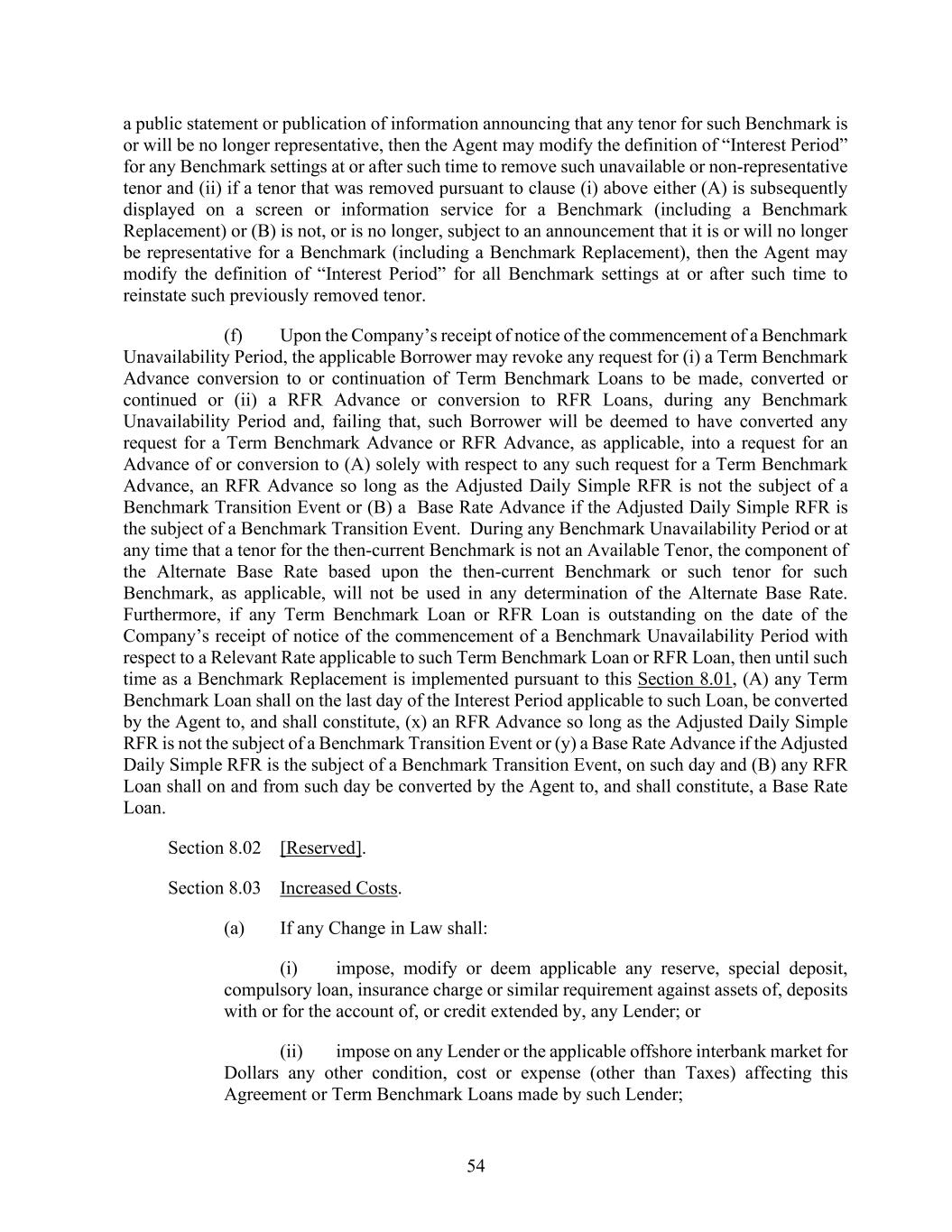 54 a public statement or publication of information announcing that any tenor for such Benchmark is or will be no longer representative, then the Agent may modify the definition of “Interest Period” for any Benchmark settings at or after such time to remove such unavailable or non-representative tenor and (ii) if a tenor that was removed pursuant to clause (i) above either (A) is subsequently displayed on a screen or information service for a Benchmark (including a Benchmark Replacement) or (B) is not, or is no longer, subject to an announcement that it is or will no longer be representative for a Benchmark (including a Benchmark Replacement), then the Agent may modify the definition of “Interest Period” for all Benchmark settings at or after such time to reinstate such previously removed tenor. (f) Upon the Company’s receipt of notice of the commencement of a Benchmark Unavailability Period, the applicable Borrower may revoke any request for (i) a Term Benchmark Advance conversion to or continuation of Term Benchmark Loans to be made, converted or continued or (ii) a RFR Advance or conversion to RFR Loans, during any Benchmark Unavailability Period and, failing that, such Borrower will be deemed to have converted any request for a Term Benchmark Advance or RFR Advance, as applicable, into a request for an Advance of or conversion to (A) solely with respect to any such request for a Term Benchmark Advance, an RFR Advance so long as the Adjusted Daily Simple RFR is not the subject of a Benchmark Transition Event or (B) a Base Rate Advance if the Adjusted Daily Simple RFR is the subject of a Benchmark Transition Event. During any Benchmark Unavailability Period or at any time that a tenor for the then-current Benchmark is not an Available Tenor, the component of the Alternate Base Rate based upon the then-current Benchmark or such tenor for such Benchmark, as applicable, will not be used in any determination of the Alternate Base Rate. Furthermore, if any Term Benchmark Loan or RFR Loan is outstanding on the date of the Company’s receipt of notice of the commencement of a Benchmark Unavailability Period with respect to a Relevant Rate applicable to such Term Benchmark Loan or RFR Loan, then until such time as a Benchmark Replacement is implemented pursuant to this Section 8.01, (A) any Term Benchmark Loan shall on the last day of the Interest Period applicable to such Loan, be converted by the Agent to, and shall constitute, (x) an RFR Advance so long as the Adjusted Daily Simple RFR is not the subject of a Benchmark Transition Event or (y) a Base Rate Advance if the Adjusted Daily Simple RFR is the subject of a Benchmark Transition Event, on such day and (B) any RFR Loan shall on and from such day be converted by the Agent to, and shall constitute, a Base Rate Loan. Section 8.02 [Reserved]. Section 8.03 Increased Costs. (a) If any Change in Law shall: (i) impose, modify or deem applicable any reserve, special deposit, compulsory loan, insurance charge or similar requirement against assets of, deposits with or for the account of, or credit extended by, any Lender; or (ii) impose on any Lender or the applicable offshore interbank market for Dollars any other condition, cost or expense (other than Taxes) affecting this Agreement or Term Benchmark Loans made by such Lender;
