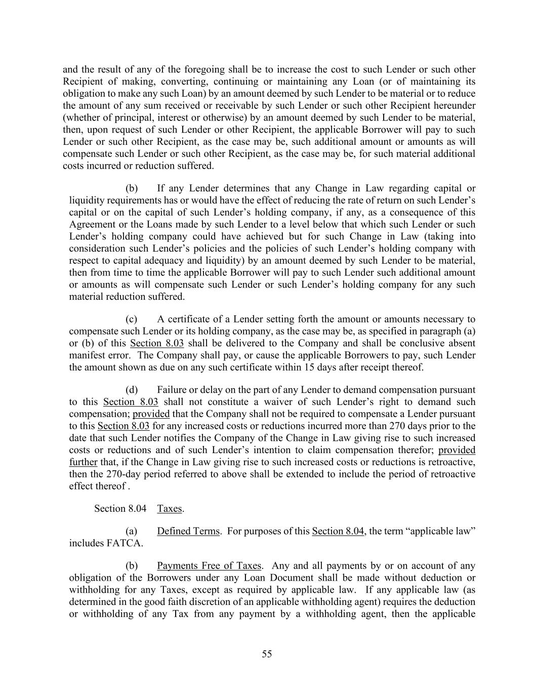 55 and the result of any of the foregoing shall be to increase the cost to such Lender or such other Recipient of making, converting, continuing or maintaining any Loan (or of maintaining its obligation to make any such Loan) by an amount deemed by such Lender to be material or to reduce the amount of any sum received or receivable by such Lender or such other Recipient hereunder (whether of principal, interest or otherwise) by an amount deemed by such Lender to be material, then, upon request of such Lender or other Recipient, the applicable Borrower will pay to such Lender or such other Recipient, as the case may be, such additional amount or amounts as will compensate such Lender or such other Recipient, as the case may be, for such material additional costs incurred or reduction suffered. (b) If any Lender determines that any Change in Law regarding capital or liquidity requirements has or would have the effect of reducing the rate of return on such Lender’s capital or on the capital of such Lender’s holding company, if any, as a consequence of this Agreement or the Loans made by such Lender to a level below that which such Lender or such Lender’s holding company could have achieved but for such Change in Law (taking into consideration such Lender’s policies and the policies of such Lender’s holding company with respect to capital adequacy and liquidity) by an amount deemed by such Lender to be material, then from time to time the applicable Borrower will pay to such Lender such additional amount or amounts as will compensate such Lender or such Lender’s holding company for any such material reduction suffered. (c) A certificate of a Lender setting forth the amount or amounts necessary to compensate such Lender or its holding company, as the case may be, as specified in paragraph (a) or (b) of this Section 8.03 shall be delivered to the Company and shall be conclusive absent manifest error. The Company shall pay, or cause the applicable Borrowers to pay, such Lender the amount shown as due on any such certificate within 15 days after receipt thereof. (d) Failure or delay on the part of any Lender to demand compensation pursuant to this Section 8.03 shall not constitute a waiver of such Lender’s right to demand such compensation; provided that the Company shall not be required to compensate a Lender pursuant to this Section 8.03 for any increased costs or reductions incurred more than 270 days prior to the date that such Lender notifies the Company of the Change in Law giving rise to such increased costs or reductions and of such Lender’s intention to claim compensation therefor; provided further that, if the Change in Law giving rise to such increased costs or reductions is retroactive, then the 270-day period referred to above shall be extended to include the period of retroactive effect thereof . Section 8.04 Taxes. (a) Defined Terms. For purposes of this Section 8.04, the term “applicable law” includes FATCA. (b) Payments Free of Taxes. Any and all payments by or on account of any obligation of the Borrowers under any Loan Document shall be made without deduction or withholding for any Taxes, except as required by applicable law. If any applicable law (as determined in the good faith discretion of an applicable withholding agent) requires the deduction or withholding of any Tax from any payment by a withholding agent, then the applicable