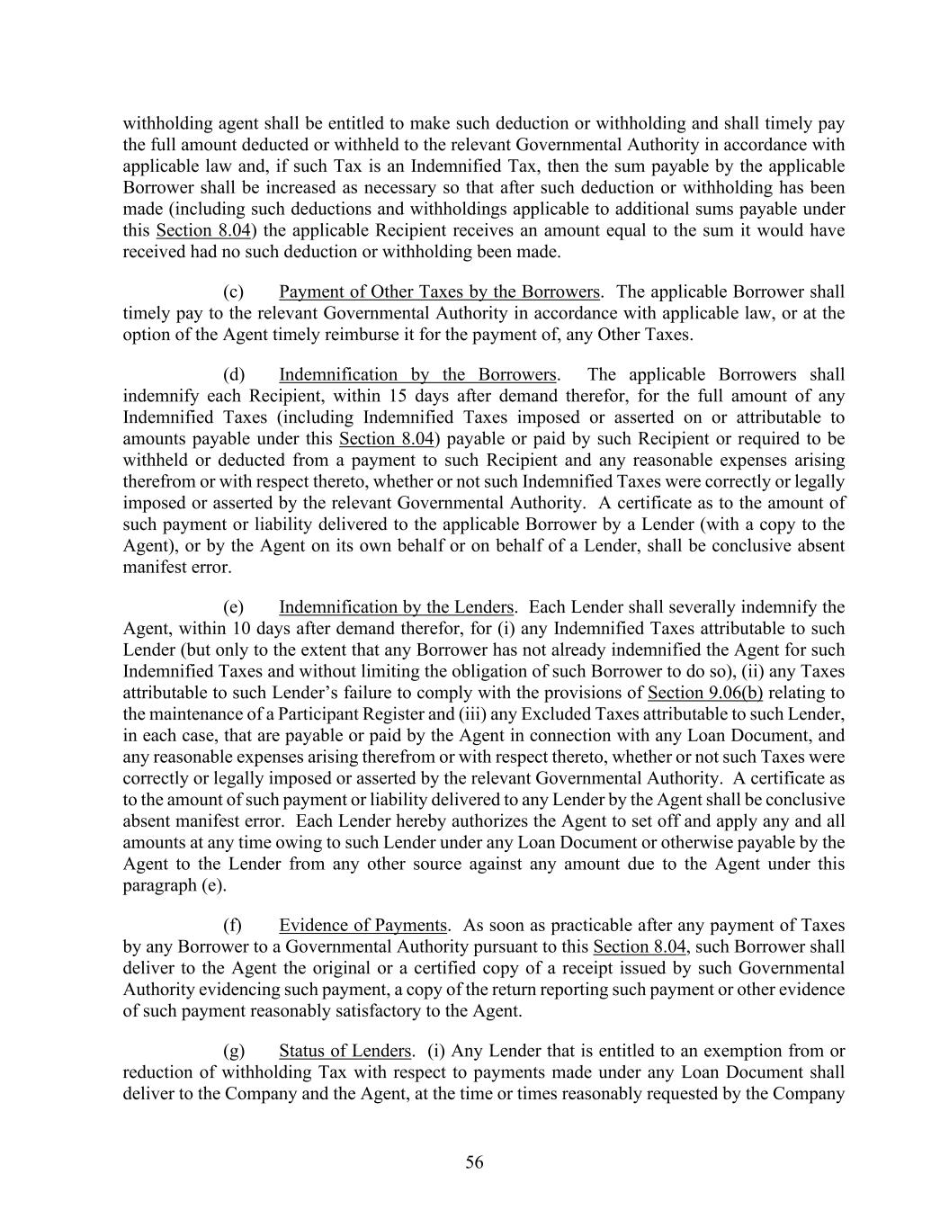 56 withholding agent shall be entitled to make such deduction or withholding and shall timely pay the full amount deducted or withheld to the relevant Governmental Authority in accordance with applicable law and, if such Tax is an Indemnified Tax, then the sum payable by the applicable Borrower shall be increased as necessary so that after such deduction or withholding has been made (including such deductions and withholdings applicable to additional sums payable under this Section 8.04) the applicable Recipient receives an amount equal to the sum it would have received had no such deduction or withholding been made. (c) Payment of Other Taxes by the Borrowers. The applicable Borrower shall timely pay to the relevant Governmental Authority in accordance with applicable law, or at the option of the Agent timely reimburse it for the payment of, any Other Taxes. (d) Indemnification by the Borrowers. The applicable Borrowers shall indemnify each Recipient, within 15 days after demand therefor, for the full amount of any Indemnified Taxes (including Indemnified Taxes imposed or asserted on or attributable to amounts payable under this Section 8.04) payable or paid by such Recipient or required to be withheld or deducted from a payment to such Recipient and any reasonable expenses arising therefrom or with respect thereto, whether or not such Indemnified Taxes were correctly or legally imposed or asserted by the relevant Governmental Authority. A certificate as to the amount of such payment or liability delivered to the applicable Borrower by a Lender (with a copy to the Agent), or by the Agent on its own behalf or on behalf of a Lender, shall be conclusive absent manifest error. (e) Indemnification by the Lenders. Each Lender shall severally indemnify the Agent, within 10 days after demand therefor, for (i) any Indemnified Taxes attributable to such Lender (but only to the extent that any Borrower has not already indemnified the Agent for such Indemnified Taxes and without limiting the obligation of such Borrower to do so), (ii) any Taxes attributable to such Lender’s failure to comply with the provisions of Section 9.06(b) relating to the maintenance of a Participant Register and (iii) any Excluded Taxes attributable to such Lender, in each case, that are payable or paid by the Agent in connection with any Loan Document, and any reasonable expenses arising therefrom or with respect thereto, whether or not such Taxes were correctly or legally imposed or asserted by the relevant Governmental Authority. A certificate as to the amount of such payment or liability delivered to any Lender by the Agent shall be conclusive absent manifest error. Each Lender hereby authorizes the Agent to set off and apply any and all amounts at any time owing to such Lender under any Loan Document or otherwise payable by the Agent to the Lender from any other source against any amount due to the Agent under this paragraph (e). (f) Evidence of Payments. As soon as practicable after any payment of Taxes by any Borrower to a Governmental Authority pursuant to this Section 8.04, such Borrower shall deliver to the Agent the original or a certified copy of a receipt issued by such Governmental Authority evidencing such payment, a copy of the return reporting such payment or other evidence of such payment reasonably satisfactory to the Agent. (g) Status of Lenders. (i) Any Lender that is entitled to an exemption from or reduction of withholding Tax with respect to payments made under any Loan Document shall deliver to the Company and the Agent, at the time or times reasonably requested by the Company