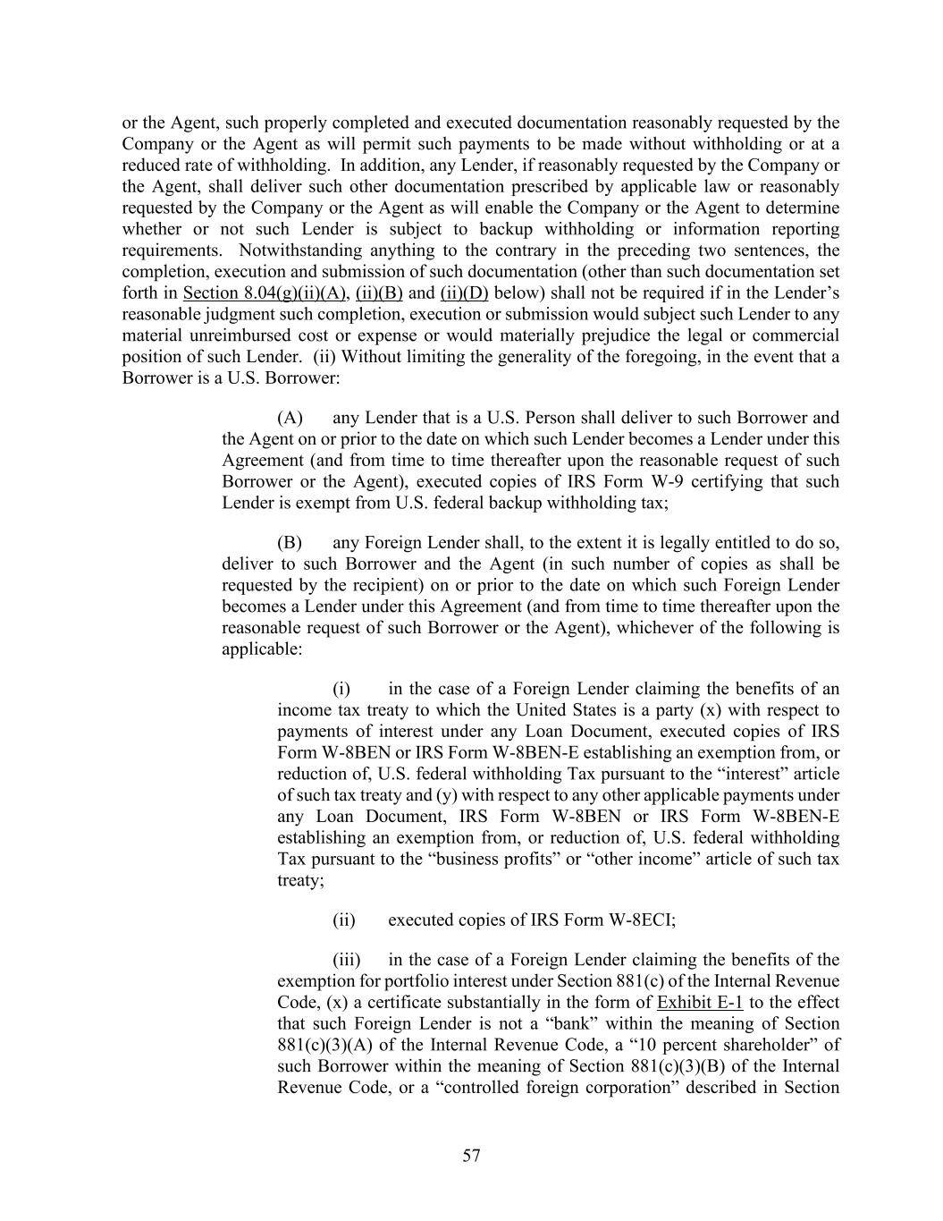 57 or the Agent, such properly completed and executed documentation reasonably requested by the Company or the Agent as will permit such payments to be made without withholding or at a reduced rate of withholding. In addition, any Lender, if reasonably requested by the Company or the Agent, shall deliver such other documentation prescribed by applicable law or reasonably requested by the Company or the Agent as will enable the Company or the Agent to determine whether or not such Lender is subject to backup withholding or information reporting requirements. Notwithstanding anything to the contrary in the preceding two sentences, the completion, execution and submission of such documentation (other than such documentation set forth in Section 8.04(g)(ii)(A), (ii)(B) and (ii)(D) below) shall not be required if in the Lender’s reasonable judgment such completion, execution or submission would subject such Lender to any material unreimbursed cost or expense or would materially prejudice the legal or commercial position of such Lender. (ii) Without limiting the generality of the foregoing, in the event that a Borrower is a U.S. Borrower: (A) any Lender that is a U.S. Person shall deliver to such Borrower and the Agent on or prior to the date on which such Lender becomes a Lender under this Agreement (and from time to time thereafter upon the reasonable request of such Borrower or the Agent), executed copies of IRS Form W-9 certifying that such Lender is exempt from U.S. federal backup withholding tax; (B) any Foreign Lender shall, to the extent it is legally entitled to do so, deliver to such Borrower and the Agent (in such number of copies as shall be requested by the recipient) on or prior to the date on which such Foreign Lender becomes a Lender under this Agreement (and from time to time thereafter upon the reasonable request of such Borrower or the Agent), whichever of the following is applicable: (i) in the case of a Foreign Lender claiming the benefits of an income tax treaty to which the United States is a party (x) with respect to payments of interest under any Loan Document, executed copies of IRS Form W-8BEN or IRS Form W-8BEN-E establishing an exemption from, or reduction of, U.S. federal withholding Tax pursuant to the “interest” article of such tax treaty and (y) with respect to any other applicable payments under any Loan Document, IRS Form W-8BEN or IRS Form W-8BEN-E establishing an exemption from, or reduction of, U.S. federal withholding Tax pursuant to the “business profits” or “other income” article of such tax treaty; (ii) executed copies of IRS Form W-8ECI; (iii) in the case of a Foreign Lender claiming the benefits of the exemption for portfolio interest under Section 881(c) of the Internal Revenue Code, (x) a certificate substantially in the form of Exhibit E-1 to the effect that such Foreign Lender is not a “bank” within the meaning of Section 881(c)(3)(A) of the Internal Revenue Code, a “10 percent shareholder” of such Borrower within the meaning of Section 881(c)(3)(B) of the Internal Revenue Code, or a “controlled foreign corporation” described in Section