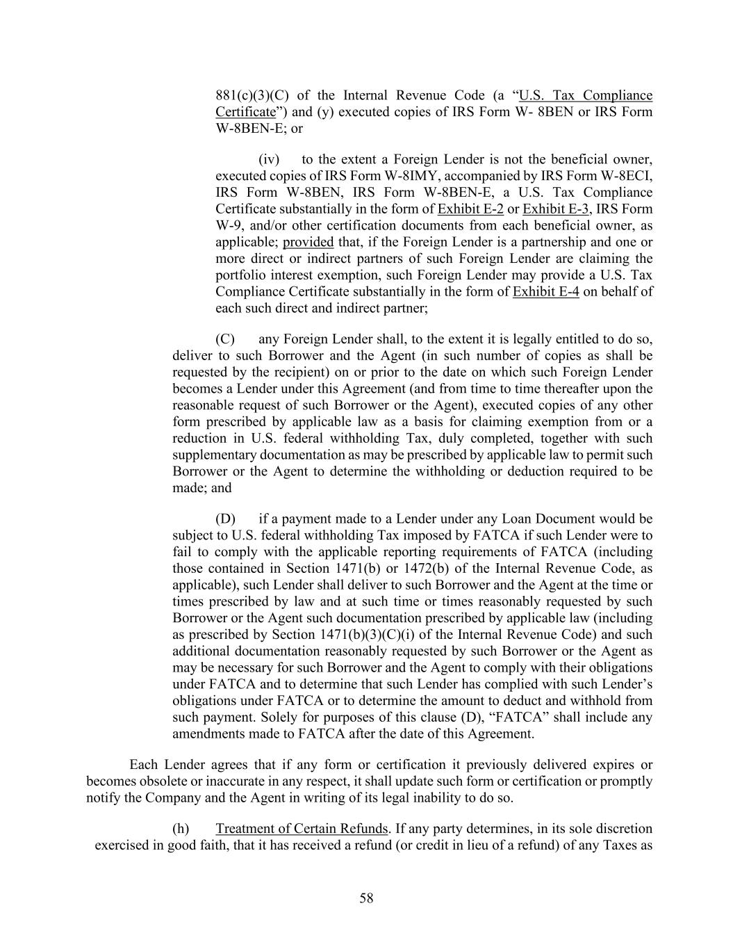 58 881(c)(3)(C) of the Internal Revenue Code (a “U.S. Tax Compliance Certificate”) and (y) executed copies of IRS Form W- 8BEN or IRS Form W-8BEN-E; or (iv) to the extent a Foreign Lender is not the beneficial owner, executed copies of IRS Form W-8IMY, accompanied by IRS Form W-8ECI, IRS Form W-8BEN, IRS Form W-8BEN-E, a U.S. Tax Compliance Certificate substantially in the form of Exhibit E-2 or Exhibit E-3, IRS Form W-9, and/or other certification documents from each beneficial owner, as applicable; provided that, if the Foreign Lender is a partnership and one or more direct or indirect partners of such Foreign Lender are claiming the portfolio interest exemption, such Foreign Lender may provide a U.S. Tax Compliance Certificate substantially in the form of Exhibit E-4 on behalf of each such direct and indirect partner; (C) any Foreign Lender shall, to the extent it is legally entitled to do so, deliver to such Borrower and the Agent (in such number of copies as shall be requested by the recipient) on or prior to the date on which such Foreign Lender becomes a Lender under this Agreement (and from time to time thereafter upon the reasonable request of such Borrower or the Agent), executed copies of any other form prescribed by applicable law as a basis for claiming exemption from or a reduction in U.S. federal withholding Tax, duly completed, together with such supplementary documentation as may be prescribed by applicable law to permit such Borrower or the Agent to determine the withholding or deduction required to be made; and (D) if a payment made to a Lender under any Loan Document would be subject to U.S. federal withholding Tax imposed by FATCA if such Lender were to fail to comply with the applicable reporting requirements of FATCA (including those contained in Section 1471(b) or 1472(b) of the Internal Revenue Code, as applicable), such Lender shall deliver to such Borrower and the Agent at the time or times prescribed by law and at such time or times reasonably requested by such Borrower or the Agent such documentation prescribed by applicable law (including as prescribed by Section 1471(b)(3)(C)(i) of the Internal Revenue Code) and such additional documentation reasonably requested by such Borrower or the Agent as may be necessary for such Borrower and the Agent to comply with their obligations under FATCA and to determine that such Lender has complied with such Lender’s obligations under FATCA or to determine the amount to deduct and withhold from such payment. Solely for purposes of this clause (D), “FATCA” shall include any amendments made to FATCA after the date of this Agreement. Each Lender agrees that if any form or certification it previously delivered expires or becomes obsolete or inaccurate in any respect, it shall update such form or certification or promptly notify the Company and the Agent in writing of its legal inability to do so. (h) Treatment of Certain Refunds. If any party determines, in its sole discretion exercised in good faith, that it has received a refund (or credit in lieu of a refund) of any Taxes as