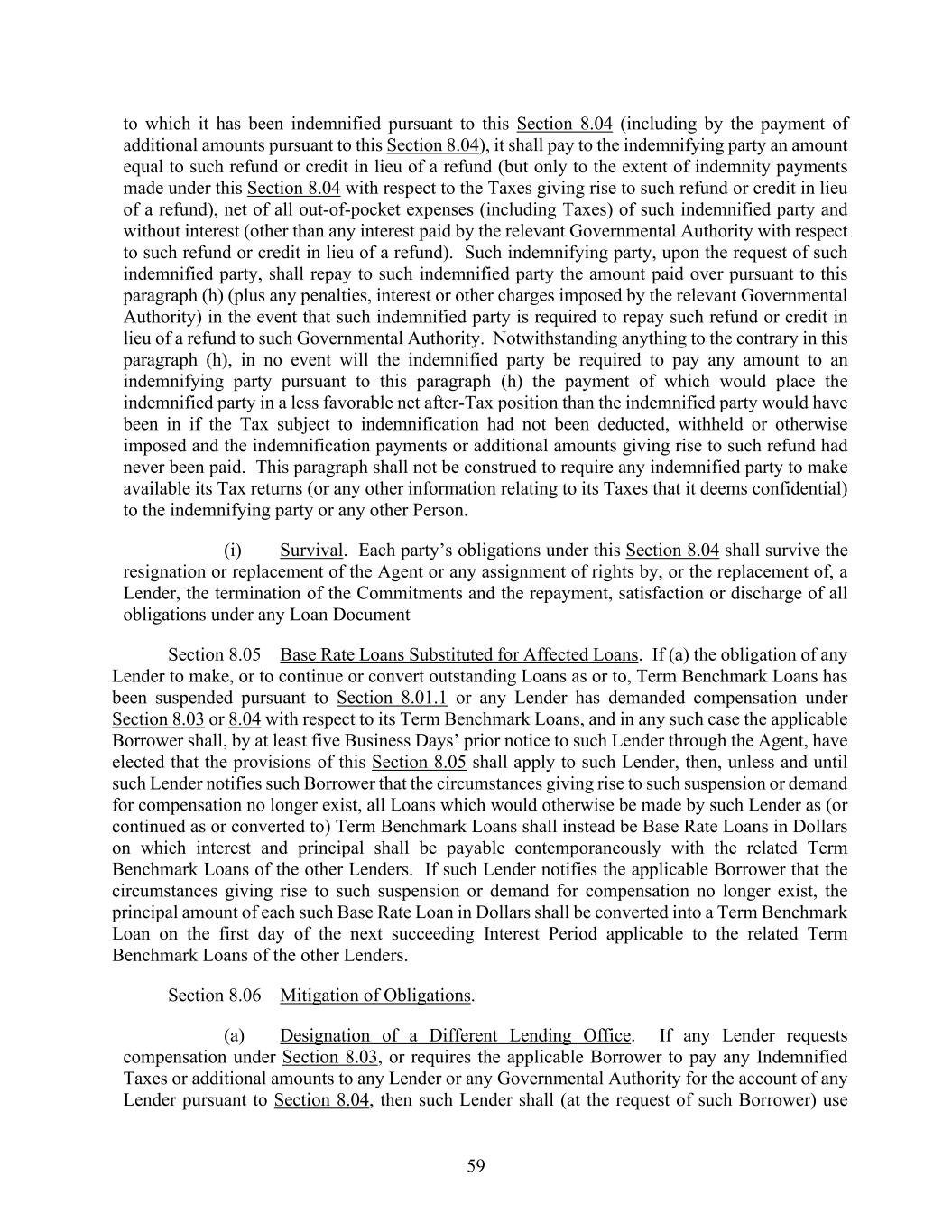59 to which it has been indemnified pursuant to this Section 8.04 (including by the payment of additional amounts pursuant to this Section 8.04), it shall pay to the indemnifying party an amount equal to such refund or credit in lieu of a refund (but only to the extent of indemnity payments made under this Section 8.04 with respect to the Taxes giving rise to such refund or credit in lieu of a refund), net of all out-of-pocket expenses (including Taxes) of such indemnified party and without interest (other than any interest paid by the relevant Governmental Authority with respect to such refund or credit in lieu of a refund). Such indemnifying party, upon the request of such indemnified party, shall repay to such indemnified party the amount paid over pursuant to this paragraph (h) (plus any penalties, interest or other charges imposed by the relevant Governmental Authority) in the event that such indemnified party is required to repay such refund or credit in lieu of a refund to such Governmental Authority. Notwithstanding anything to the contrary in this paragraph (h), in no event will the indemnified party be required to pay any amount to an indemnifying party pursuant to this paragraph (h) the payment of which would place the indemnified party in a less favorable net after-Tax position than the indemnified party would have been in if the Tax subject to indemnification had not been deducted, withheld or otherwise imposed and the indemnification payments or additional amounts giving rise to such refund had never been paid. This paragraph shall not be construed to require any indemnified party to make available its Tax returns (or any other information relating to its Taxes that it deems confidential) to the indemnifying party or any other Person. (i) Survival. Each party’s obligations under this Section 8.04 shall survive the resignation or replacement of the Agent or any assignment of rights by, or the replacement of, a Lender, the termination of the Commitments and the repayment, satisfaction or discharge of all obligations under any Loan Document Section 8.05 Base Rate Loans Substituted for Affected Loans. If (a) the obligation of any Lender to make, or to continue or convert outstanding Loans as or to, Term Benchmark Loans has been suspended pursuant to Section 8.01.1 or any Lender has demanded compensation under Section 8.03 or 8.04 with respect to its Term Benchmark Loans, and in any such case the applicable Borrower shall, by at least five Business Days’ prior notice to such Lender through the Agent, have elected that the provisions of this Section 8.05 shall apply to such Lender, then, unless and until such Lender notifies such Borrower that the circumstances giving rise to such suspension or demand for compensation no longer exist, all Loans which would otherwise be made by such Lender as (or continued as or converted to) Term Benchmark Loans shall instead be Base Rate Loans in Dollars on which interest and principal shall be payable contemporaneously with the related Term Benchmark Loans of the other Lenders. If such Lender notifies the applicable Borrower that the circumstances giving rise to such suspension or demand for compensation no longer exist, the principal amount of each such Base Rate Loan in Dollars shall be converted into a Term Benchmark Loan on the first day of the next succeeding Interest Period applicable to the related Term Benchmark Loans of the other Lenders. Section 8.06 Mitigation of Obligations. (a) Designation of a Different Lending Office. If any Lender requests compensation under Section 8.03, or requires the applicable Borrower to pay any Indemnified Taxes or additional amounts to any Lender or any Governmental Authority for the account of any Lender pursuant to Section 8.04, then such Lender shall (at the request of such Borrower) use
