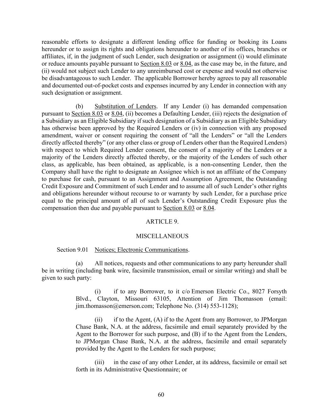 60 reasonable efforts to designate a different lending office for funding or booking its Loans hereunder or to assign its rights and obligations hereunder to another of its offices, branches or affiliates, if, in the judgment of such Lender, such designation or assignment (i) would eliminate or reduce amounts payable pursuant to Section 8.03 or 8.04, as the case may be, in the future, and (ii) would not subject such Lender to any unreimbursed cost or expense and would not otherwise be disadvantageous to such Lender. The applicable Borrower hereby agrees to pay all reasonable and documented out-of-pocket costs and expenses incurred by any Lender in connection with any such designation or assignment. (b) Substitution of Lenders. If any Lender (i) has demanded compensation pursuant to Section 8.03 or 8.04, (ii) becomes a Defaulting Lender, (iii) rejects the designation of a Subsidiary as an Eligible Subsidiary if such designation of a Subsidiary as an Eligible Subsidiary has otherwise been approved by the Required Lenders or (iv) in connection with any proposed amendment, waiver or consent requiring the consent of “all the Lenders” or “all the Lenders directly affected thereby” (or any other class or group of Lenders other than the Required Lenders) with respect to which Required Lender consent, the consent of a majority of the Lenders or a majority of the Lenders directly affected thereby, or the majority of the Lenders of such other class, as applicable, has been obtained, as applicable, is a non-consenting Lender, then the Company shall have the right to designate an Assignee which is not an affiliate of the Company to purchase for cash, pursuant to an Assignment and Assumption Agreement, the Outstanding Credit Exposure and Commitment of such Lender and to assume all of such Lender’s other rights and obligations hereunder without recourse to or warranty by such Lender, for a purchase price equal to the principal amount of all of such Lender’s Outstanding Credit Exposure plus the compensation then due and payable pursuant to Section 8.03 or 8.04. ARTICLE 9. MISCELLANEOUS Section 9.01 Notices; Electronic Communications. (a) All notices, requests and other communications to any party hereunder shall be in writing (including bank wire, facsimile transmission, email or similar writing) and shall be given to such party: (i) if to any Borrower, to it c/o Emerson Electric Co., 8027 Forsyth Blvd., Clayton, Missouri 63105, Attention of Jim Thomasson (email: jim.thomasson@emerson.com; Telephone No. (314) 553-1128); (ii) if to the Agent, (A) if to the Agent from any Borrower, to JPMorgan Chase Bank, N.A. at the address, facsimile and email separately provided by the Agent to the Borrower for such purpose, and (B) if to the Agent from the Lenders, to JPMorgan Chase Bank, N.A. at the address, facsimile and email separately provided by the Agent to the Lenders for such purpose; (iii) in the case of any other Lender, at its address, facsimile or email set forth in its Administrative Questionnaire; or
