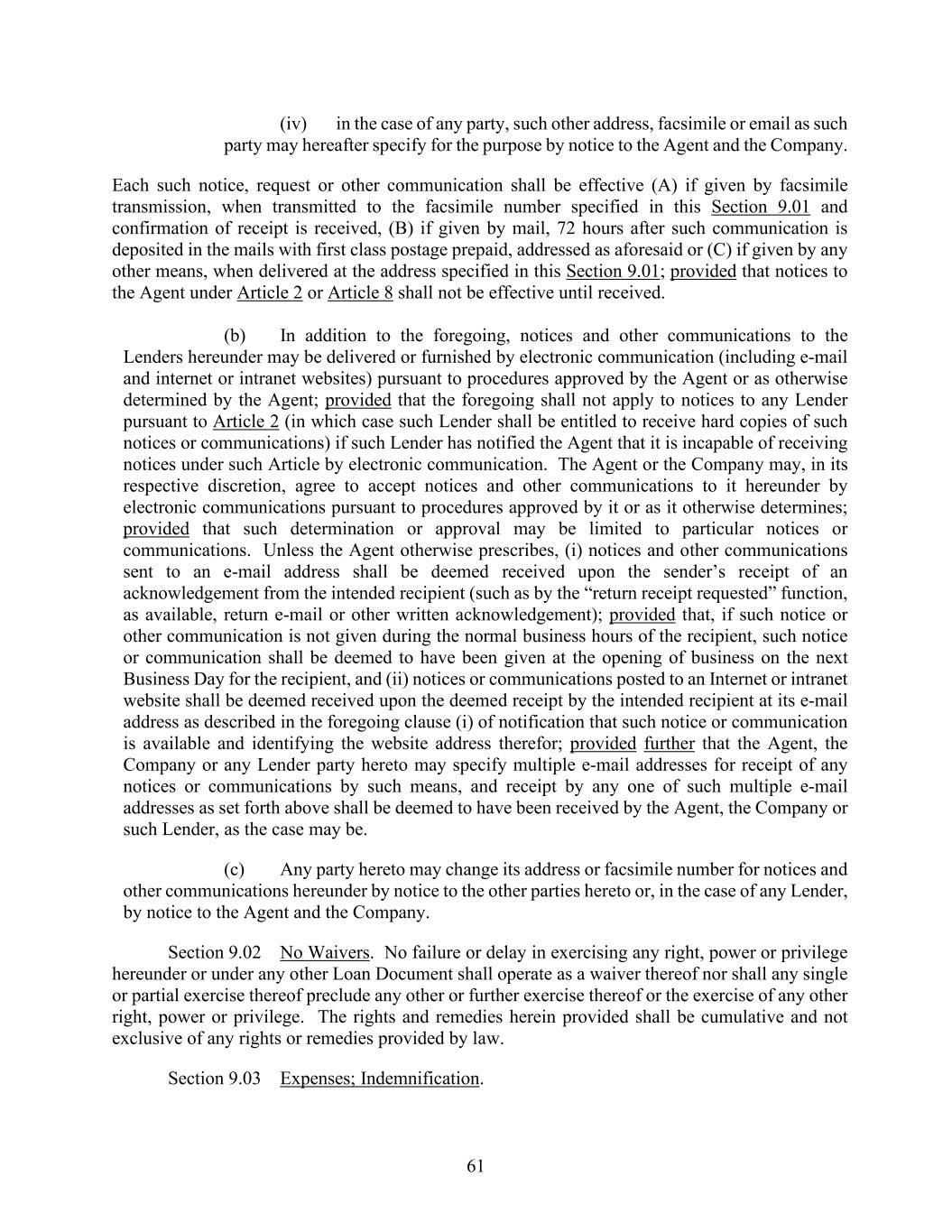 61 (iv) in the case of any party, such other address, facsimile or email as such party may hereafter specify for the purpose by notice to the Agent and the Company. Each such notice, request or other communication shall be effective (A) if given by facsimile transmission, when transmitted to the facsimile number specified in this Section 9.01 and confirmation of receipt is received, (B) if given by mail, 72 hours after such communication is deposited in the mails with first class postage prepaid, addressed as aforesaid or (C) if given by any other means, when delivered at the address specified in this Section 9.01; provided that notices to the Agent under Article 2 or Article 8 shall not be effective until received. (b) In addition to the foregoing, notices and other communications to the Lenders hereunder may be delivered or furnished by electronic communication (including e-mail and internet or intranet websites) pursuant to procedures approved by the Agent or as otherwise determined by the Agent; provided that the foregoing shall not apply to notices to any Lender pursuant to Article 2 (in which case such Lender shall be entitled to receive hard copies of such notices or communications) if such Lender has notified the Agent that it is incapable of receiving notices under such Article by electronic communication. The Agent or the Company may, in its respective discretion, agree to accept notices and other communications to it hereunder by electronic communications pursuant to procedures approved by it or as it otherwise determines; provided that such determination or approval may be limited to particular notices or communications. Unless the Agent otherwise prescribes, (i) notices and other communications sent to an e-mail address shall be deemed received upon the sender’s receipt of an acknowledgement from the intended recipient (such as by the “return receipt requested” function, as available, return e-mail or other written acknowledgement); provided that, if such notice or other communication is not given during the normal business hours of the recipient, such notice or communication shall be deemed to have been given at the opening of business on the next Business Day for the recipient, and (ii) notices or communications posted to an Internet or intranet website shall be deemed received upon the deemed receipt by the intended recipient at its e-mail address as described in the foregoing clause (i) of notification that such notice or communication is available and identifying the website address therefor; provided further that the Agent, the Company or any Lender party hereto may specify multiple e-mail addresses for receipt of any notices or communications by such means, and receipt by any one of such multiple e-mail addresses as set forth above shall be deemed to have been received by the Agent, the Company or such Lender, as the case may be. (c) Any party hereto may change its address or facsimile number for notices and other communications hereunder by notice to the other parties hereto or, in the case of any Lender, by notice to the Agent and the Company. Section 9.02 No Waivers. No failure or delay in exercising any right, power or privilege hereunder or under any other Loan Document shall operate as a waiver thereof nor shall any single or partial exercise thereof preclude any other or further exercise thereof or the exercise of any other right, power or privilege. The rights and remedies herein provided shall be cumulative and not exclusive of any rights or remedies provided by law. Section 9.03 Expenses; Indemnification.