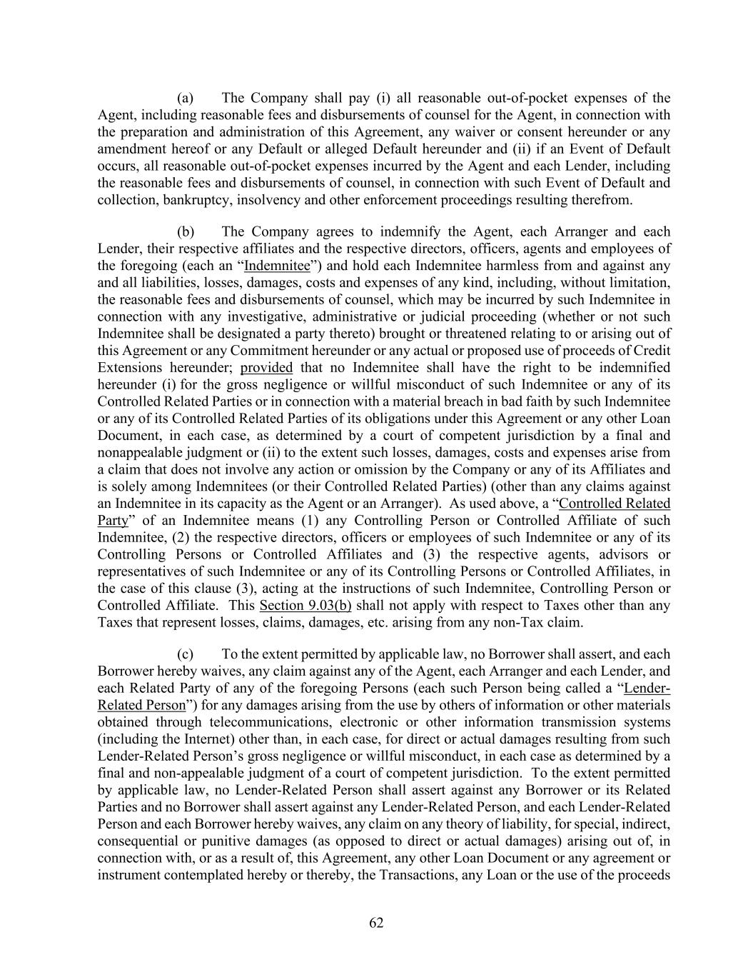 62 (a) The Company shall pay (i) all reasonable out-of-pocket expenses of the Agent, including reasonable fees and disbursements of counsel for the Agent, in connection with the preparation and administration of this Agreement, any waiver or consent hereunder or any amendment hereof or any Default or alleged Default hereunder and (ii) if an Event of Default occurs, all reasonable out-of-pocket expenses incurred by the Agent and each Lender, including the reasonable fees and disbursements of counsel, in connection with such Event of Default and collection, bankruptcy, insolvency and other enforcement proceedings resulting therefrom. (b) The Company agrees to indemnify the Agent, each Arranger and each Lender, their respective affiliates and the respective directors, officers, agents and employees of the foregoing (each an “Indemnitee”) and hold each Indemnitee harmless from and against any and all liabilities, losses, damages, costs and expenses of any kind, including, without limitation, the reasonable fees and disbursements of counsel, which may be incurred by such Indemnitee in connection with any investigative, administrative or judicial proceeding (whether or not such Indemnitee shall be designated a party thereto) brought or threatened relating to or arising out of this Agreement or any Commitment hereunder or any actual or proposed use of proceeds of Credit Extensions hereunder; provided that no Indemnitee shall have the right to be indemnified hereunder (i) for the gross negligence or willful misconduct of such Indemnitee or any of its Controlled Related Parties or in connection with a material breach in bad faith by such Indemnitee or any of its Controlled Related Parties of its obligations under this Agreement or any other Loan Document, in each case, as determined by a court of competent jurisdiction by a final and nonappealable judgment or (ii) to the extent such losses, damages, costs and expenses arise from a claim that does not involve any action or omission by the Company or any of its Affiliates and is solely among Indemnitees (or their Controlled Related Parties) (other than any claims against an Indemnitee in its capacity as the Agent or an Arranger). As used above, a “Controlled Related Party” of an Indemnitee means (1) any Controlling Person or Controlled Affiliate of such Indemnitee, (2) the respective directors, officers or employees of such Indemnitee or any of its Controlling Persons or Controlled Affiliates and (3) the respective agents, advisors or representatives of such Indemnitee or any of its Controlling Persons or Controlled Affiliates, in the case of this clause (3), acting at the instructions of such Indemnitee, Controlling Person or Controlled Affiliate. This Section 9.03(b) shall not apply with respect to Taxes other than any Taxes that represent losses, claims, damages, etc. arising from any non-Tax claim. (c) To the extent permitted by applicable law, no Borrower shall assert, and each Borrower hereby waives, any claim against any of the Agent, each Arranger and each Lender, and each Related Party of any of the foregoing Persons (each such Person being called a “Lender- Related Person”) for any damages arising from the use by others of information or other materials obtained through telecommunications, electronic or other information transmission systems (including the Internet) other than, in each case, for direct or actual damages resulting from such Lender-Related Person’s gross negligence or willful misconduct, in each case as determined by a final and non-appealable judgment of a court of competent jurisdiction. To the extent permitted by applicable law, no Lender-Related Person shall assert against any Borrower or its Related Parties and no Borrower shall assert against any Lender-Related Person, and each Lender-Related Person and each Borrower hereby waives, any claim on any theory of liability, for special, indirect, consequential or punitive damages (as opposed to direct or actual damages) arising out of, in connection with, or as a result of, this Agreement, any other Loan Document or any agreement or instrument contemplated hereby or thereby, the Transactions, any Loan or the use of the proceeds