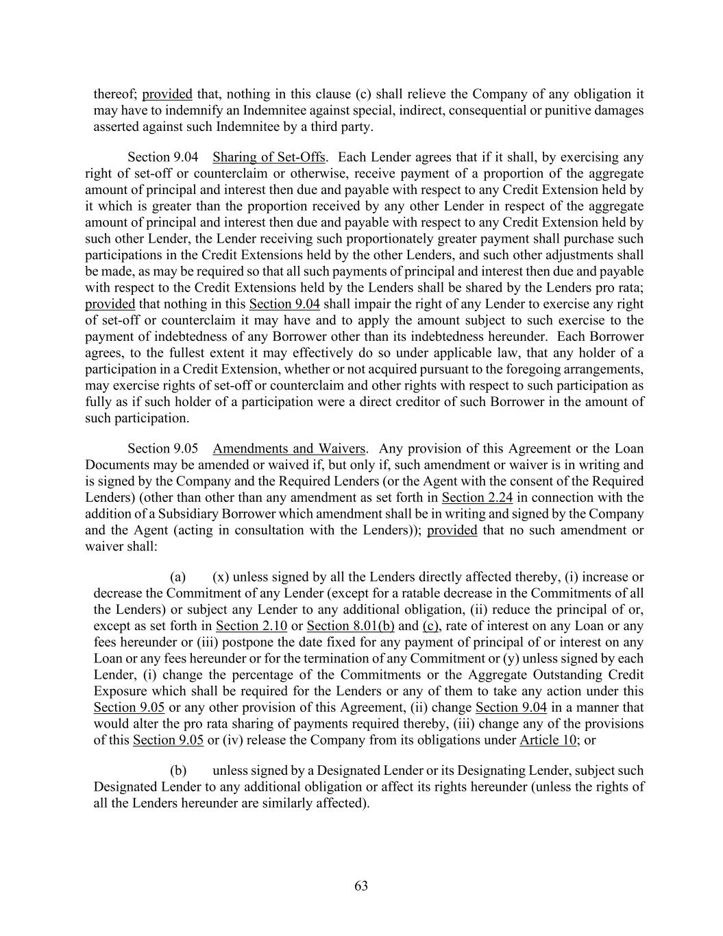 63 thereof; provided that, nothing in this clause (c) shall relieve the Company of any obligation it may have to indemnify an Indemnitee against special, indirect, consequential or punitive damages asserted against such Indemnitee by a third party. Section 9.04 Sharing of Set-Offs. Each Lender agrees that if it shall, by exercising any right of set-off or counterclaim or otherwise, receive payment of a proportion of the aggregate amount of principal and interest then due and payable with respect to any Credit Extension held by it which is greater than the proportion received by any other Lender in respect of the aggregate amount of principal and interest then due and payable with respect to any Credit Extension held by such other Lender, the Lender receiving such proportionately greater payment shall purchase such participations in the Credit Extensions held by the other Lenders, and such other adjustments shall be made, as may be required so that all such payments of principal and interest then due and payable with respect to the Credit Extensions held by the Lenders shall be shared by the Lenders pro rata; provided that nothing in this Section 9.04 shall impair the right of any Lender to exercise any right of set-off or counterclaim it may have and to apply the amount subject to such exercise to the payment of indebtedness of any Borrower other than its indebtedness hereunder. Each Borrower agrees, to the fullest extent it may effectively do so under applicable law, that any holder of a participation in a Credit Extension, whether or not acquired pursuant to the foregoing arrangements, may exercise rights of set-off or counterclaim and other rights with respect to such participation as fully as if such holder of a participation were a direct creditor of such Borrower in the amount of such participation. Section 9.05 Amendments and Waivers. Any provision of this Agreement or the Loan Documents may be amended or waived if, but only if, such amendment or waiver is in writing and is signed by the Company and the Required Lenders (or the Agent with the consent of the Required Lenders) (other than other than any amendment as set forth in Section 2.24 in connection with the addition of a Subsidiary Borrower which amendment shall be in writing and signed by the Company and the Agent (acting in consultation with the Lenders)); provided that no such amendment or waiver shall: (a) (x) unless signed by all the Lenders directly affected thereby, (i) increase or decrease the Commitment of any Lender (except for a ratable decrease in the Commitments of all the Lenders) or subject any Lender to any additional obligation, (ii) reduce the principal of or, except as set forth in Section 2.10 or Section 8.01(b) and (c), rate of interest on any Loan or any fees hereunder or (iii) postpone the date fixed for any payment of principal of or interest on any Loan or any fees hereunder or for the termination of any Commitment or (y) unless signed by each Lender, (i) change the percentage of the Commitments or the Aggregate Outstanding Credit Exposure which shall be required for the Lenders or any of them to take any action under this Section 9.05 or any other provision of this Agreement, (ii) change Section 9.04 in a manner that would alter the pro rata sharing of payments required thereby, (iii) change any of the provisions of this Section 9.05 or (iv) release the Company from its obligations under Article 10; or (b) unless signed by a Designated Lender or its Designating Lender, subject such Designated Lender to any additional obligation or affect its rights hereunder (unless the rights of all the Lenders hereunder are similarly affected).