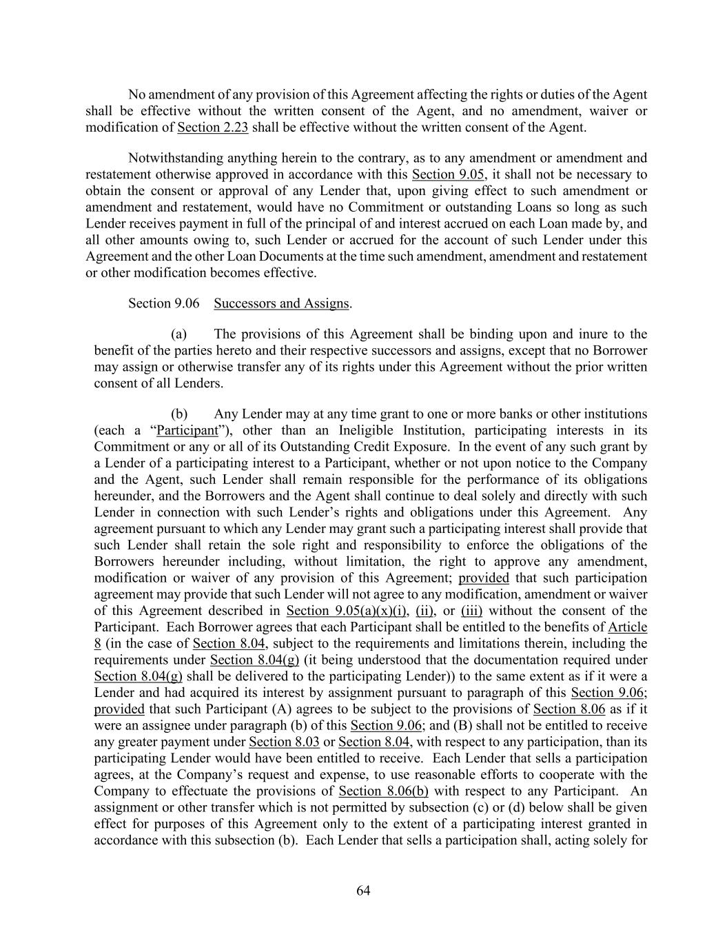 64 No amendment of any provision of this Agreement affecting the rights or duties of the Agent shall be effective without the written consent of the Agent, and no amendment, waiver or modification of Section 2.23 shall be effective without the written consent of the Agent. Notwithstanding anything herein to the contrary, as to any amendment or amendment and restatement otherwise approved in accordance with this Section 9.05, it shall not be necessary to obtain the consent or approval of any Lender that, upon giving effect to such amendment or amendment and restatement, would have no Commitment or outstanding Loans so long as such Lender receives payment in full of the principal of and interest accrued on each Loan made by, and all other amounts owing to, such Lender or accrued for the account of such Lender under this Agreement and the other Loan Documents at the time such amendment, amendment and restatement or other modification becomes effective. Section 9.06 Successors and Assigns. (a) The provisions of this Agreement shall be binding upon and inure to the benefit of the parties hereto and their respective successors and assigns, except that no Borrower may assign or otherwise transfer any of its rights under this Agreement without the prior written consent of all Lenders. (b) Any Lender may at any time grant to one or more banks or other institutions (each a “Participant”), other than an Ineligible Institution, participating interests in its Commitment or any or all of its Outstanding Credit Exposure. In the event of any such grant by a Lender of a participating interest to a Participant, whether or not upon notice to the Company and the Agent, such Lender shall remain responsible for the performance of its obligations hereunder, and the Borrowers and the Agent shall continue to deal solely and directly with such Lender in connection with such Lender’s rights and obligations under this Agreement. Any agreement pursuant to which any Lender may grant such a participating interest shall provide that such Lender shall retain the sole right and responsibility to enforce the obligations of the Borrowers hereunder including, without limitation, the right to approve any amendment, modification or waiver of any provision of this Agreement; provided that such participation agreement may provide that such Lender will not agree to any modification, amendment or waiver of this Agreement described in Section 9.05(a)(x)(i), (ii), or (iii) without the consent of the Participant. Each Borrower agrees that each Participant shall be entitled to the benefits of Article 8 (in the case of Section 8.04, subject to the requirements and limitations therein, including the requirements under Section 8.04(g) (it being understood that the documentation required under Section 8.04(g) shall be delivered to the participating Lender)) to the same extent as if it were a Lender and had acquired its interest by assignment pursuant to paragraph of this Section 9.06; provided that such Participant (A) agrees to be subject to the provisions of Section 8.06 as if it were an assignee under paragraph (b) of this Section 9.06; and (B) shall not be entitled to receive any greater payment under Section 8.03 or Section 8.04, with respect to any participation, than its participating Lender would have been entitled to receive. Each Lender that sells a participation agrees, at the Company’s request and expense, to use reasonable efforts to cooperate with the Company to effectuate the provisions of Section 8.06(b) with respect to any Participant. An assignment or other transfer which is not permitted by subsection (c) or (d) below shall be given effect for purposes of this Agreement only to the extent of a participating interest granted in accordance with this subsection (b). Each Lender that sells a participation shall, acting solely for