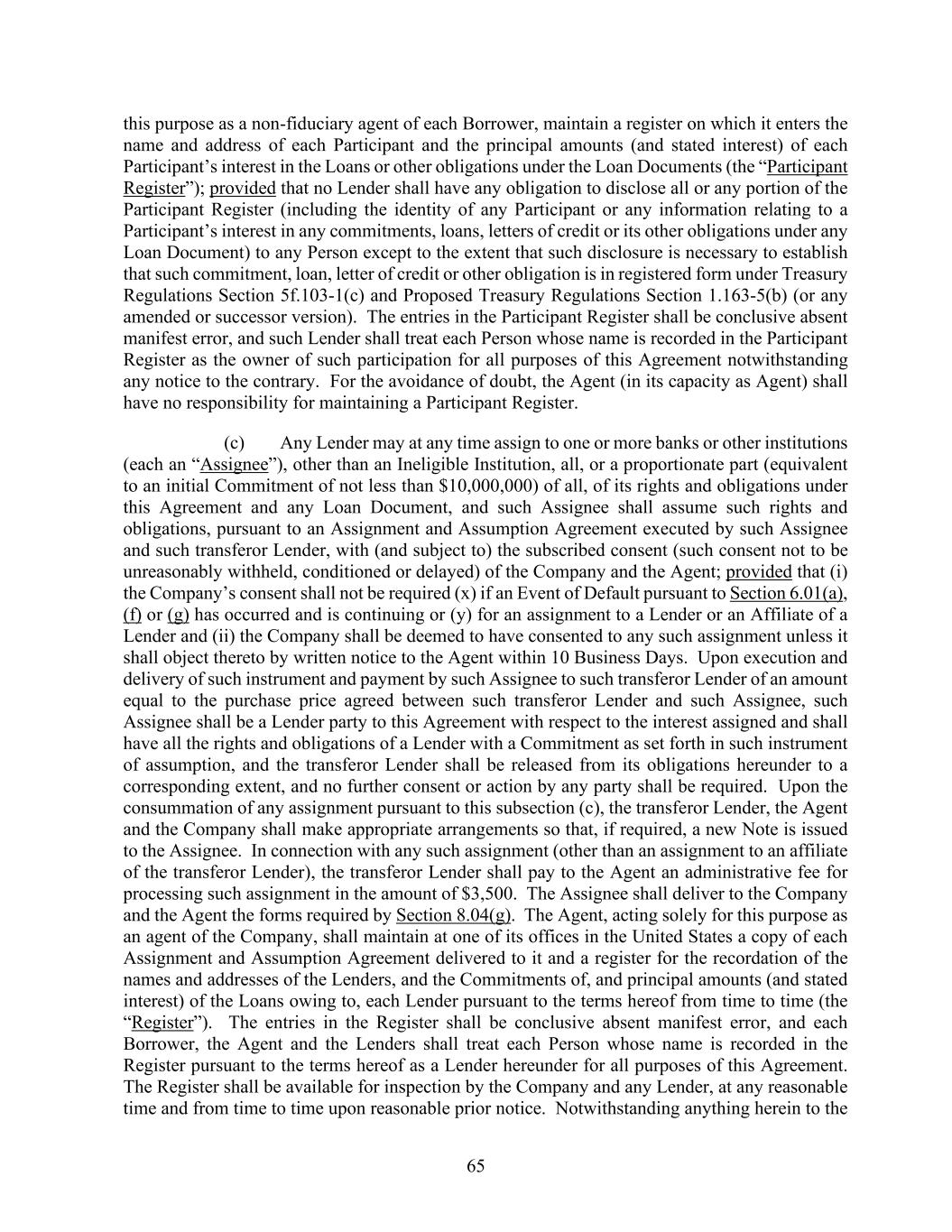65 this purpose as a non-fiduciary agent of each Borrower, maintain a register on which it enters the name and address of each Participant and the principal amounts (and stated interest) of each Participant’s interest in the Loans or other obligations under the Loan Documents (the “Participant Register”); provided that no Lender shall have any obligation to disclose all or any portion of the Participant Register (including the identity of any Participant or any information relating to a Participant’s interest in any commitments, loans, letters of credit or its other obligations under any Loan Document) to any Person except to the extent that such disclosure is necessary to establish that such commitment, loan, letter of credit or other obligation is in registered form under Treasury Regulations Section 5f.103-1(c) and Proposed Treasury Regulations Section 1.163-5(b) (or any amended or successor version). The entries in the Participant Register shall be conclusive absent manifest error, and such Lender shall treat each Person whose name is recorded in the Participant Register as the owner of such participation for all purposes of this Agreement notwithstanding any notice to the contrary. For the avoidance of doubt, the Agent (in its capacity as Agent) shall have no responsibility for maintaining a Participant Register. (c) Any Lender may at any time assign to one or more banks or other institutions (each an “Assignee”), other than an Ineligible Institution, all, or a proportionate part (equivalent to an initial Commitment of not less than $10,000,000) of all, of its rights and obligations under this Agreement and any Loan Document, and such Assignee shall assume such rights and obligations, pursuant to an Assignment and Assumption Agreement executed by such Assignee and such transferor Lender, with (and subject to) the subscribed consent (such consent not to be unreasonably withheld, conditioned or delayed) of the Company and the Agent; provided that (i) the Company’s consent shall not be required (x) if an Event of Default pursuant to Section 6.01(a), (f) or (g) has occurred and is continuing or (y) for an assignment to a Lender or an Affiliate of a Lender and (ii) the Company shall be deemed to have consented to any such assignment unless it shall object thereto by written notice to the Agent within 10 Business Days. Upon execution and delivery of such instrument and payment by such Assignee to such transferor Lender of an amount equal to the purchase price agreed between such transferor Lender and such Assignee, such Assignee shall be a Lender party to this Agreement with respect to the interest assigned and shall have all the rights and obligations of a Lender with a Commitment as set forth in such instrument of assumption, and the transferor Lender shall be released from its obligations hereunder to a corresponding extent, and no further consent or action by any party shall be required. Upon the consummation of any assignment pursuant to this subsection (c), the transferor Lender, the Agent and the Company shall make appropriate arrangements so that, if required, a new Note is issued to the Assignee. In connection with any such assignment (other than an assignment to an affiliate of the transferor Lender), the transferor Lender shall pay to the Agent an administrative fee for processing such assignment in the amount of $3,500. The Assignee shall deliver to the Company and the Agent the forms required by Section 8.04(g). The Agent, acting solely for this purpose as an agent of the Company, shall maintain at one of its offices in the United States a copy of each Assignment and Assumption Agreement delivered to it and a register for the recordation of the names and addresses of the Lenders, and the Commitments of, and principal amounts (and stated interest) of the Loans owing to, each Lender pursuant to the terms hereof from time to time (the “Register”). The entries in the Register shall be conclusive absent manifest error, and each Borrower, the Agent and the Lenders shall treat each Person whose name is recorded in the Register pursuant to the terms hereof as a Lender hereunder for all purposes of this Agreement. The Register shall be available for inspection by the Company and any Lender, at any reasonable time and from time to time upon reasonable prior notice. Notwithstanding anything herein to the