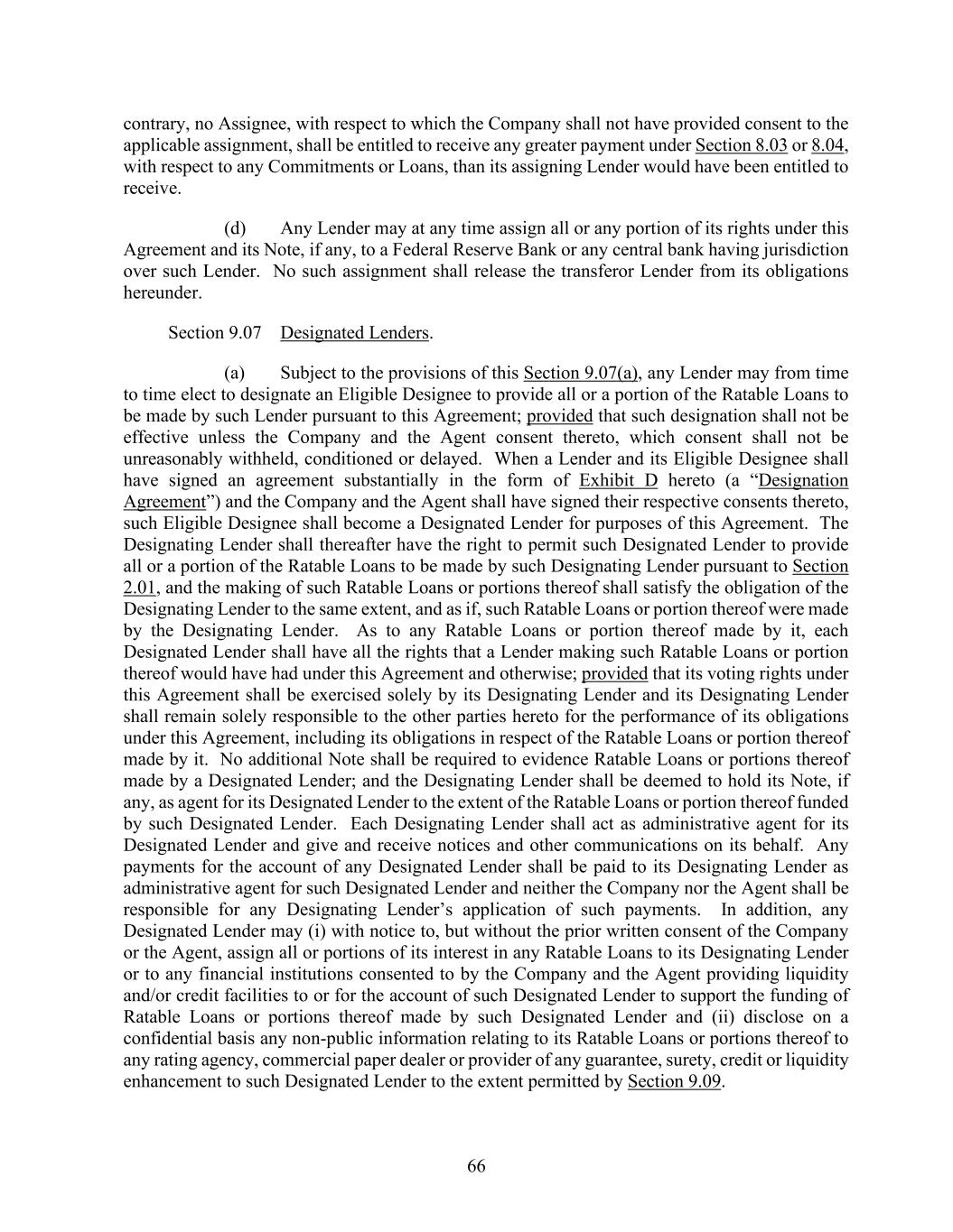 66 contrary, no Assignee, with respect to which the Company shall not have provided consent to the applicable assignment, shall be entitled to receive any greater payment under Section 8.03 or 8.04, with respect to any Commitments or Loans, than its assigning Lender would have been entitled to receive. (d) Any Lender may at any time assign all or any portion of its rights under this Agreement and its Note, if any, to a Federal Reserve Bank or any central bank having jurisdiction over such Lender. No such assignment shall release the transferor Lender from its obligations hereunder. Section 9.07 Designated Lenders. (a) Subject to the provisions of this Section 9.07(a), any Lender may from time to time elect to designate an Eligible Designee to provide all or a portion of the Ratable Loans to be made by such Lender pursuant to this Agreement; provided that such designation shall not be effective unless the Company and the Agent consent thereto, which consent shall not be unreasonably withheld, conditioned or delayed. When a Lender and its Eligible Designee shall have signed an agreement substantially in the form of Exhibit D hereto (a “Designation Agreement”) and the Company and the Agent shall have signed their respective consents thereto, such Eligible Designee shall become a Designated Lender for purposes of this Agreement. The Designating Lender shall thereafter have the right to permit such Designated Lender to provide all or a portion of the Ratable Loans to be made by such Designating Lender pursuant to Section 2.01, and the making of such Ratable Loans or portions thereof shall satisfy the obligation of the Designating Lender to the same extent, and as if, such Ratable Loans or portion thereof were made by the Designating Lender. As to any Ratable Loans or portion thereof made by it, each Designated Lender shall have all the rights that a Lender making such Ratable Loans or portion thereof would have had under this Agreement and otherwise; provided that its voting rights under this Agreement shall be exercised solely by its Designating Lender and its Designating Lender shall remain solely responsible to the other parties hereto for the performance of its obligations under this Agreement, including its obligations in respect of the Ratable Loans or portion thereof made by it. No additional Note shall be required to evidence Ratable Loans or portions thereof made by a Designated Lender; and the Designating Lender shall be deemed to hold its Note, if any, as agent for its Designated Lender to the extent of the Ratable Loans or portion thereof funded by such Designated Lender. Each Designating Lender shall act as administrative agent for its Designated Lender and give and receive notices and other communications on its behalf. Any payments for the account of any Designated Lender shall be paid to its Designating Lender as administrative agent for such Designated Lender and neither the Company nor the Agent shall be responsible for any Designating Lender’s application of such payments. In addition, any Designated Lender may (i) with notice to, but without the prior written consent of the Company or the Agent, assign all or portions of its interest in any Ratable Loans to its Designating Lender or to any financial institutions consented to by the Company and the Agent providing liquidity and/or credit facilities to or for the account of such Designated Lender to support the funding of Ratable Loans or portions thereof made by such Designated Lender and (ii) disclose on a confidential basis any non-public information relating to its Ratable Loans or portions thereof to any rating agency, commercial paper dealer or provider of any guarantee, surety, credit or liquidity enhancement to such Designated Lender to the extent permitted by Section 9.09.