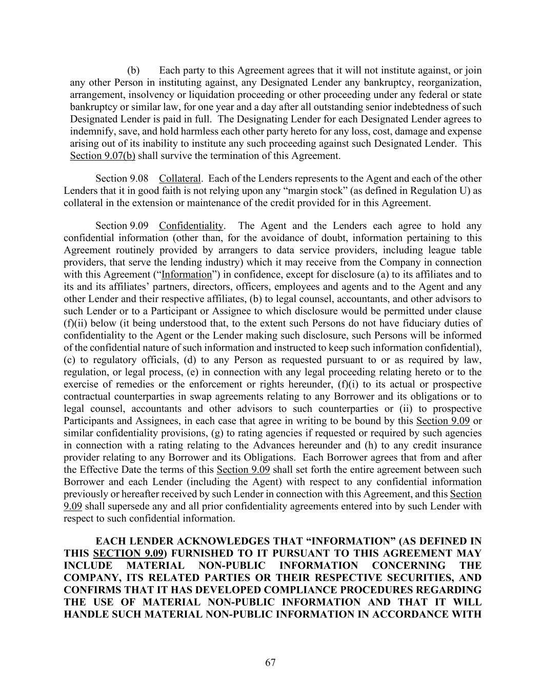 67 (b) Each party to this Agreement agrees that it will not institute against, or join any other Person in instituting against, any Designated Lender any bankruptcy, reorganization, arrangement, insolvency or liquidation proceeding or other proceeding under any federal or state bankruptcy or similar law, for one year and a day after all outstanding senior indebtedness of such Designated Lender is paid in full. The Designating Lender for each Designated Lender agrees to indemnify, save, and hold harmless each other party hereto for any loss, cost, damage and expense arising out of its inability to institute any such proceeding against such Designated Lender. This Section 9.07(b) shall survive the termination of this Agreement. Section 9.08 Collateral. Each of the Lenders represents to the Agent and each of the other Lenders that it in good faith is not relying upon any “margin stock” (as defined in Regulation U) as collateral in the extension or maintenance of the credit provided for in this Agreement. Section 9.09 Confidentiality. The Agent and the Lenders each agree to hold any confidential information (other than, for the avoidance of doubt, information pertaining to this Agreement routinely provided by arrangers to data service providers, including league table providers, that serve the lending industry) which it may receive from the Company in connection with this Agreement (“Information”) in confidence, except for disclosure (a) to its affiliates and to its and its affiliates’ partners, directors, officers, employees and agents and to the Agent and any other Lender and their respective affiliates, (b) to legal counsel, accountants, and other advisors to such Lender or to a Participant or Assignee to which disclosure would be permitted under clause (f)(ii) below (it being understood that, to the extent such Persons do not have fiduciary duties of confidentiality to the Agent or the Lender making such disclosure, such Persons will be informed of the confidential nature of such information and instructed to keep such information confidential), (c) to regulatory officials, (d) to any Person as requested pursuant to or as required by law, regulation, or legal process, (e) in connection with any legal proceeding relating hereto or to the exercise of remedies or the enforcement or rights hereunder, (f)(i) to its actual or prospective contractual counterparties in swap agreements relating to any Borrower and its obligations or to legal counsel, accountants and other advisors to such counterparties or (ii) to prospective Participants and Assignees, in each case that agree in writing to be bound by this Section 9.09 or similar confidentiality provisions, (g) to rating agencies if requested or required by such agencies in connection with a rating relating to the Advances hereunder and (h) to any credit insurance provider relating to any Borrower and its Obligations. Each Borrower agrees that from and after the Effective Date the terms of this Section 9.09 shall set forth the entire agreement between such Borrower and each Lender (including the Agent) with respect to any confidential information previously or hereafter received by such Lender in connection with this Agreement, and this Section 9.09 shall supersede any and all prior confidentiality agreements entered into by such Lender with respect to such confidential information. EACH LENDER ACKNOWLEDGES THAT “INFORMATION” (AS DEFINED IN THIS SECTION 9.09) FURNISHED TO IT PURSUANT TO THIS AGREEMENT MAY INCLUDE MATERIAL NON-PUBLIC INFORMATION CONCERNING THE COMPANY, ITS RELATED PARTIES OR THEIR RESPECTIVE SECURITIES, AND CONFIRMS THAT IT HAS DEVELOPED COMPLIANCE PROCEDURES REGARDING THE USE OF MATERIAL NON-PUBLIC INFORMATION AND THAT IT WILL HANDLE SUCH MATERIAL NON-PUBLIC INFORMATION IN ACCORDANCE WITH
