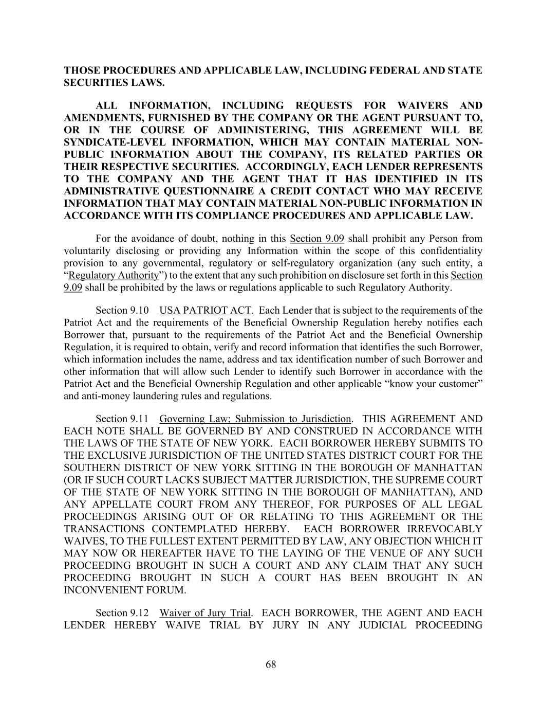 68 THOSE PROCEDURES AND APPLICABLE LAW, INCLUDING FEDERAL AND STATE SECURITIES LAWS. ALL INFORMATION, INCLUDING REQUESTS FOR WAIVERS AND AMENDMENTS, FURNISHED BY THE COMPANY OR THE AGENT PURSUANT TO, OR IN THE COURSE OF ADMINISTERING, THIS AGREEMENT WILL BE SYNDICATE-LEVEL INFORMATION, WHICH MAY CONTAIN MATERIAL NON- PUBLIC INFORMATION ABOUT THE COMPANY, ITS RELATED PARTIES OR THEIR RESPECTIVE SECURITIES. ACCORDINGLY, EACH LENDER REPRESENTS TO THE COMPANY AND THE AGENT THAT IT HAS IDENTIFIED IN ITS ADMINISTRATIVE QUESTIONNAIRE A CREDIT CONTACT WHO MAY RECEIVE INFORMATION THAT MAY CONTAIN MATERIAL NON-PUBLIC INFORMATION IN ACCORDANCE WITH ITS COMPLIANCE PROCEDURES AND APPLICABLE LAW. For the avoidance of doubt, nothing in this Section 9.09 shall prohibit any Person from voluntarily disclosing or providing any Information within the scope of this confidentiality provision to any governmental, regulatory or self-regulatory organization (any such entity, a “Regulatory Authority”) to the extent that any such prohibition on disclosure set forth in this Section 9.09 shall be prohibited by the laws or regulations applicable to such Regulatory Authority. Section 9.10 USA PATRIOT ACT. Each Lender that is subject to the requirements of the Patriot Act and the requirements of the Beneficial Ownership Regulation hereby notifies each Borrower that, pursuant to the requirements of the Patriot Act and the Beneficial Ownership Regulation, it is required to obtain, verify and record information that identifies the such Borrower, which information includes the name, address and tax identification number of such Borrower and other information that will allow such Lender to identify such Borrower in accordance with the Patriot Act and the Beneficial Ownership Regulation and other applicable “know your customer” and anti-money laundering rules and regulations. Section 9.11 Governing Law; Submission to Jurisdiction. THIS AGREEMENT AND EACH NOTE SHALL BE GOVERNED BY AND CONSTRUED IN ACCORDANCE WITH THE LAWS OF THE STATE OF NEW YORK. EACH BORROWER HEREBY SUBMITS TO THE EXCLUSIVE JURISDICTION OF THE UNITED STATES DISTRICT COURT FOR THE SOUTHERN DISTRICT OF NEW YORK SITTING IN THE BOROUGH OF MANHATTAN (OR IF SUCH COURT LACKS SUBJECT MATTER JURISDICTION, THE SUPREME COURT OF THE STATE OF NEW YORK SITTING IN THE BOROUGH OF MANHATTAN), AND ANY APPELLATE COURT FROM ANY THEREOF, FOR PURPOSES OF ALL LEGAL PROCEEDINGS ARISING OUT OF OR RELATING TO THIS AGREEMENT OR THE TRANSACTIONS CONTEMPLATED HEREBY. EACH BORROWER IRREVOCABLY WAIVES, TO THE FULLEST EXTENT PERMITTED BY LAW, ANY OBJECTION WHICH IT MAY NOW OR HEREAFTER HAVE TO THE LAYING OF THE VENUE OF ANY SUCH PROCEEDING BROUGHT IN SUCH A COURT AND ANY CLAIM THAT ANY SUCH PROCEEDING BROUGHT IN SUCH A COURT HAS BEEN BROUGHT IN AN INCONVENIENT FORUM. Section 9.12 Waiver of Jury Trial. EACH BORROWER, THE AGENT AND EACH LENDER HEREBY WAIVE TRIAL BY JURY IN ANY JUDICIAL PROCEEDING