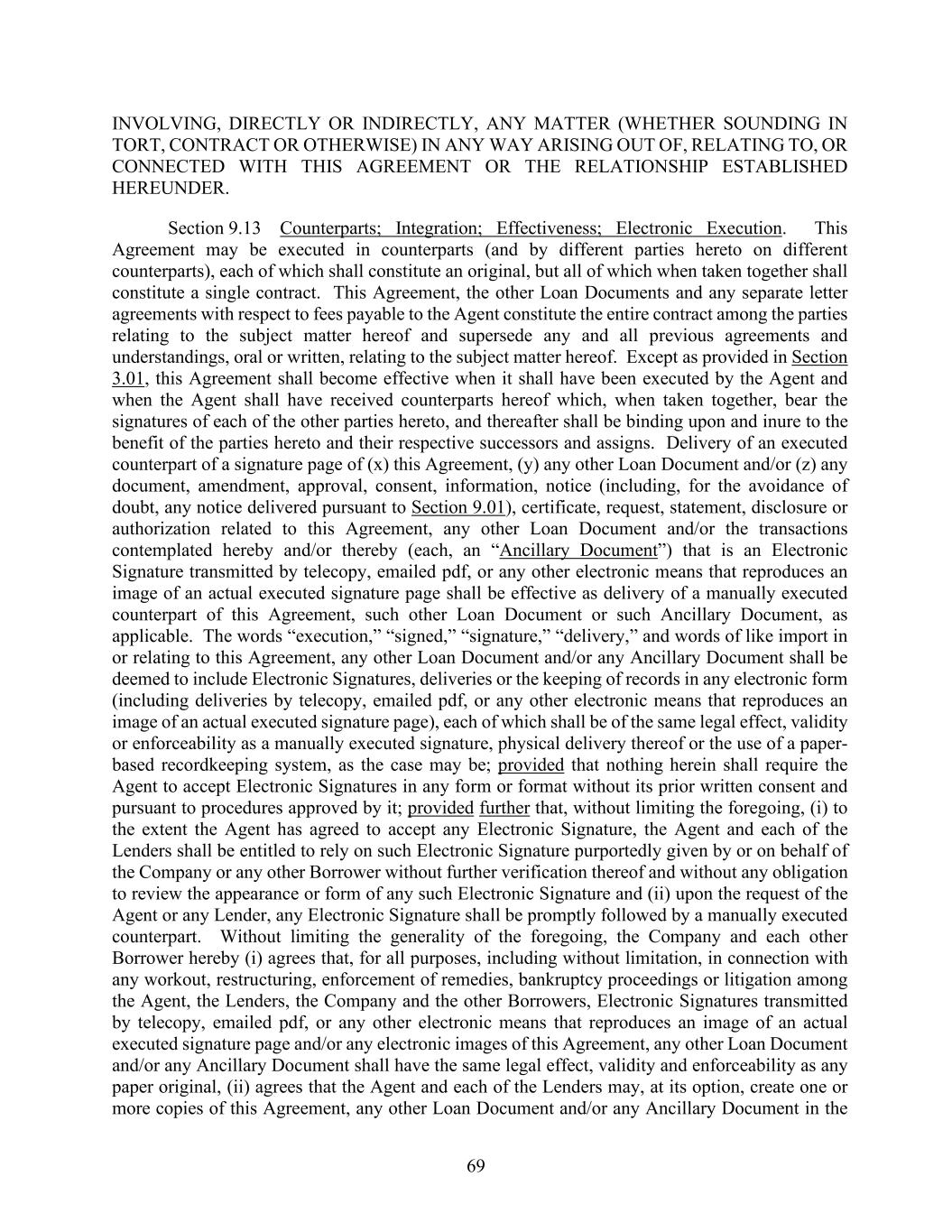 69 INVOLVING, DIRECTLY OR INDIRECTLY, ANY MATTER (WHETHER SOUNDING IN TORT, CONTRACT OR OTHERWISE) IN ANY WAY ARISING OUT OF, RELATING TO, OR CONNECTED WITH THIS AGREEMENT OR THE RELATIONSHIP ESTABLISHED HEREUNDER. Section 9.13 Counterparts; Integration; Effectiveness; Electronic Execution. This Agreement may be executed in counterparts (and by different parties hereto on different counterparts), each of which shall constitute an original, but all of which when taken together shall constitute a single contract. This Agreement, the other Loan Documents and any separate letter agreements with respect to fees payable to the Agent constitute the entire contract among the parties relating to the subject matter hereof and supersede any and all previous agreements and understandings, oral or written, relating to the subject matter hereof. Except as provided in Section 3.01, this Agreement shall become effective when it shall have been executed by the Agent and when the Agent shall have received counterparts hereof which, when taken together, bear the signatures of each of the other parties hereto, and thereafter shall be binding upon and inure to the benefit of the parties hereto and their respective successors and assigns. Delivery of an executed counterpart of a signature page of (x) this Agreement, (y) any other Loan Document and/or (z) any document, amendment, approval, consent, information, notice (including, for the avoidance of doubt, any notice delivered pursuant to Section 9.01), certificate, request, statement, disclosure or authorization related to this Agreement, any other Loan Document and/or the transactions contemplated hereby and/or thereby (each, an “Ancillary Document”) that is an Electronic Signature transmitted by telecopy, emailed pdf, or any other electronic means that reproduces an image of an actual executed signature page shall be effective as delivery of a manually executed counterpart of this Agreement, such other Loan Document or such Ancillary Document, as applicable. The words “execution,” “signed,” “signature,” “delivery,” and words of like import in or relating to this Agreement, any other Loan Document and/or any Ancillary Document shall be deemed to include Electronic Signatures, deliveries or the keeping of records in any electronic form (including deliveries by telecopy, emailed pdf, or any other electronic means that reproduces an image of an actual executed signature page), each of which shall be of the same legal effect, validity or enforceability as a manually executed signature, physical delivery thereof or the use of a paper- based recordkeeping system, as the case may be; provided that nothing herein shall require the Agent to accept Electronic Signatures in any form or format without its prior written consent and pursuant to procedures approved by it; provided further that, without limiting the foregoing, (i) to the extent the Agent has agreed to accept any Electronic Signature, the Agent and each of the Lenders shall be entitled to rely on such Electronic Signature purportedly given by or on behalf of the Company or any other Borrower without further verification thereof and without any obligation to review the appearance or form of any such Electronic Signature and (ii) upon the request of the Agent or any Lender, any Electronic Signature shall be promptly followed by a manually executed counterpart. Without limiting the generality of the foregoing, the Company and each other Borrower hereby (i) agrees that, for all purposes, including without limitation, in connection with any workout, restructuring, enforcement of remedies, bankruptcy proceedings or litigation among the Agent, the Lenders, the Company and the other Borrowers, Electronic Signatures transmitted by telecopy, emailed pdf, or any other electronic means that reproduces an image of an actual executed signature page and/or any electronic images of this Agreement, any other Loan Document and/or any Ancillary Document shall have the same legal effect, validity and enforceability as any paper original, (ii) agrees that the Agent and each of the Lenders may, at its option, create one or more copies of this Agreement, any other Loan Document and/or any Ancillary Document in the